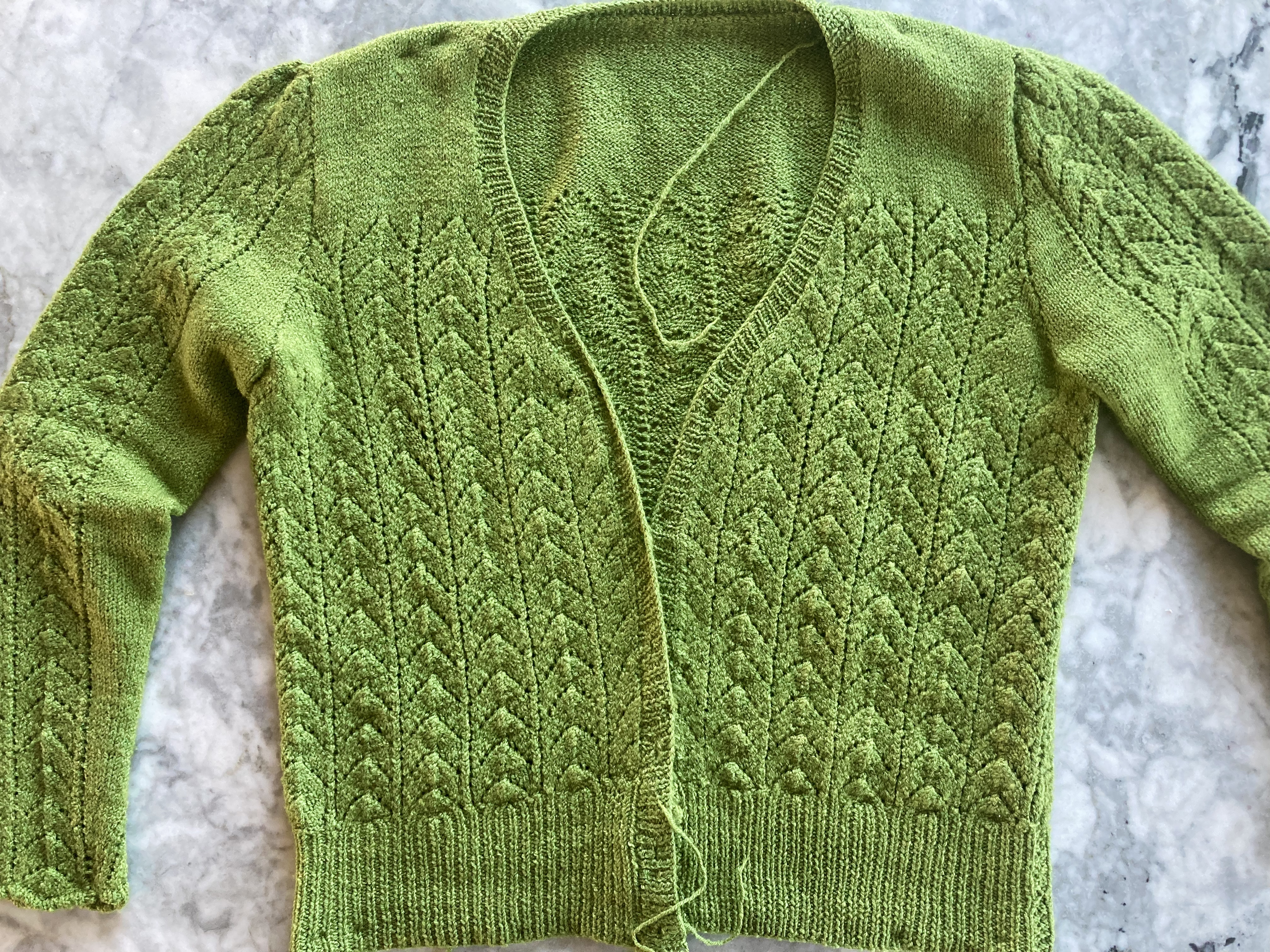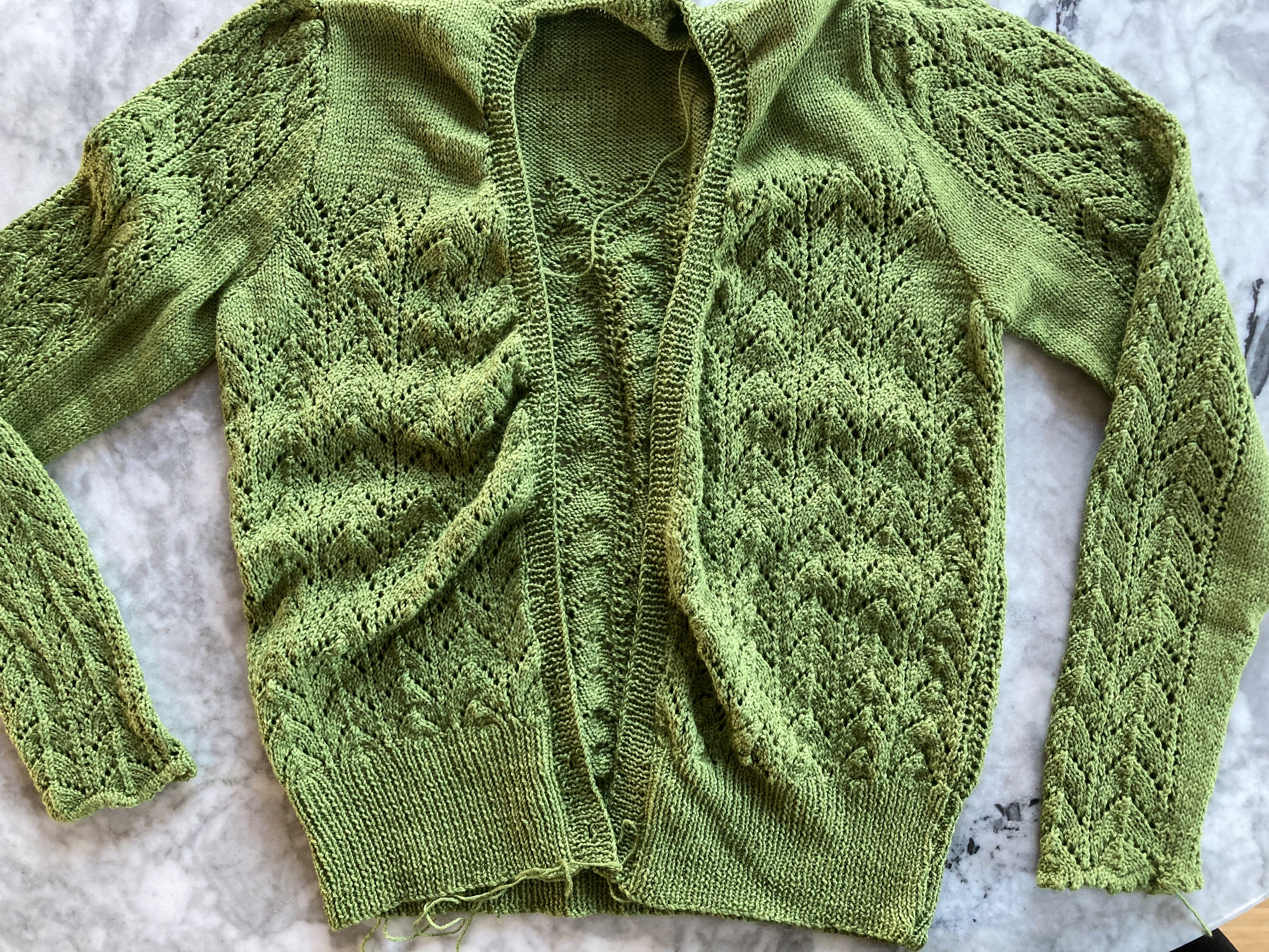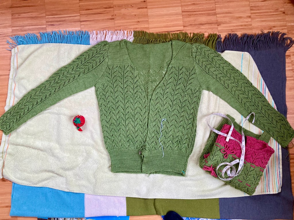 Crossing fingers that it would all work out, I finished the front and back yokes in stocking-stitch in all green (leaving about 10-15 grams of green yarn over, so that was fine) and sewed it together. It was hard to tell whether it was a good size or not, since the lace pattern scrunches up a lot while knitting and I knew that blocking would stretch it out a lot. I didn’t want to complete the button bands on the scrunchy lace, so I blocked the almost-finished cardigan first.