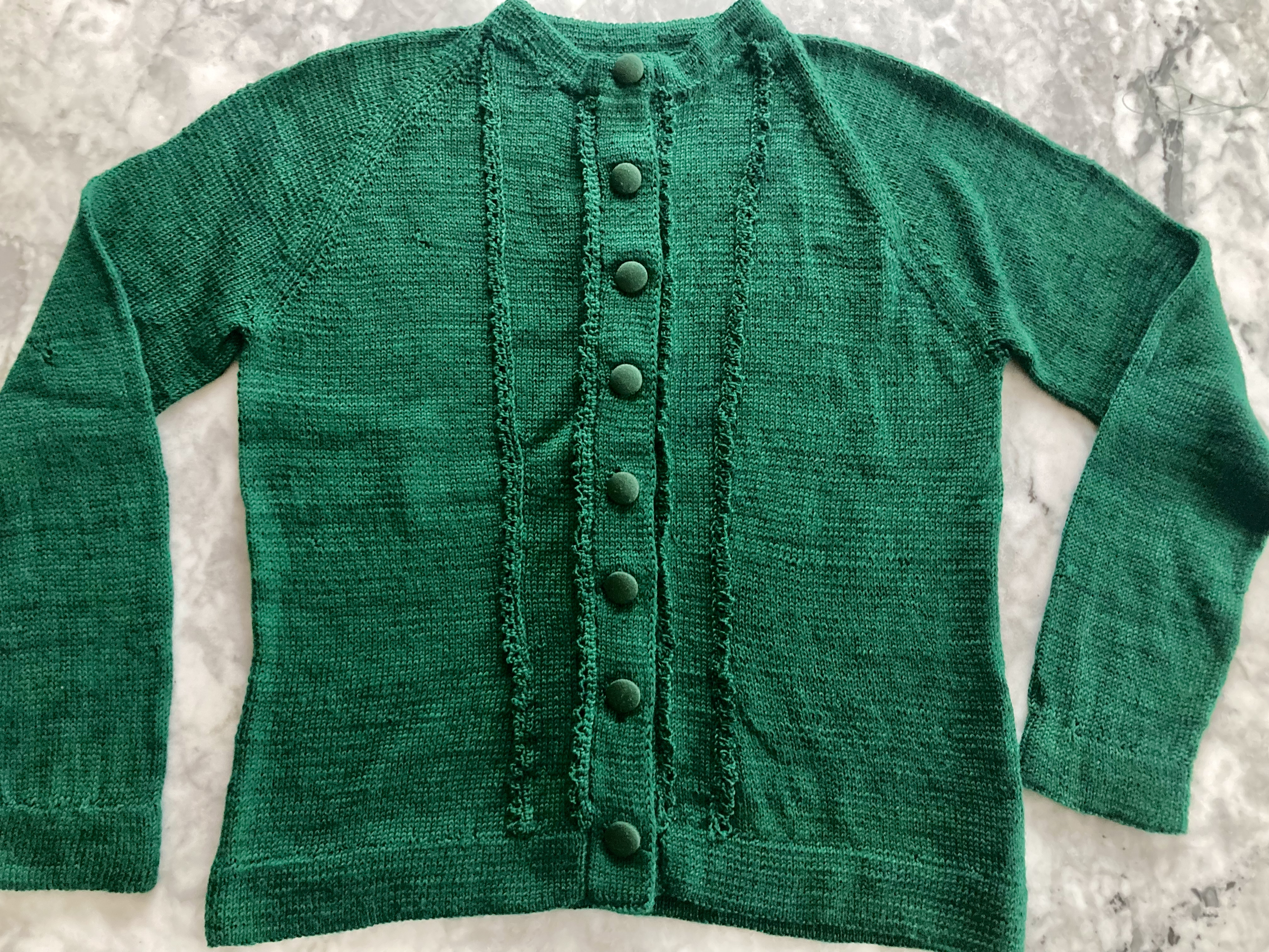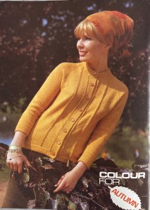 This month’s project was the simple, yet elegant “Cardigan with Picot Trims” from the October 1965 issue. It is made in stocking-stitch with 3/4 length raglan sleeves and hems at the lower edge, front bands, cuffs and neck. The fronts are then trimmed with simple crochet picot edging and the back is left plain.