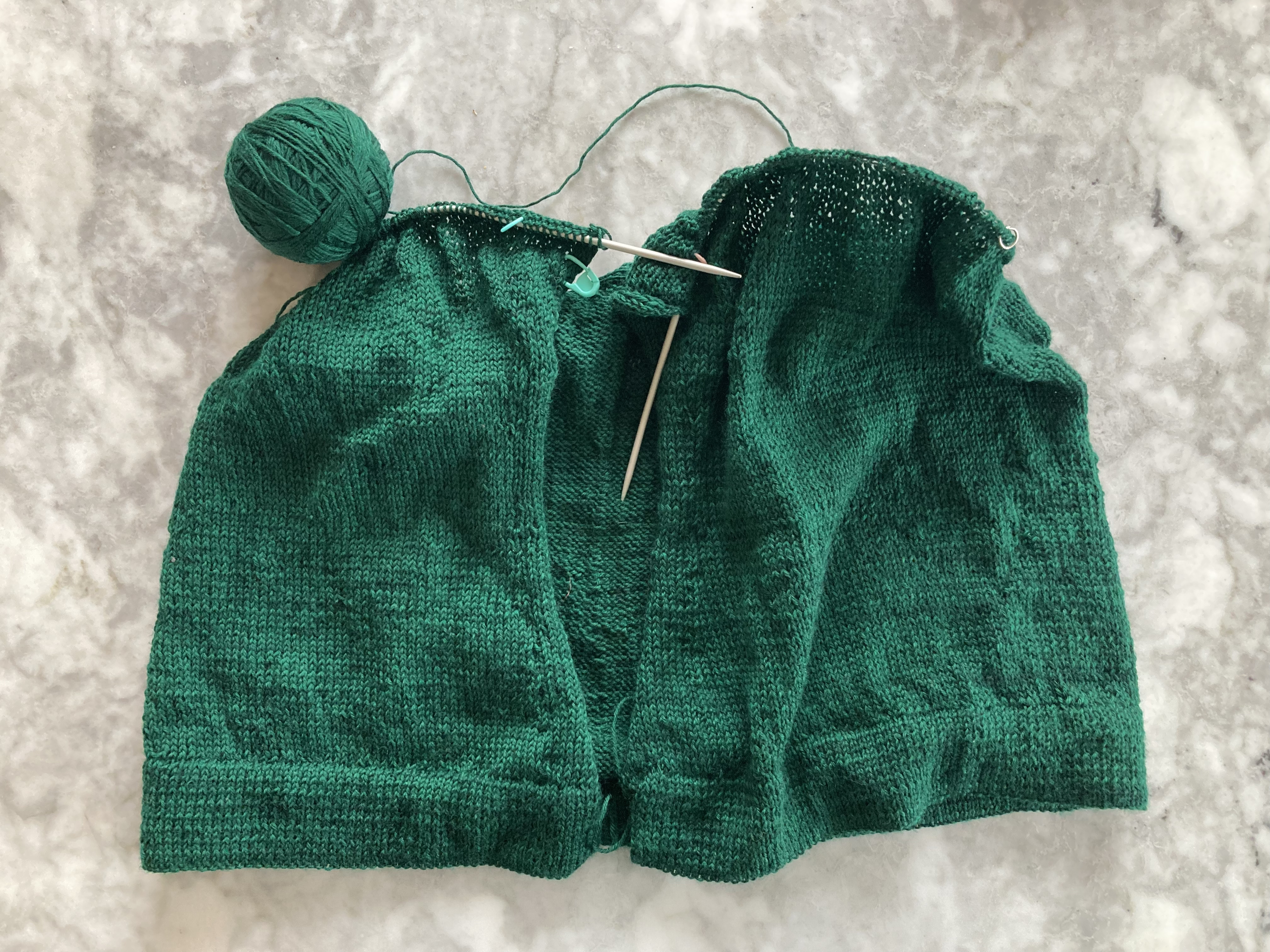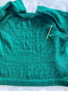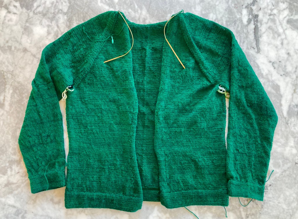 I made the raglan decreases as intended — sleeves decreasing every 4th row at first, then every other row, and always every other row for the fronts and back. Of course, the counts didn’t match exactly, since the stitch counts were from different sizes. Also, I wanted the neckline to sit a little lower and I was concerned that the yoke might be too long — I didn’t check row tension, but it seems to be not 9 rows/inch. I ended up making the initial neckline decrease about an inch below where it would have been in the pattern, ending where it fit the best and just making some extra decreases on the last row to pull the back neck in a bit for the neckband.