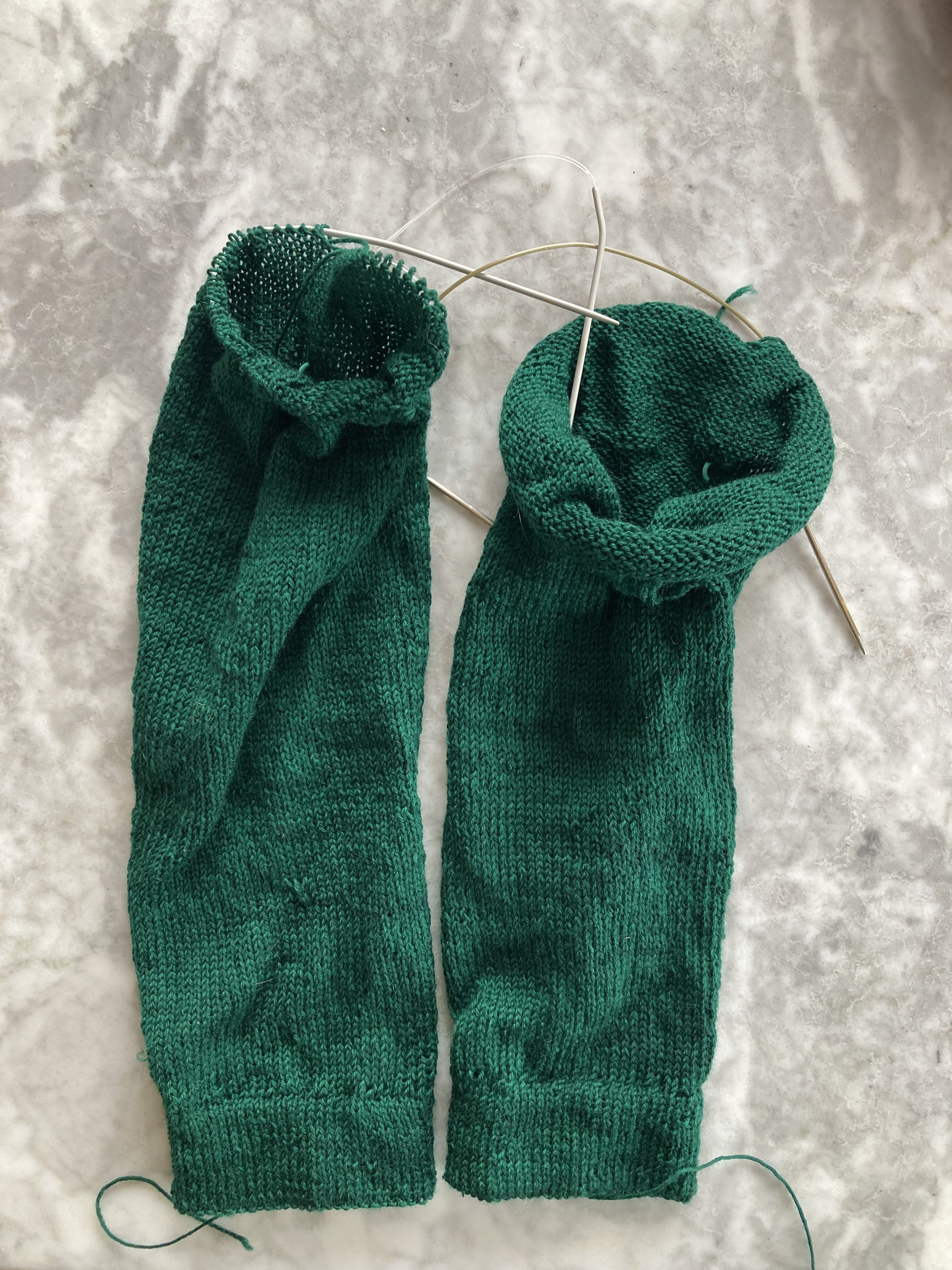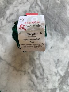 It was the perfect project for the Rohrspatz & Wollmeise “Lacegarn” wool (100% merino wool, superwash, hand-dyed) that I had bought at the Sulinger Wollfest this past summer. The pattern calls for Patons Beehive 4-ply, so a little thicker than my laceweight, but that meant that for once, I could use the intended needle size and get the intended tension (7 sts and 9 rows/inch on No. 10 (3.2g mm) needles — I used 3 mm and it worked perfectly.) The yarn is glorious, with its deep, glowing green colour, which is deepened by the slight marling that results from the hand-dying process. This hank (300 g) was even discounted due to possible knots, breakages or dying errors, but there were none of any of those that I could find.
