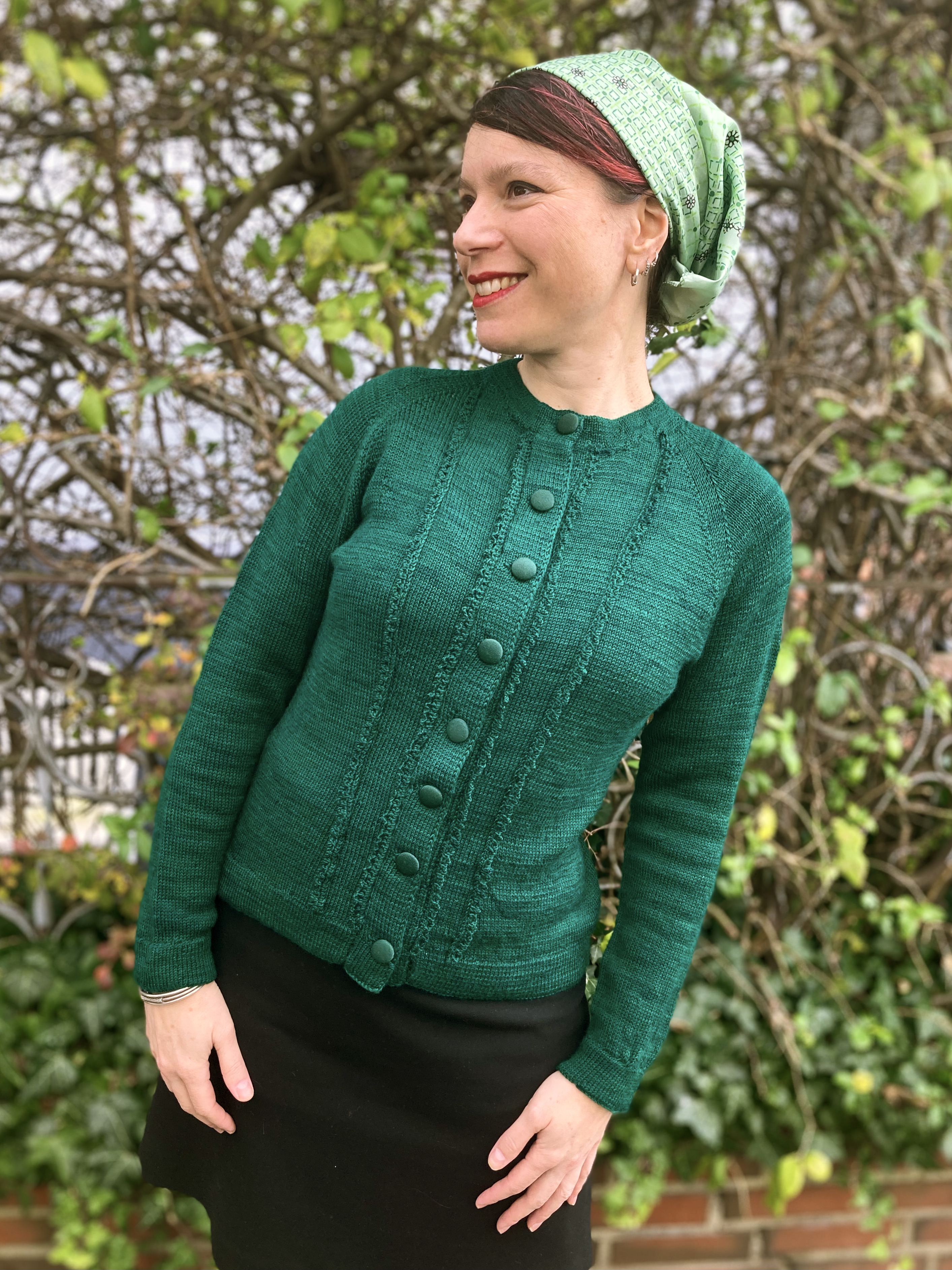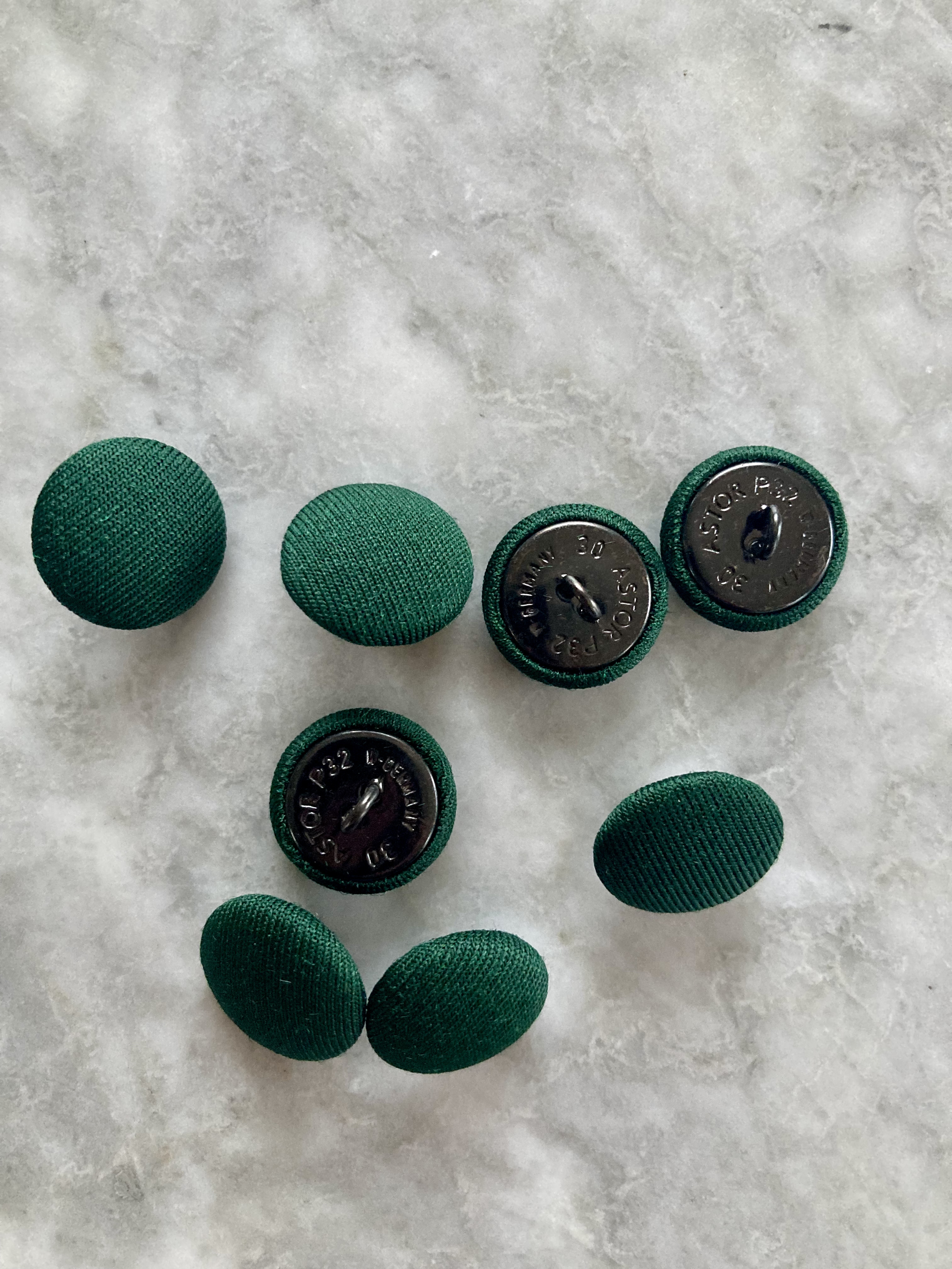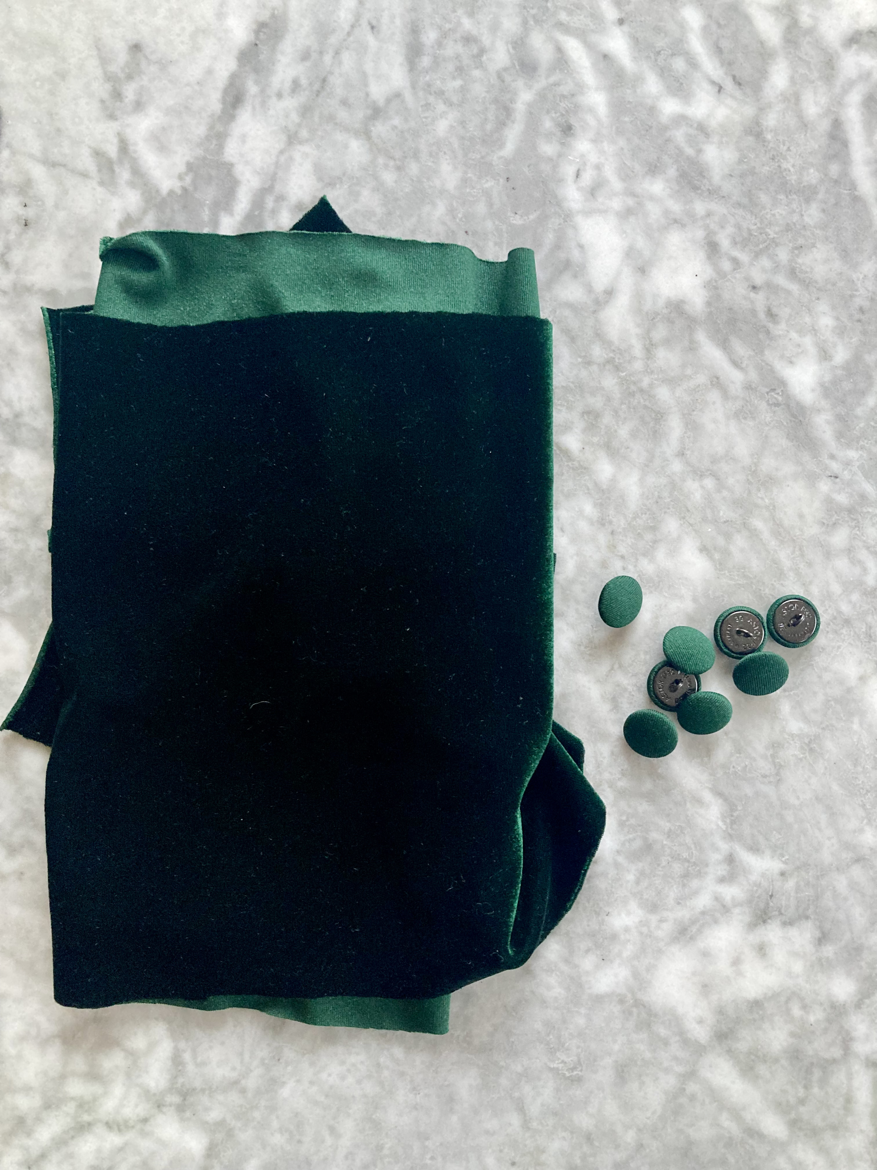 That left the buttons! Which were, strangely, the most difficult part. I wanted round, flat buttons with a back hook (not holes), as in the photo. So very 60s and in my opinion, they really make the outfit. But neither the colour of the wool (a deep, slightly blue pine green, none of the photos here really do it justice) nor the style of button seem to be in fashion. I looked at different stores, online button shops, vintage buttons on ebay… Nothing close. Luckily, my local wool/sewing shop can cover buttons with fabric if you have the right fabric. What do you know, this colour is not in fashion for fabric either! I finally found some gorgeous green stretch velvet and used the wrong side (not the velvet side) for the fabric buttons. Perfect.