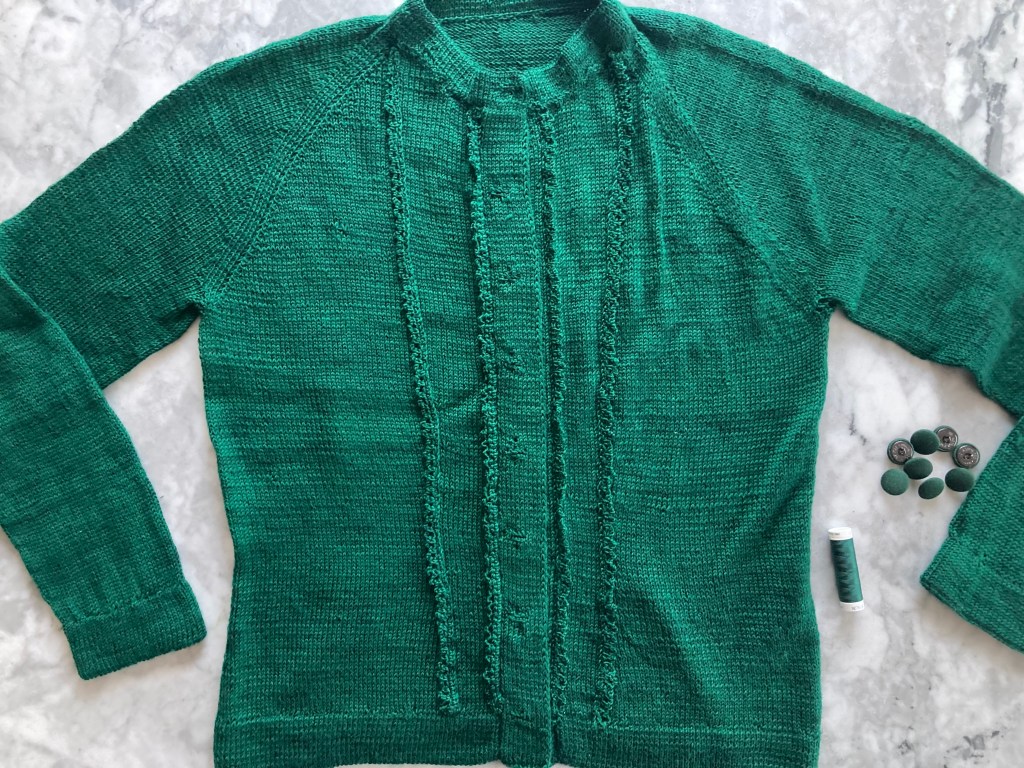 The front bands are made separately and sewn on. I guess I could have knitted them with the fronts and back, which I made in one piece anyway, but I didn’t think of it in time. And anyway, making them separately meant I could make them on smaller needles. For once, I got the spacing of the buttonholes right! Stitchcraft always tells you to make the button band first, sew it on as you go, then mark the places for the buttons with büpins and make the buttonholes on the other band to correspond. It does not always work as well as you think it should.