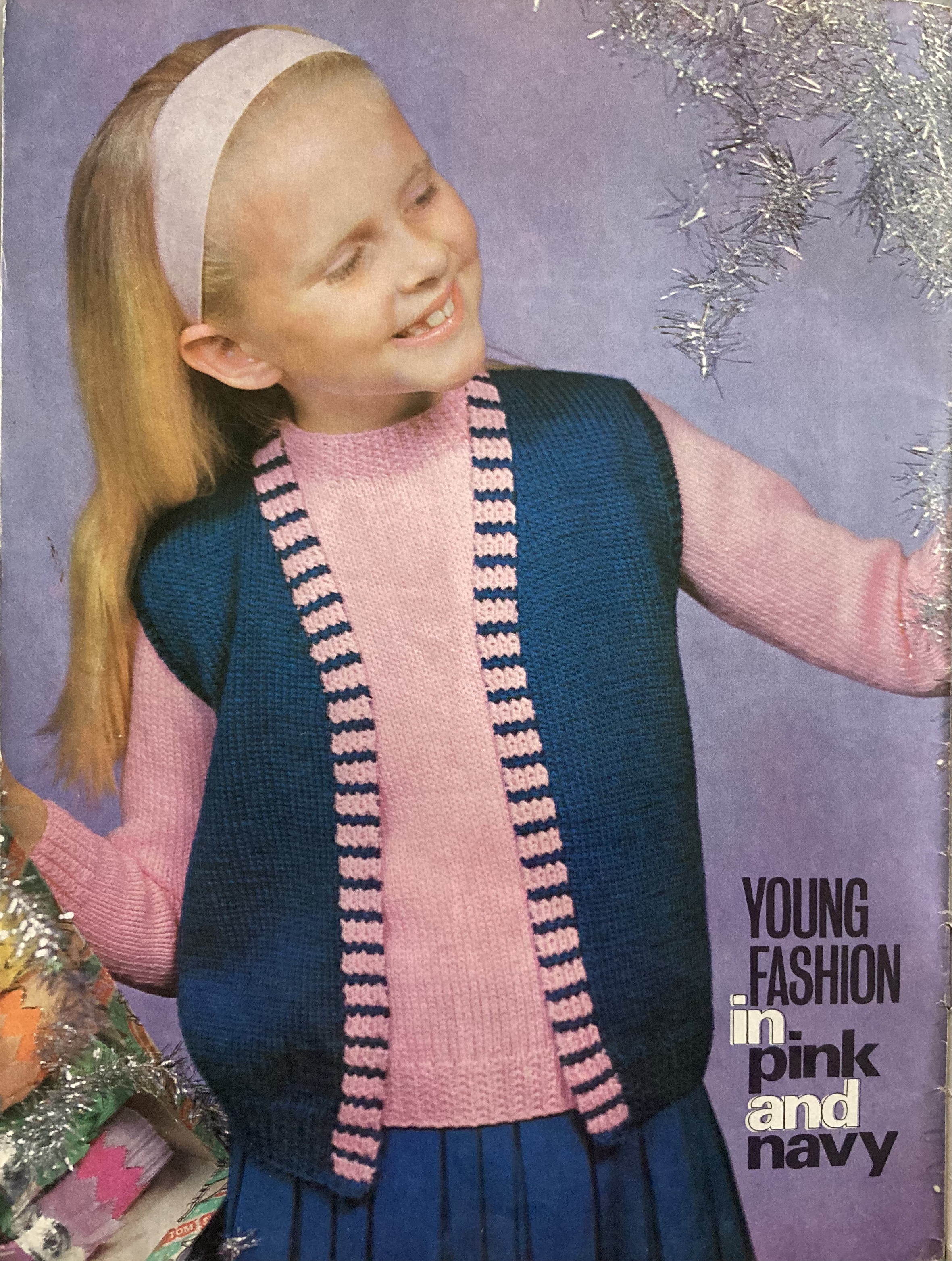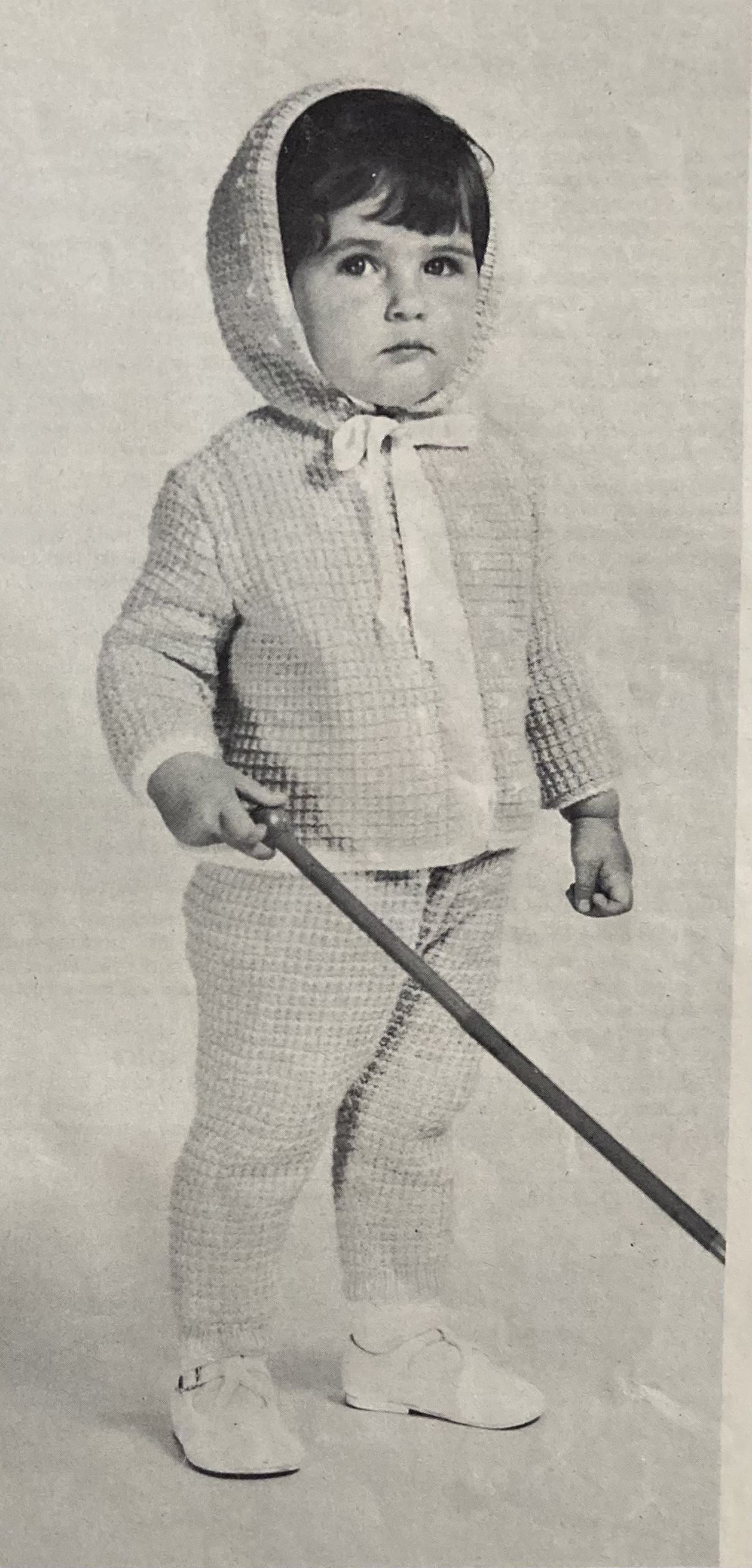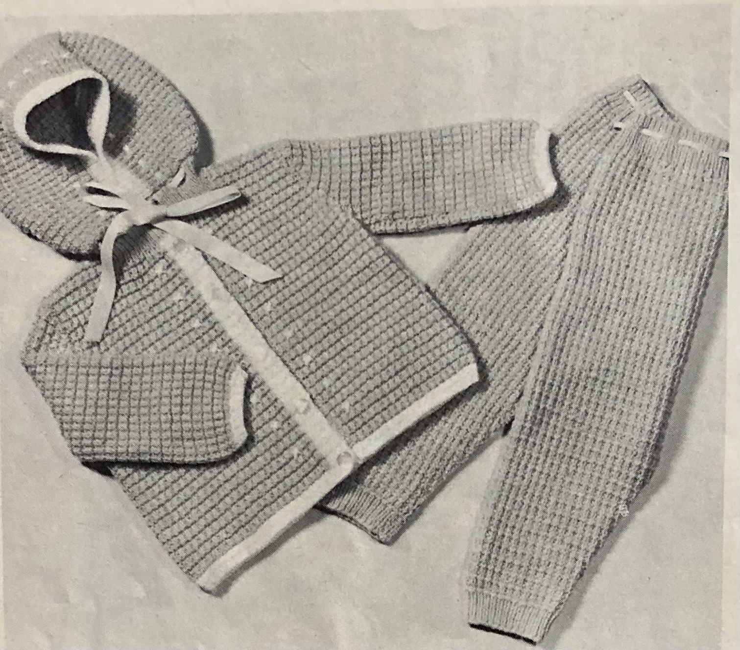 The photo of the girl’s twin set in the inside front cover photo also does a great job of harmonising the backdrop to the subject. Her set consists of a pullover with unbuttoned waistcoat in cheerful pink and blue. Her little brother or sister can go out in the pram or “toddling” in a warm set of hooded jacket and leggings. The child in the photo looks somewhat apprehensive, but the set looks quite snuggly.