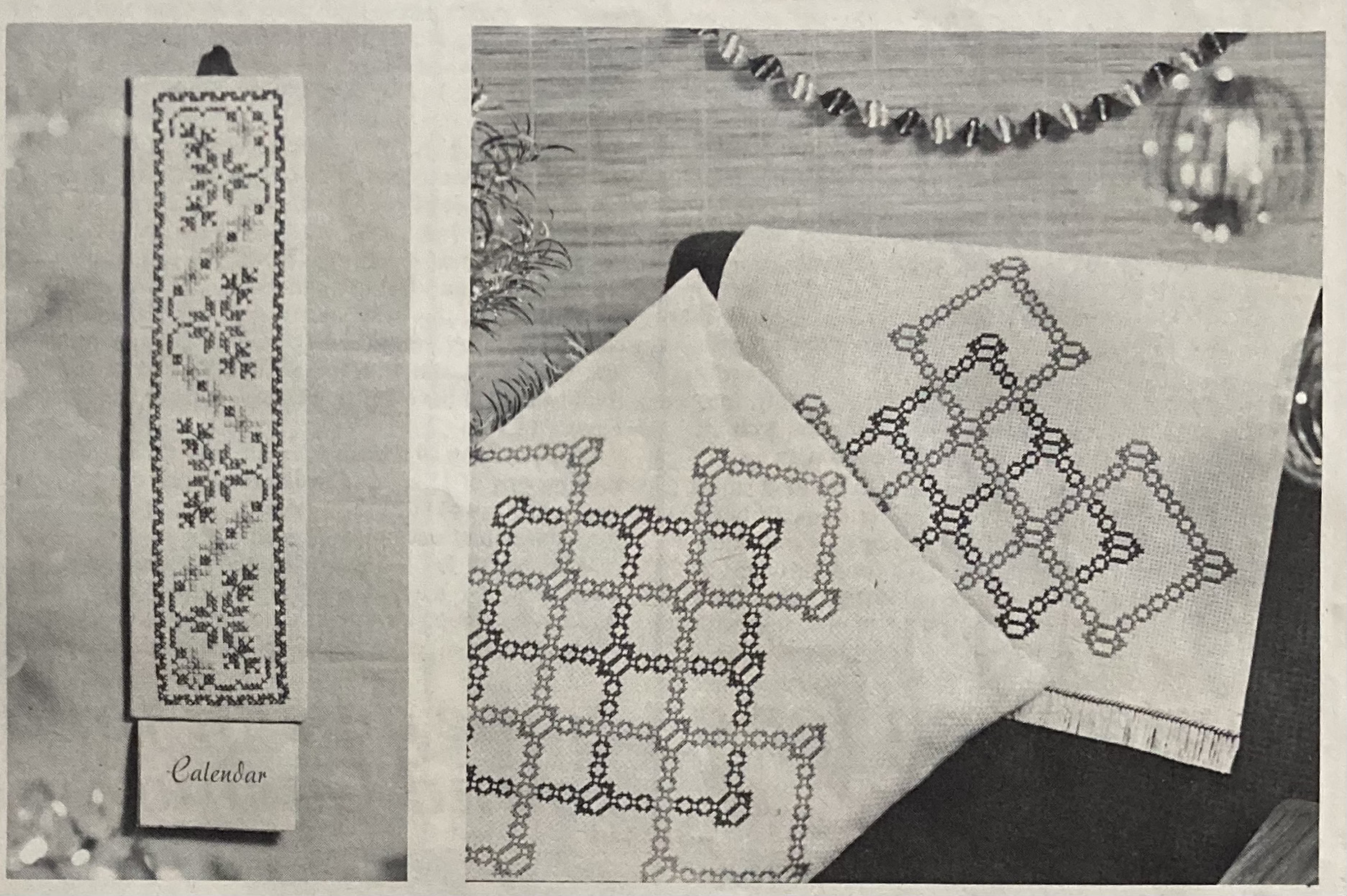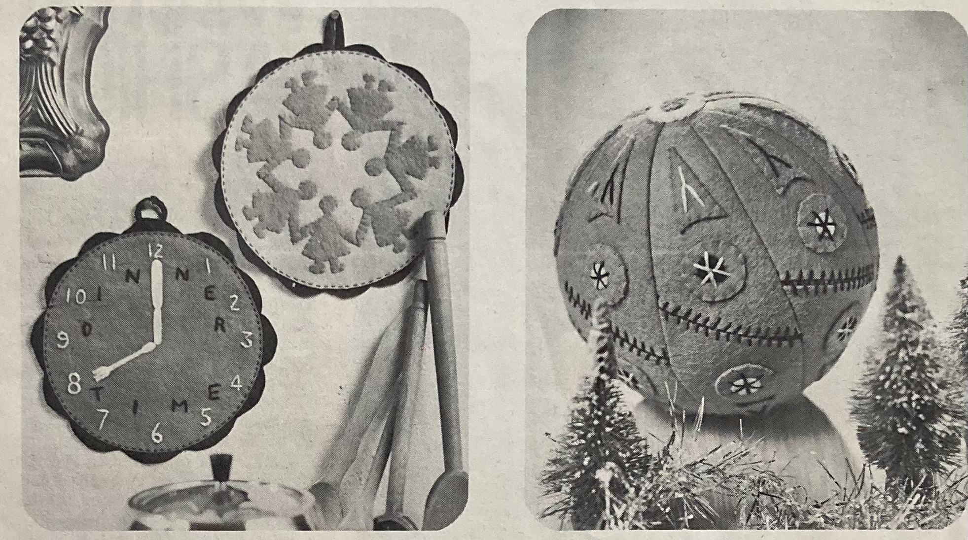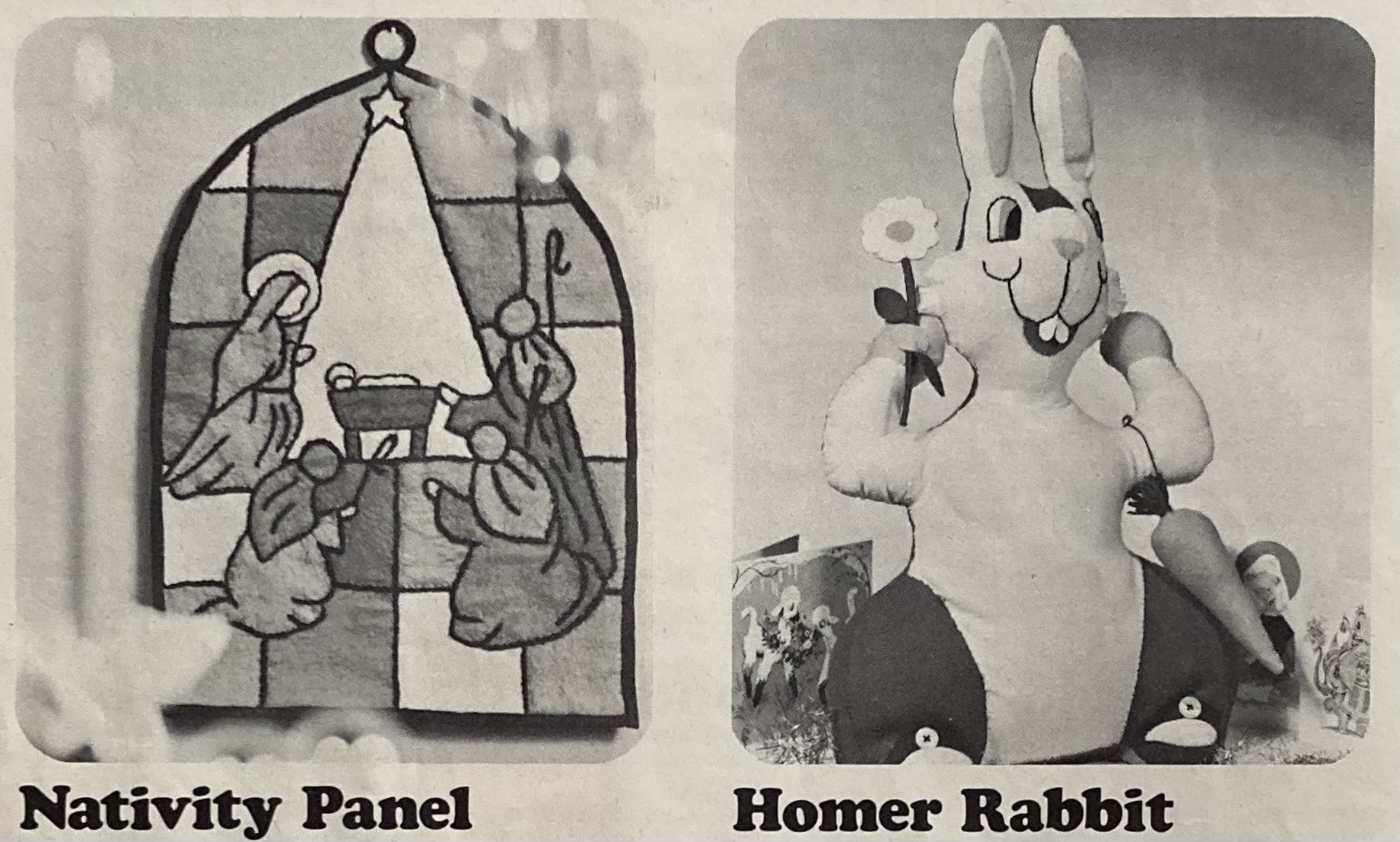 Home-made Homer is one of this issue’s many small, fun “colour novelty” gift and decoration ideas, along with a felt Nativity panel mimicking stained glass, a couple of pot holders and a colourful ball to use as decoration or a baby’s toy. Embroidered gift ideas include a whimsical sewing apron and a cross-stitch calendar and chairset. I don’t really understand the calendar — it seems to be just a vertical wall panel that you attach the (tear-off?) small calendar onto. OK, I guess, but maybe not necessary?