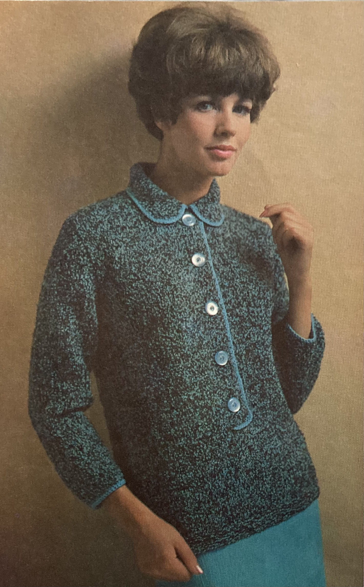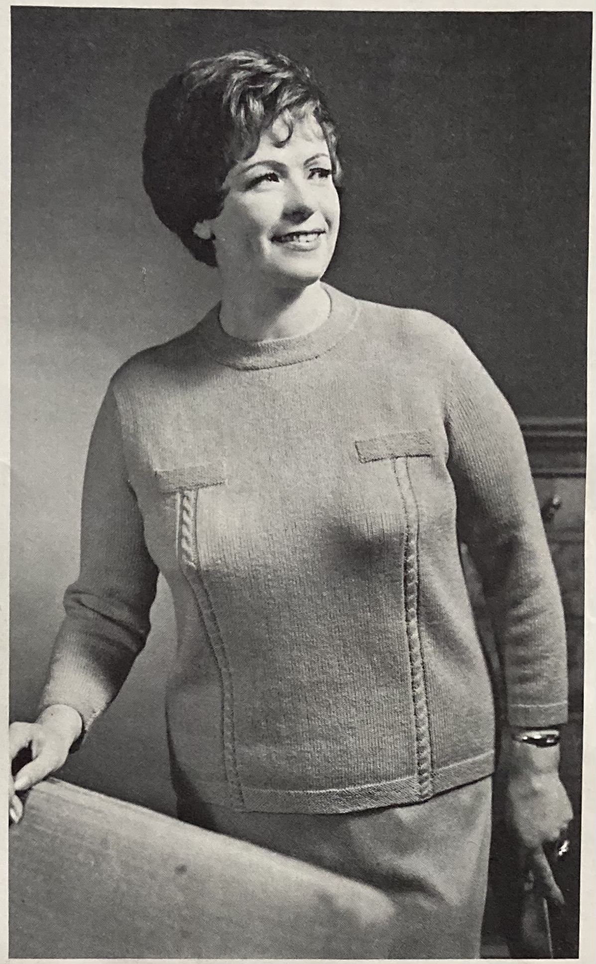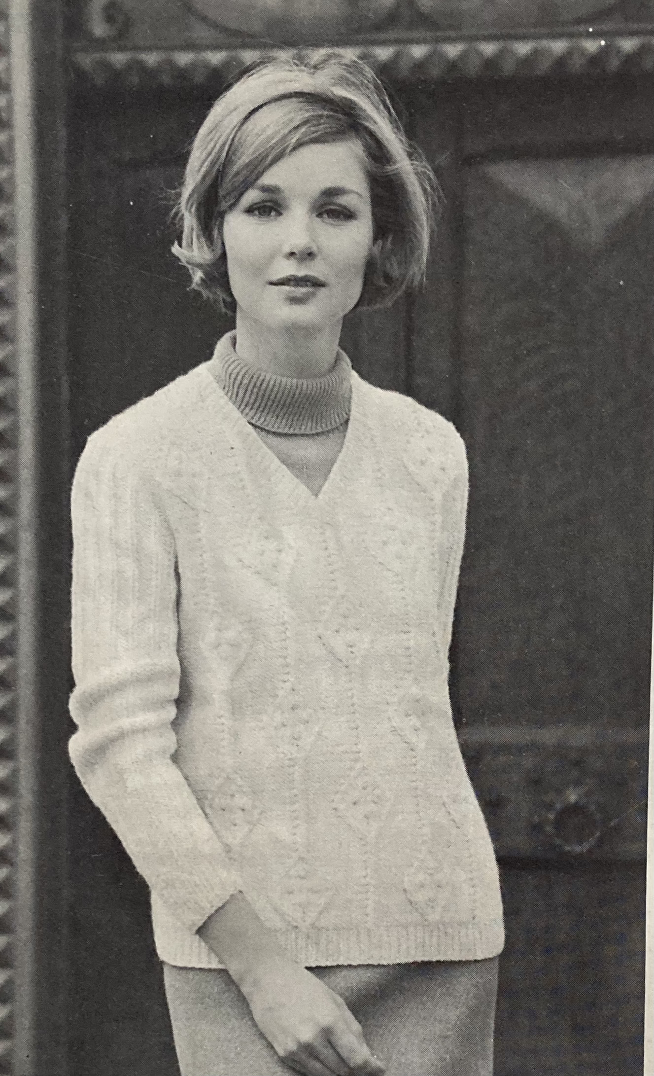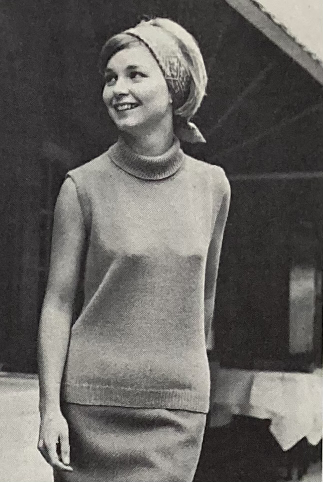 Other women’s fashions include a bobbly-cabley “overpull” in undyed “Capstan” wool, made to be worn over a roll-neck knitted underblouse with or without sleeves. The underblouse keeps up the warm colour trend with the suggested colour of “Old Gold”. I love the model’s hairstyle!