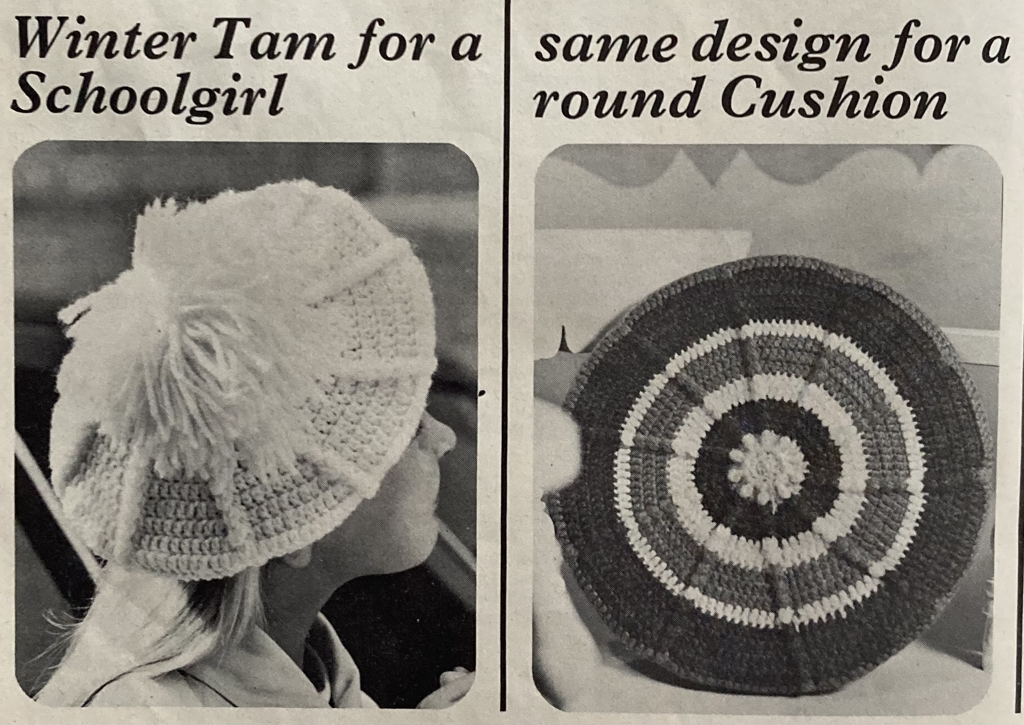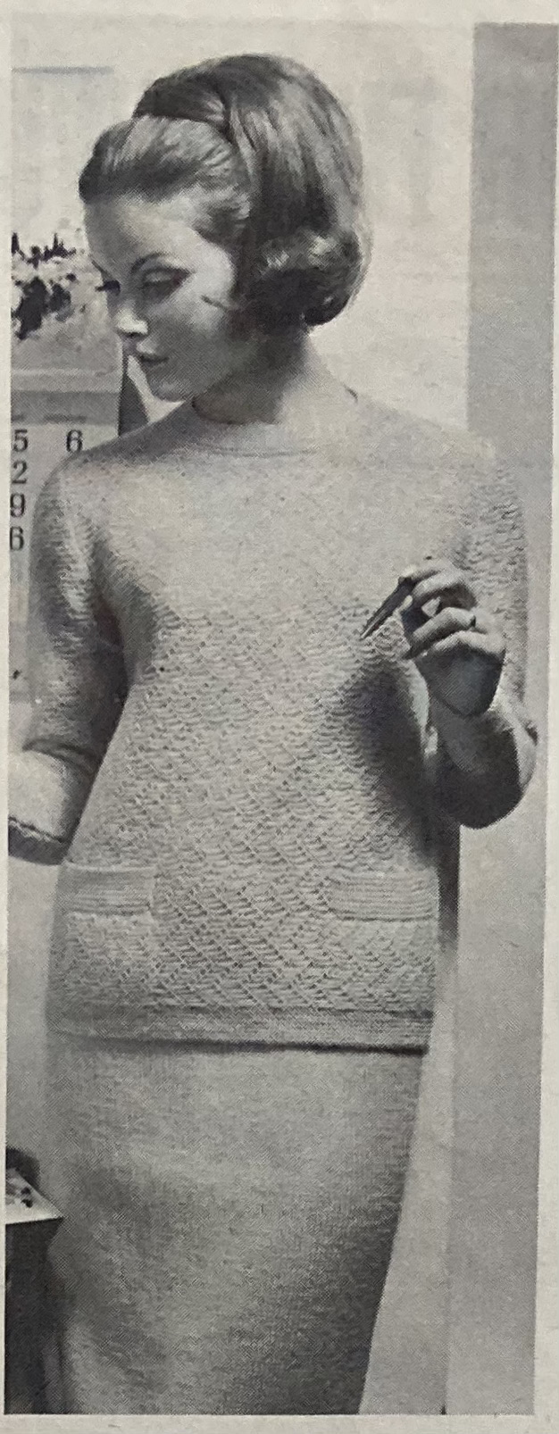 The knitted sweater suit on the cover is made in an intriguing pattern stitch designed to give “the look of woven texture.” There’s a helpful close-up photo of the stitch pattern as well. Essentially, it’s made by making a wool-forward (yarn over) on the right-side row and then slipping that stitch over a garter-stitch base to make a horizontal “line”. The placement of the slipped stitch is staggered, to make a diagonal herringbone-type effect. Made in DK wool, I’m guessing the finished result is quite warm. The matching skirt is made in plain stocking-stitch. Note that the mini-skirt, or even anything-above-knee-length skirt, still hasn’t caught on with Stitchcraft’s more conservative readership.