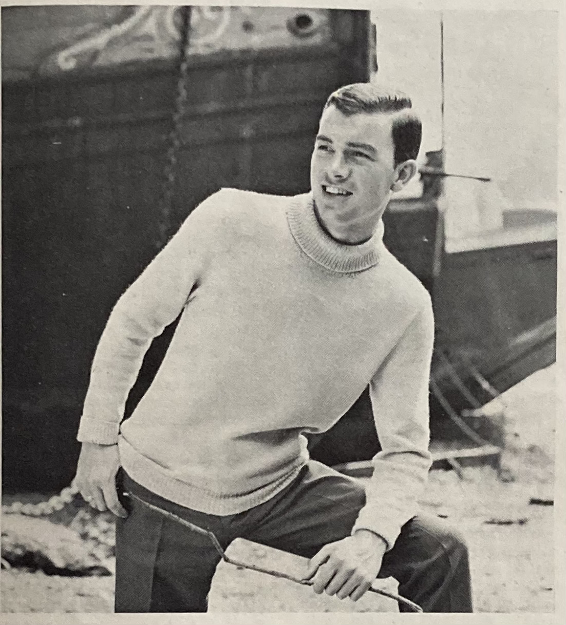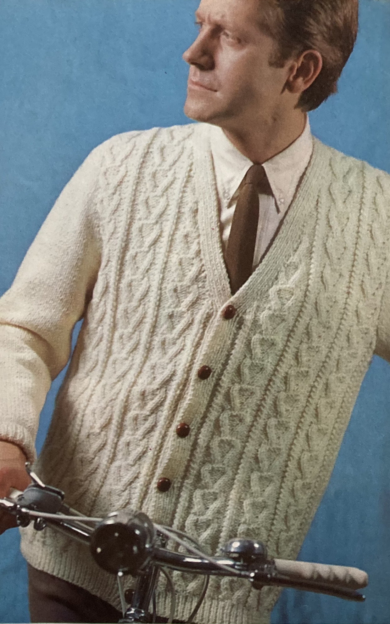 There’s also a jumper for larger sizes with very ill-thought-out decorations going right over the bust, and a collared almost-cardigan with a deep placket and Peter Pan collar. The collared number is made in tweedy “Glenora”, one of the multicolour wools gaining popularity at the time. Men get a corollary set to the women’s “overpull” and “underblouse” with a slightly oversized bobbly-cabley cardigan and a 4-ply polo-neck in the same “Nylox” wool as the ladies’ underblouse. The “colour radiance” theme apparently does not extend to the men’s garments, being made in undyed Capstan and “Oystershell” off-white, respectively. The photo backgrounds colours are nicely chosen, though, to set off the diagonal poses and camera angles.