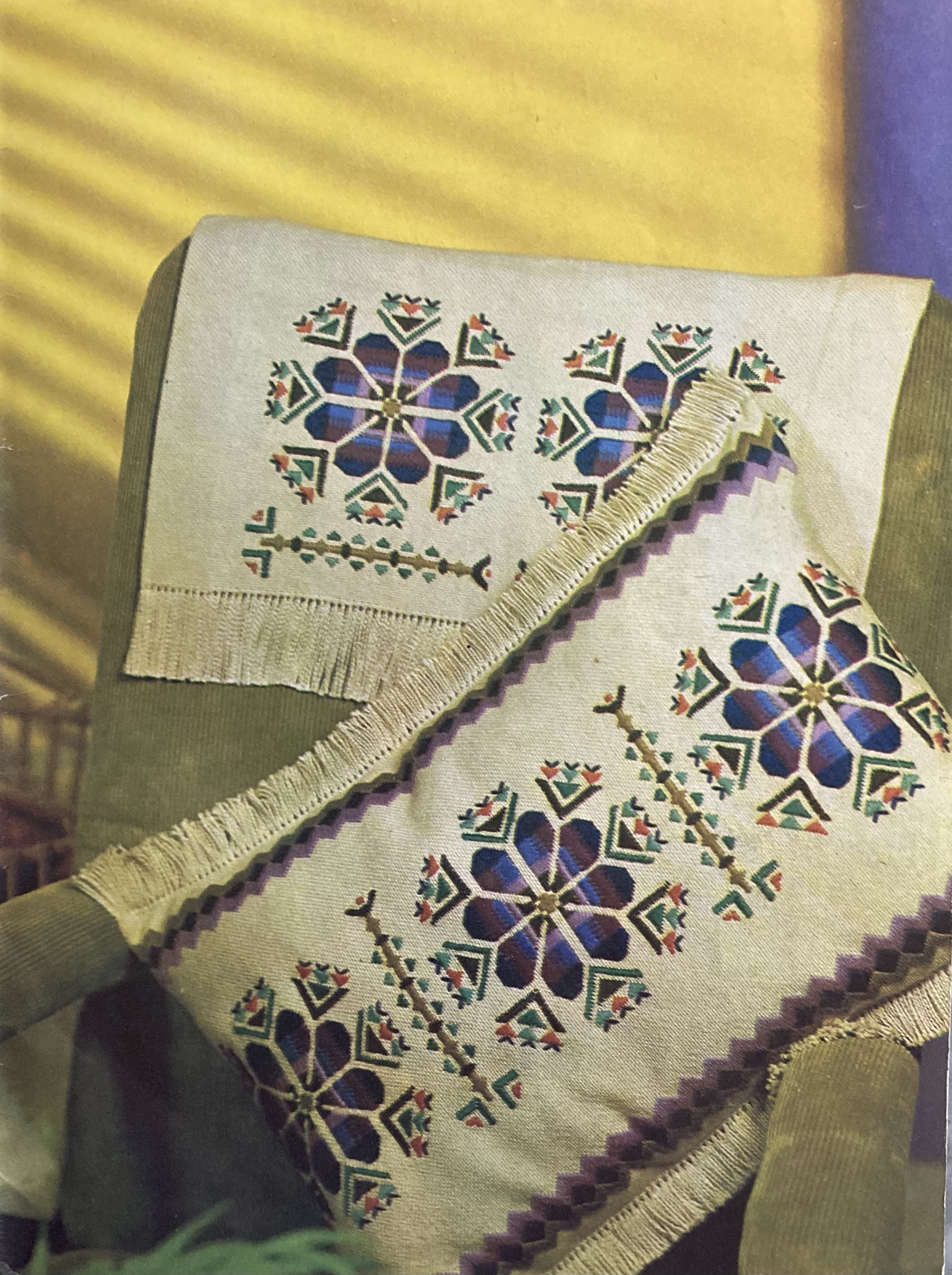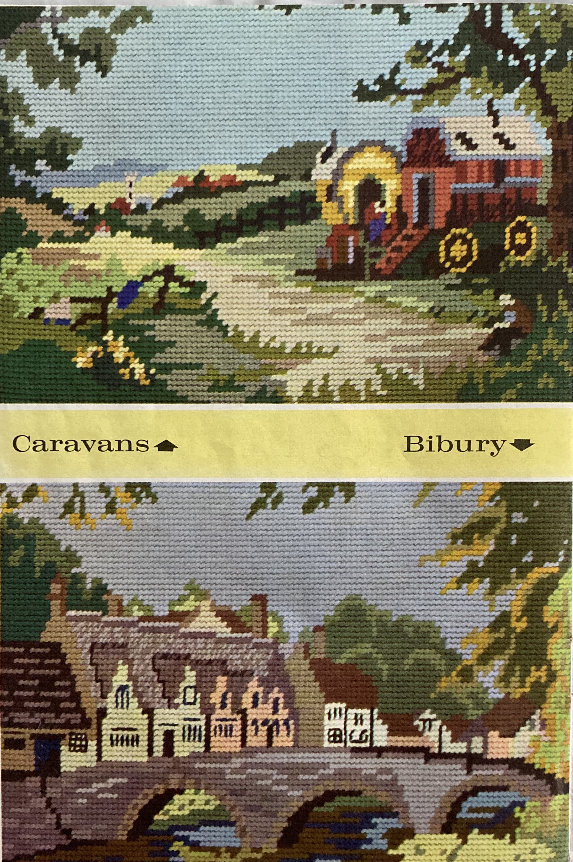 You can also knit a stuffed panda bear, a snowman, or a garter-stitch blanket rug, or crochet a round disc to be adapted into either a girl’s beret or a round cushion. There’s a filet crochet table centerpiece and tapestry wall pictures of caravans or Bibury. Last but not least, there’s a counted-embroidery cushion-and-chairback set with a vivid purple flower design.