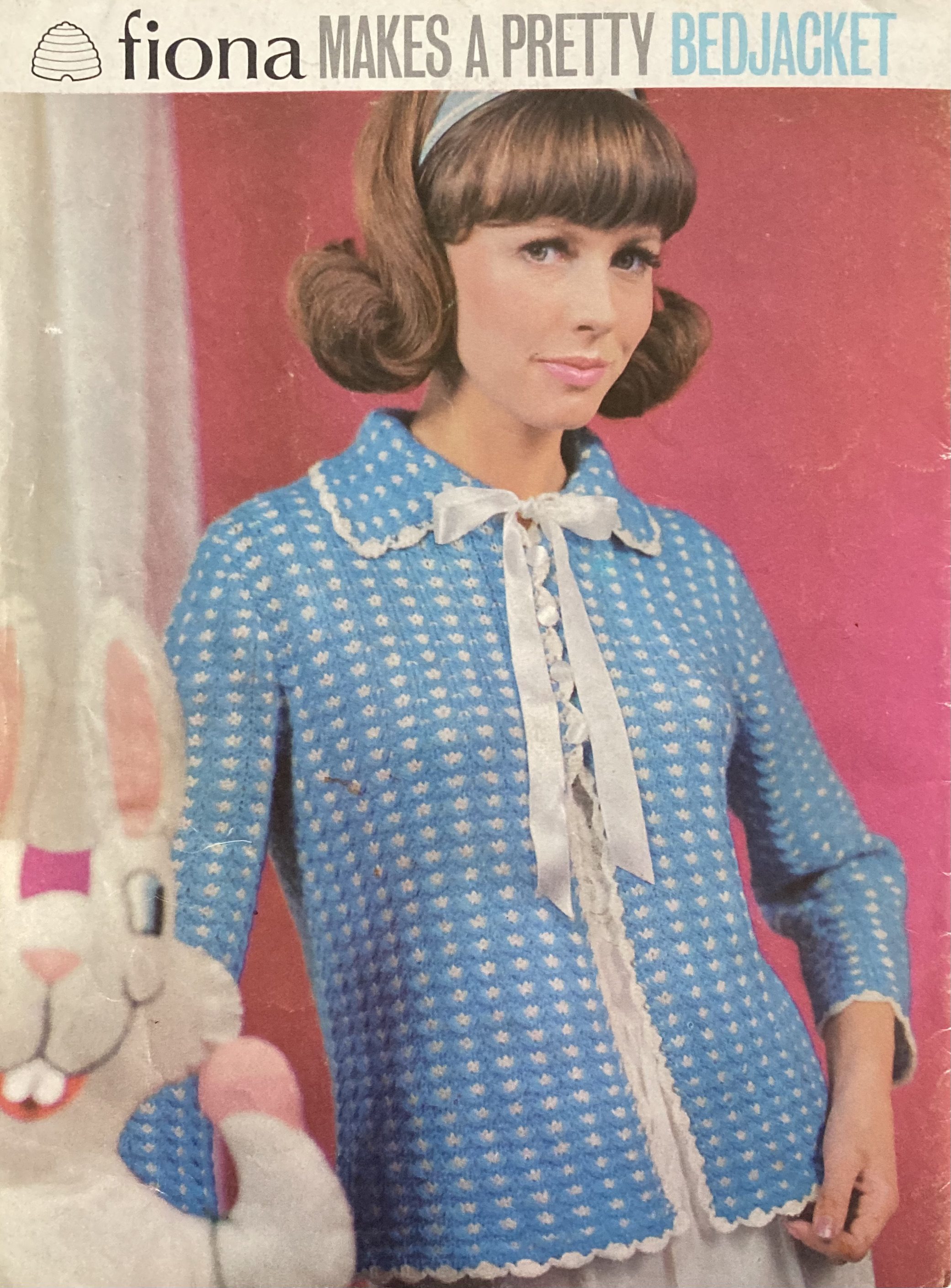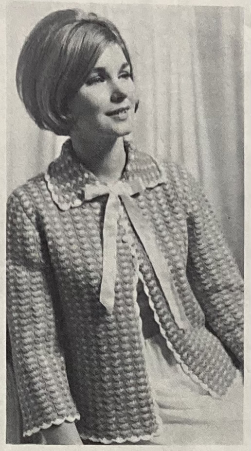 And can we have a moment of appreciation for this “special gift” of a bedjacket? I love it! I would make it without the ribbon at the neck and wear it as a normal cardigan. The two-colour pattern is made by working and then dropping yo’s to make a “long” stitch, which is then carried up through the slip-stitch background. I am guessing it is quite spongy and squishy, and was also nice and warm in those unheated 1960s bedrooms. Love the hairstyle in the colour photo, too!