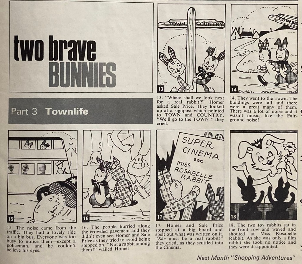 If the model on the left is looking a little suspicious, it’s probably because she was photo-bombed by Homer the Rabbit, star of our current children’s serial comic, “Two Brave Bunnies.” For the uninitiated: Homer (a home-made stuffed rabbit) and Sale Price (a store-bought stuffed rabbit) are on a quest to find a real live rabbit friend. So far, they have only met a merry-go-round rabbit, who assured them that he was not real, as he could carry children on his back. In this month’s episode, our two brave bunnies head to the Town, where they are eager to see “Miss Rosabelle Rabbit” on the cinema screen. Alas, she is only a film rabbit, so cannot communicate with our friends. No matter — they will persevere! Oh, right — and this month’s issue includes instructions on how to make your very own home-made Homer doll from felts.