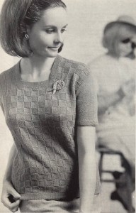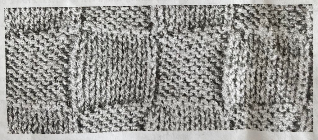 The pattern is written for Patons Nylox 3-ply, which existed in an earlier version with 80% wool and 20% nylon, and a later version with 60% wool and 40% nylon. This pattern would have to be written for the earlier version, as the later version was sold in 25-gram balls and UK wool weights didn’t change to metric until the early 1970s. It was 3-ply, so quite lightweight, and meant to be knitted up at a tension of 8 stitches to the inch in stocking-stitch. Cool Wool Vintage is more like regular 4-ply / fingering-weight wool, or even a little more on the “sportweight” side. The pattern also only offers one size — to fit 35-37 inch bust — which would fit me snugly at 8 sts / inch in stocking-stitch but surely be too large at the 6.7 sts/inch that I got in the pattern-stitch swatch, so I adjusted the stitch count and number of pattern repeats.