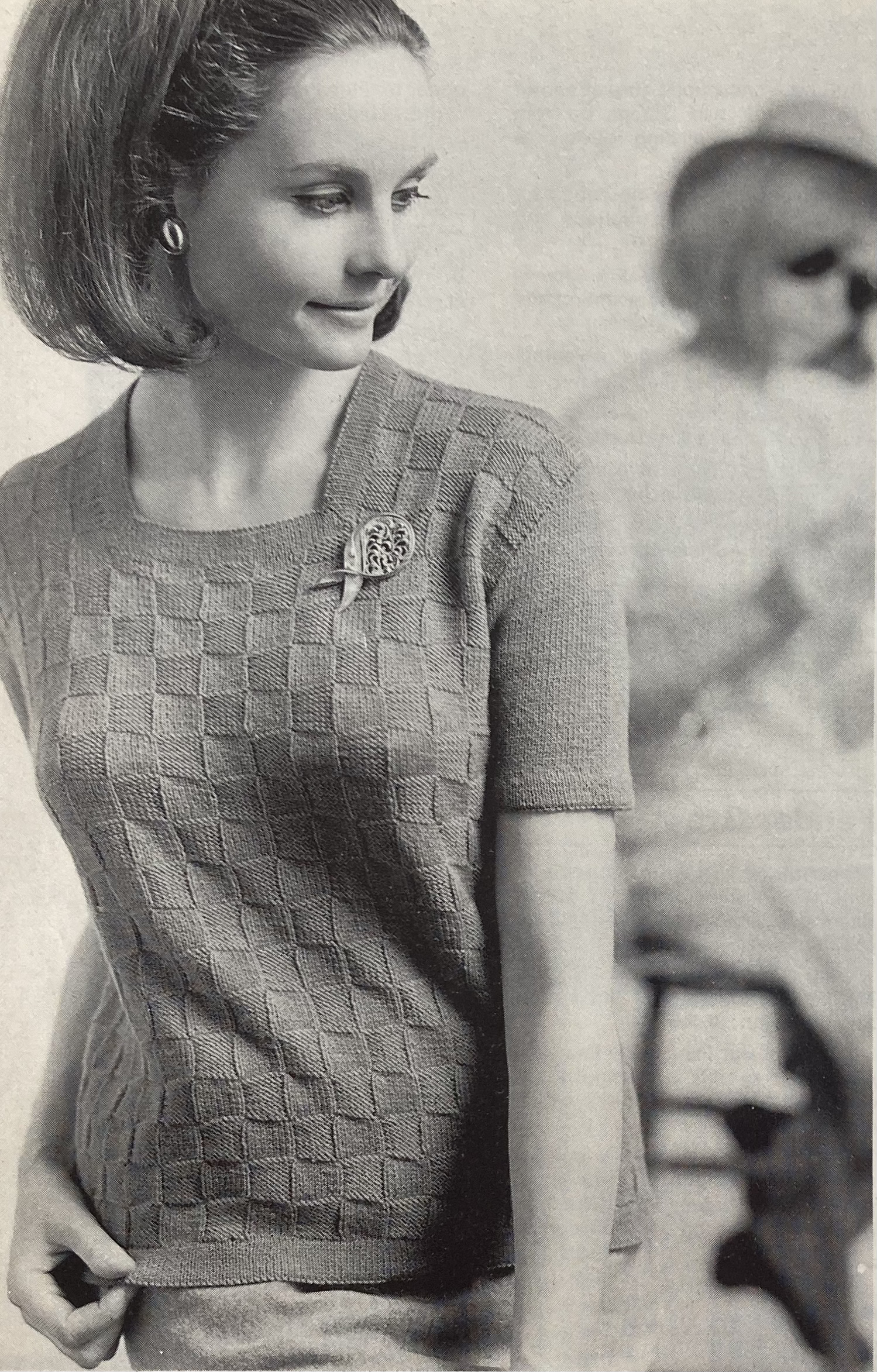 My June 2024 / June 1966 project was going to be the goofy garden cushion with the smiling purple and magenta felt appliqué sun, but I was traveling the first two weeks of June and it was easier to have a knitting project with me than an appliquéd cushion on hessian fabric. I loved the 3-ply blouse in this “Pattern texture from Paris” (note: I do not think the basket weave knitting pattern stitch was specifically invented in Paris, but whatever sells your magazine…) and a lovely colleague had given me a ball of Lana Grossa Cool Wool Vintage yarn in my favourite shade of green just the week before, so I was inspired to make it instead.