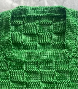 I didn’t know if I would have enough yarn or not — even with 300 grams — so I made the sleeves from the top down, picking up stitches around the armhole and working the pattern so to speak in reverse order. Even adjusting for gauge, the first sleeve was wide and a bit wing-like (the hem doesn’t pull the fabric in nearly as much as ribbing, of course). I recalculated and made the second sleeve narrower, which was better, so frogged the first sleeve and made it again. I did end up having to buy one more ball of yarn, too — I thought about making very short cap sleeves, but it was worth the extra ball of yarn to get the right length.