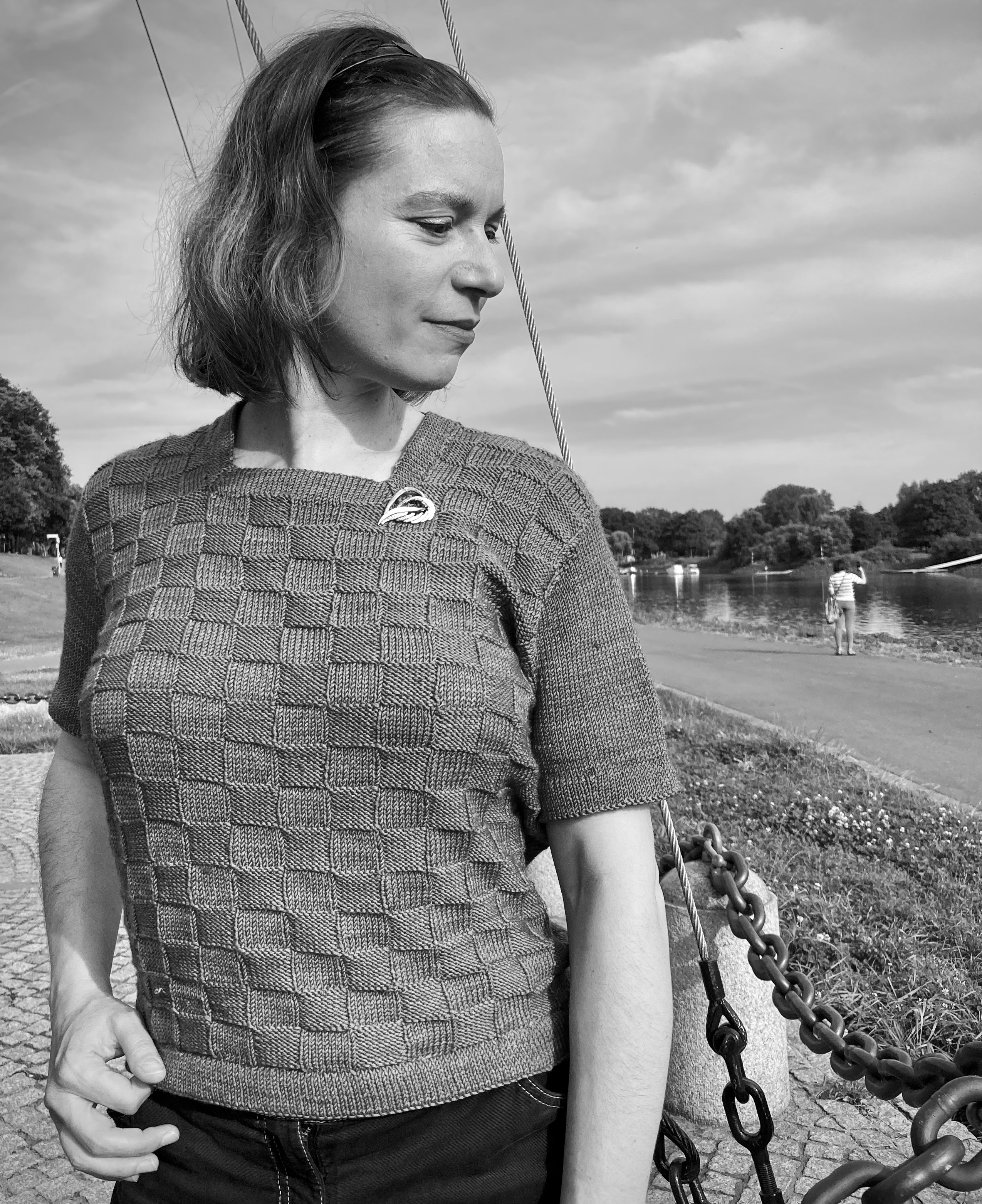 As usual for mid-1960s garments, there is no shaping from hem to bust, but unshaped garments always look like a sack on me. I started with a reasonable amount of positive ease at the hem (literal hem: the blouse features stocking-stitch hems at the bottom edge, sleeve edge and even at the neck edge) and increased up to a more or less zero-ease bust. It won’t have that authentic shape, but I will like it a lot better. The yarn was quite springy and holds its shape well, which is great, especially considering that a basket-weave pattern tends to stretch wider and shorter.