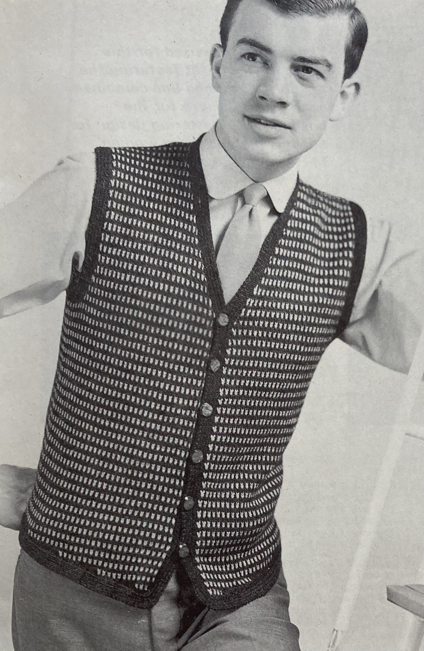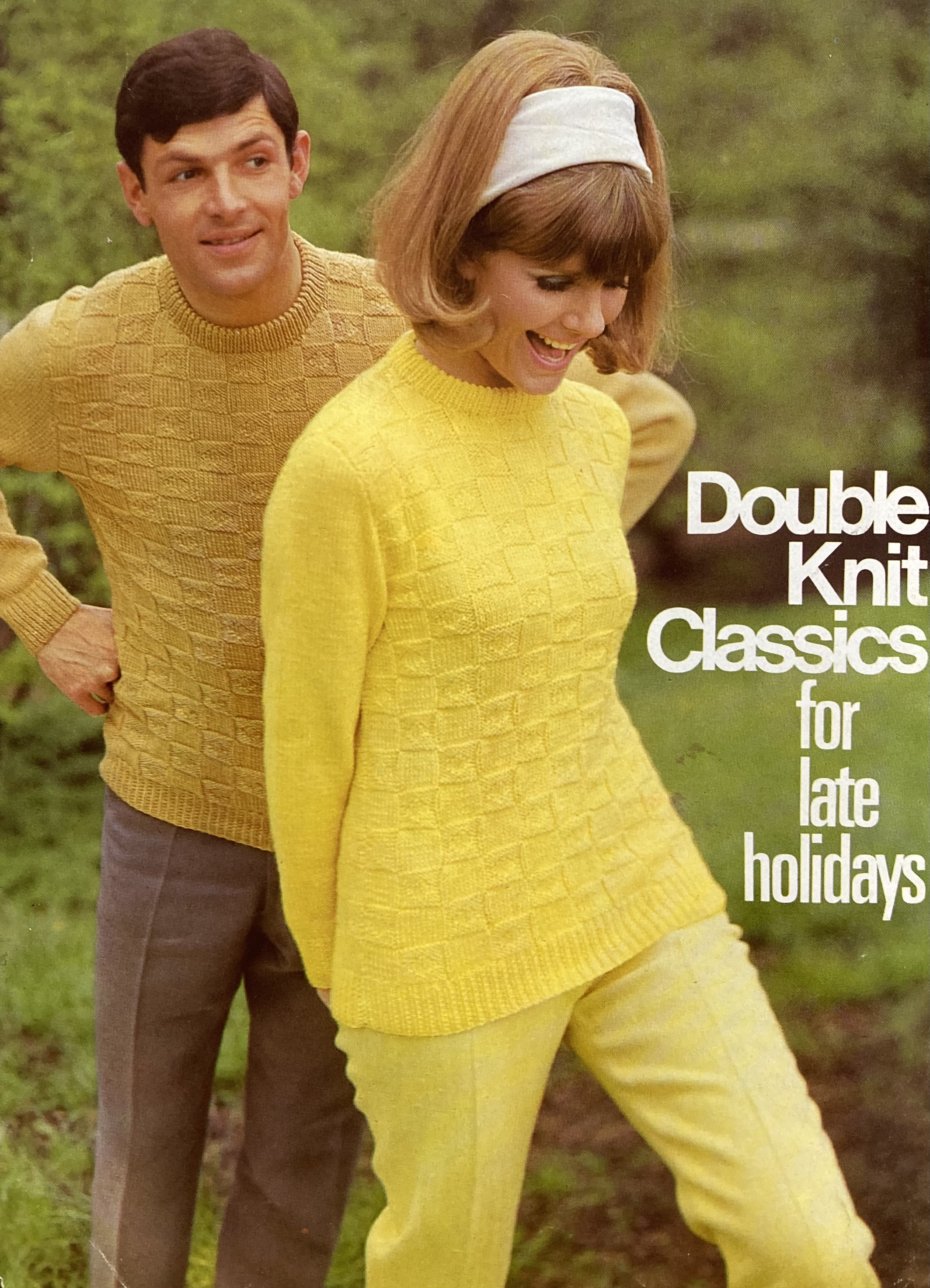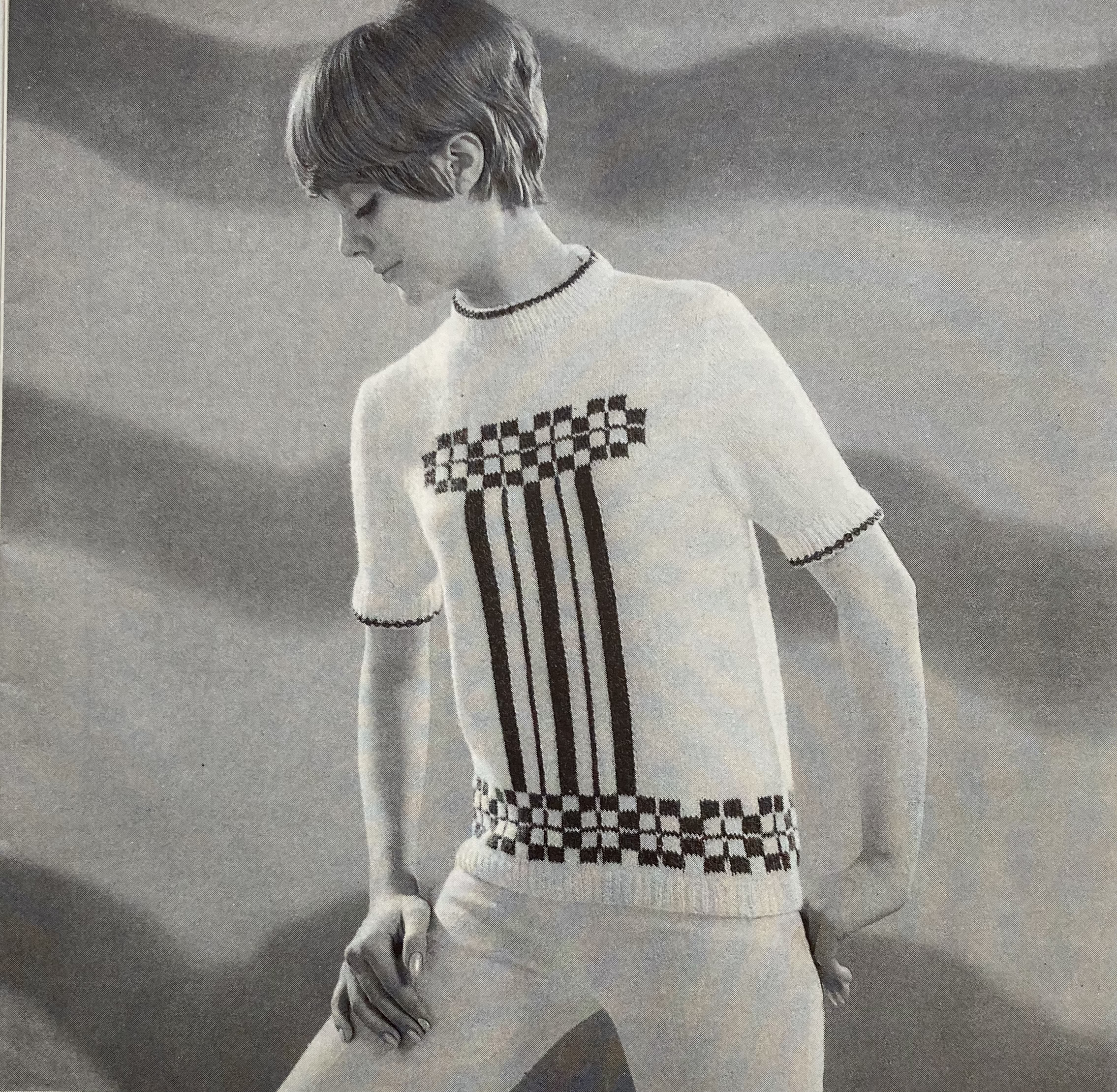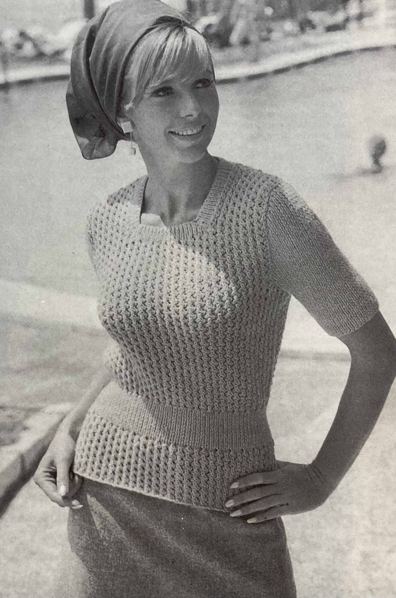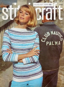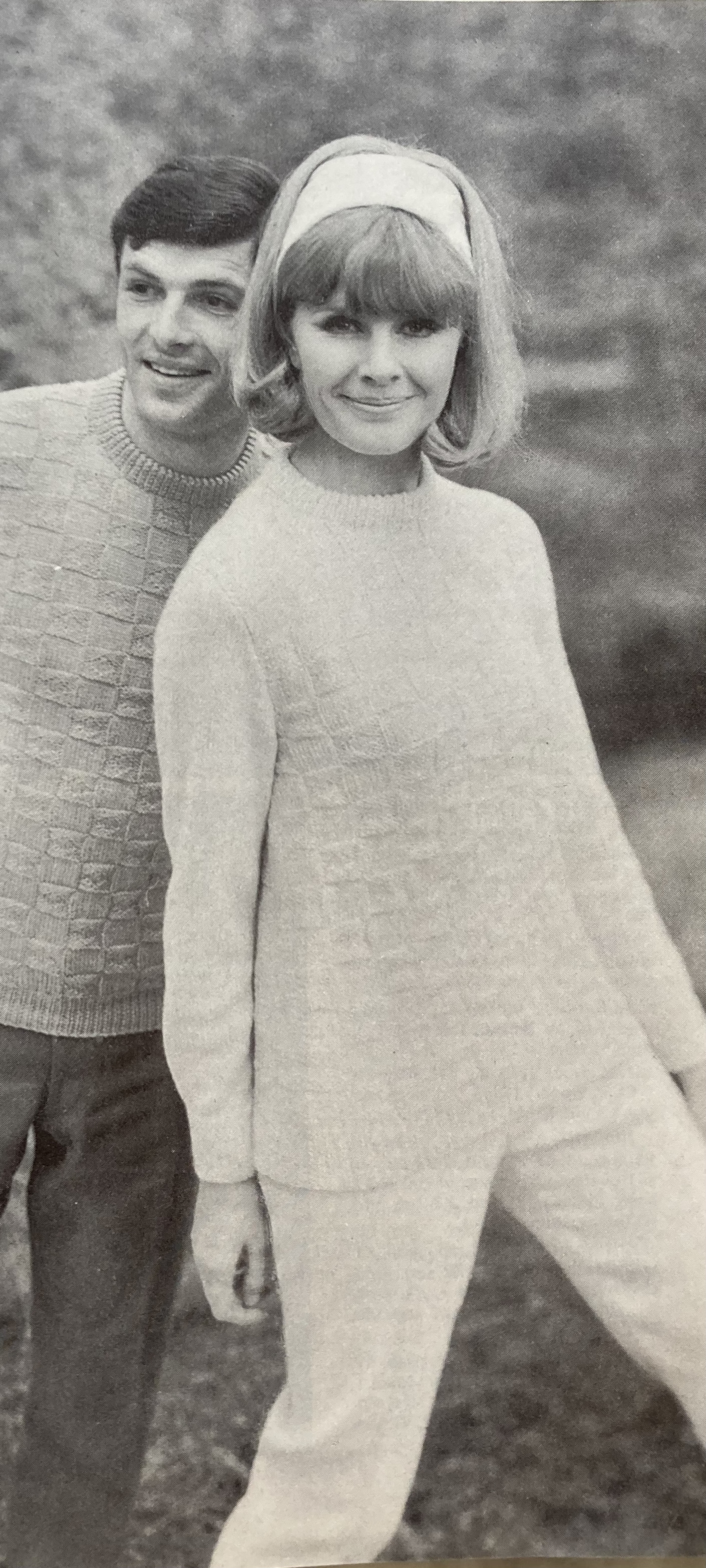 Continuing the stripe/check theme for men, there’s a nice V-neck waistcoat in a very 1960s-typical colour combination of charcoal and mustard (don’t eat it). The pattern is made stranded, and very easy, and the front and hem borders are made in one long strip, sewn in position as you go along. I have personally never had much success with this method, as you are supposed to stretch the strip “slightly” while sewing on and I find it difficult to get exactly the right, and same, amount of tension on both sides. There’a also a “his and hers” unisex pullover in a similar basketweave stitch as the short-sleeved blouse that I made from the June 1966 issue. Apropos unisex: this issue features a record number of women wearing slacks, and the short “pixie” or “five-point” cut has finally made it to the pages of Stitchcraft.