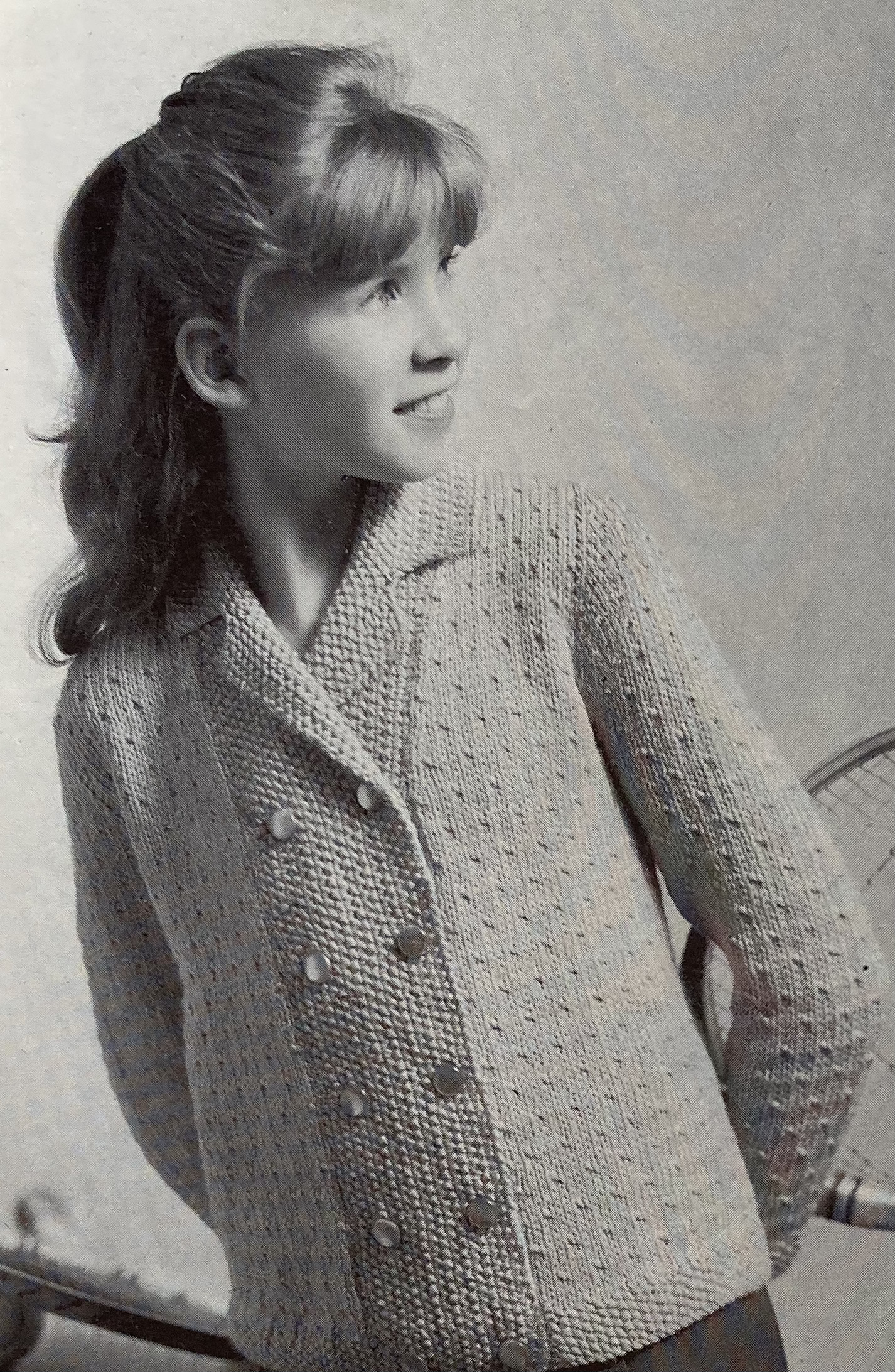 There’s nothing for babies or toddlers in this issue. Older kids and pre-teens get casual cardigans for layering or as outdoor garments. The stripe trend lives on in the boy’s zipped jacket, made in nautical colours of navy blue, red, and white. The girl’s tennis blazer is more subdued, in a neat spot-stitch pattern with moss-stitch revers. Top it off with a fun crocheted hat in the current “tall” style.