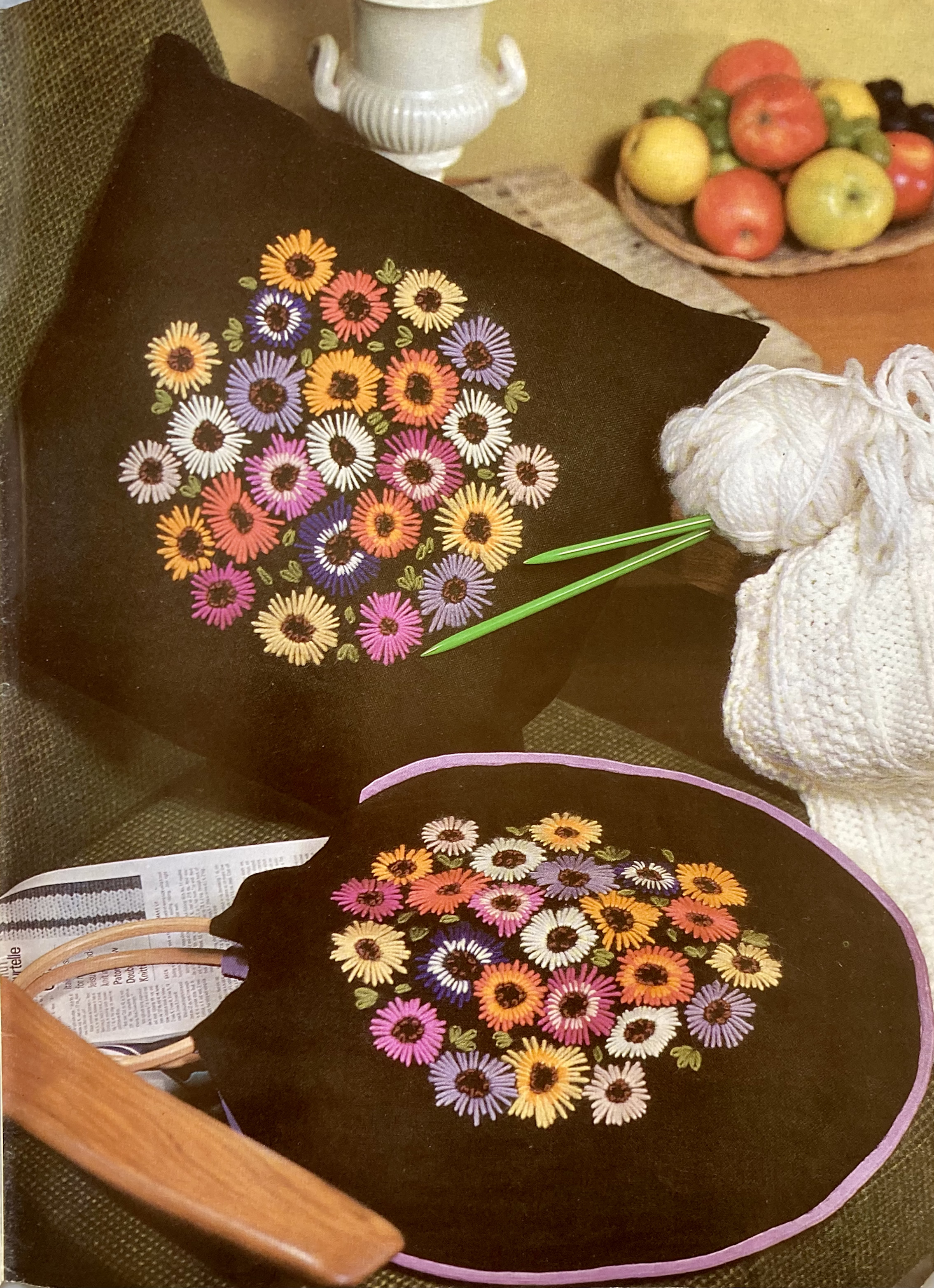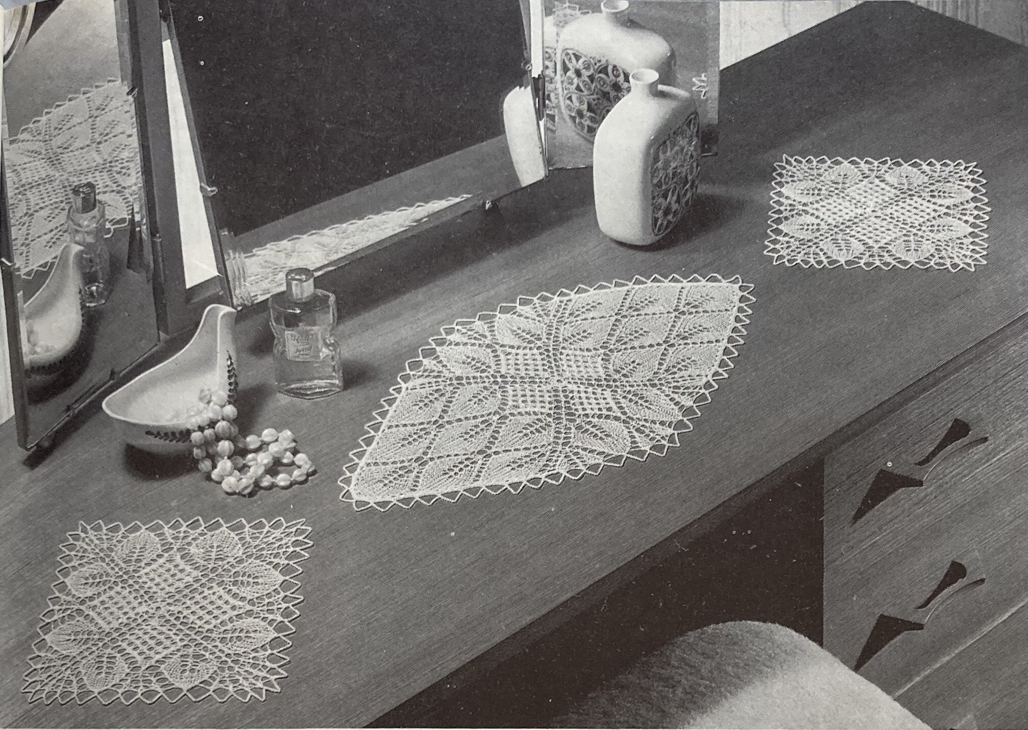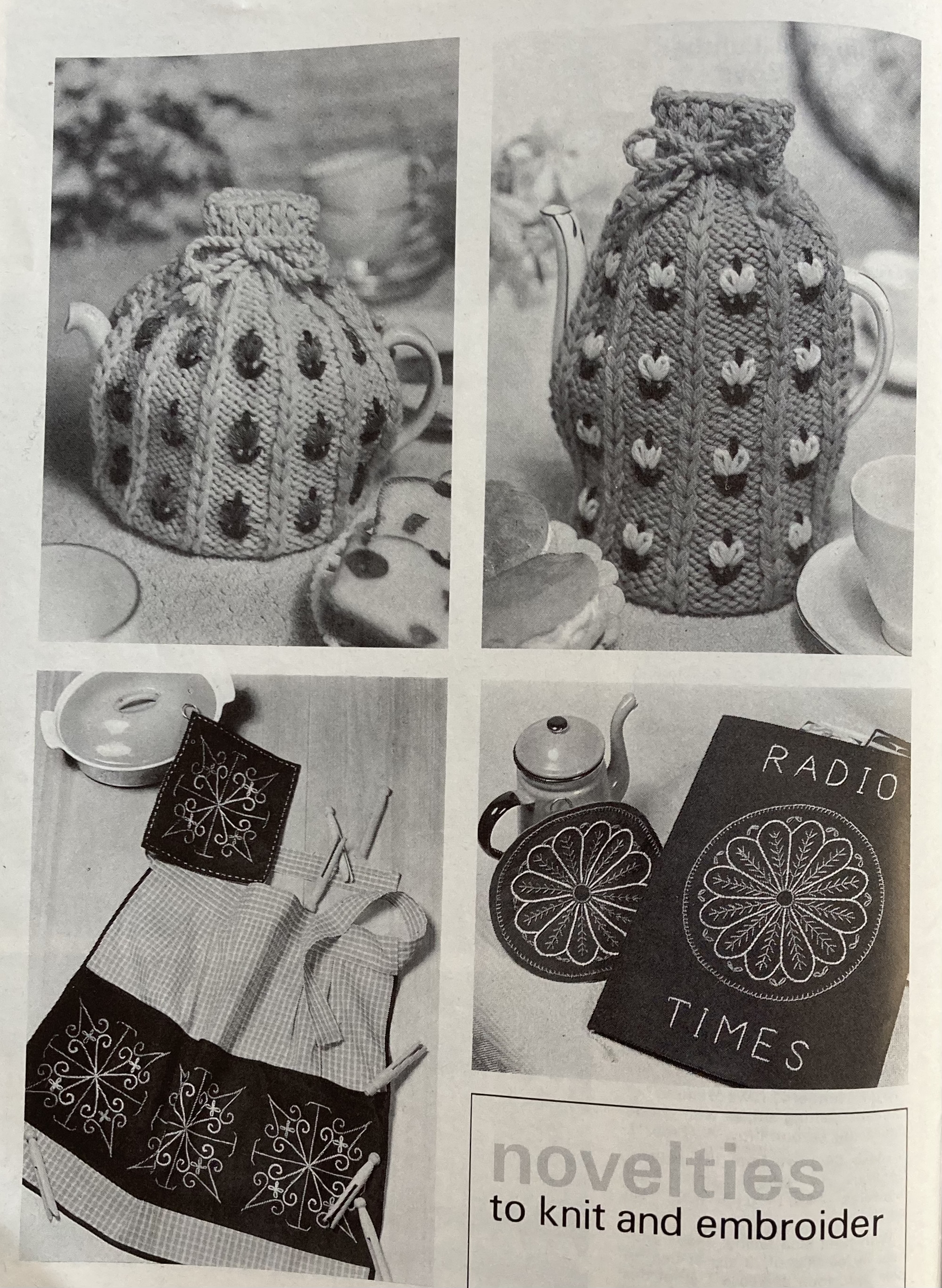 Those who do not like to hold wool in summer are always well served by the summer homeware designs, which tend to be small and easy — to pack in your holiday luggage and work on in your beach chair. There’s the usual page of bazaar items and “novelties”. I can’t make the bizarre-bazaar joke this time, since they are actually quite cute and nice. The fancy knitted lace mats are a more elaborate, but still portable, project, or you can embroider Mesembryanthemums on a cushion or workbag. I had never heard of this type of plant, hence the Wikipedia link in case you haven’t either.