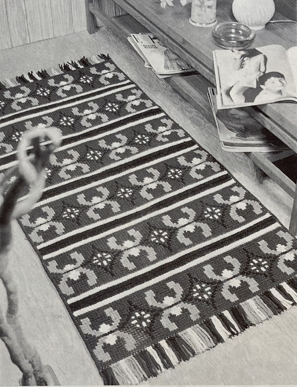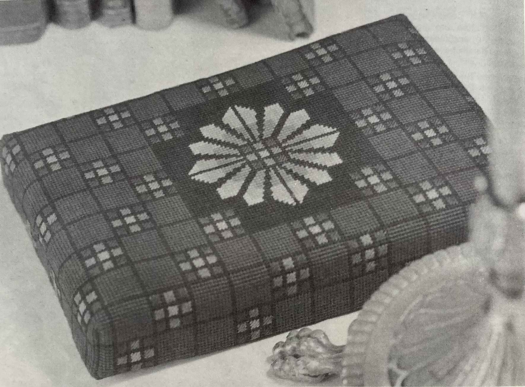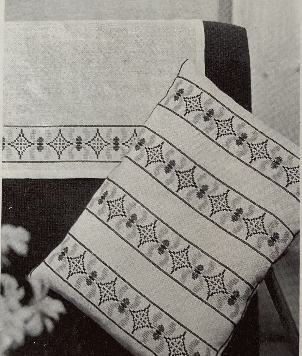The other homewares are more suited to making at home. There’s a cross-stitch cushion and/or chairback in a traditional Greek pattern (says Stitchcraft — I cannot confirm or deny authenticity) and a rug in a matching colour scheme. For churchgoers, there’s a tapestry kneeler with a pattern inspired by stained-glass windows. The stripe-check trend that we see in the garments appears again in the woven-tapestry wool cushion and knitting bag.