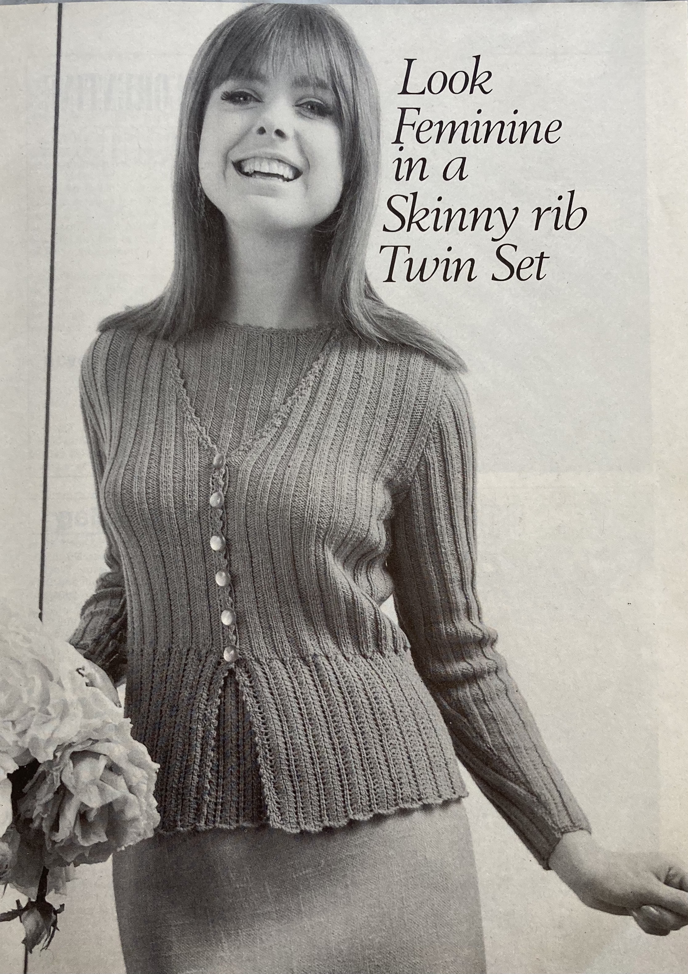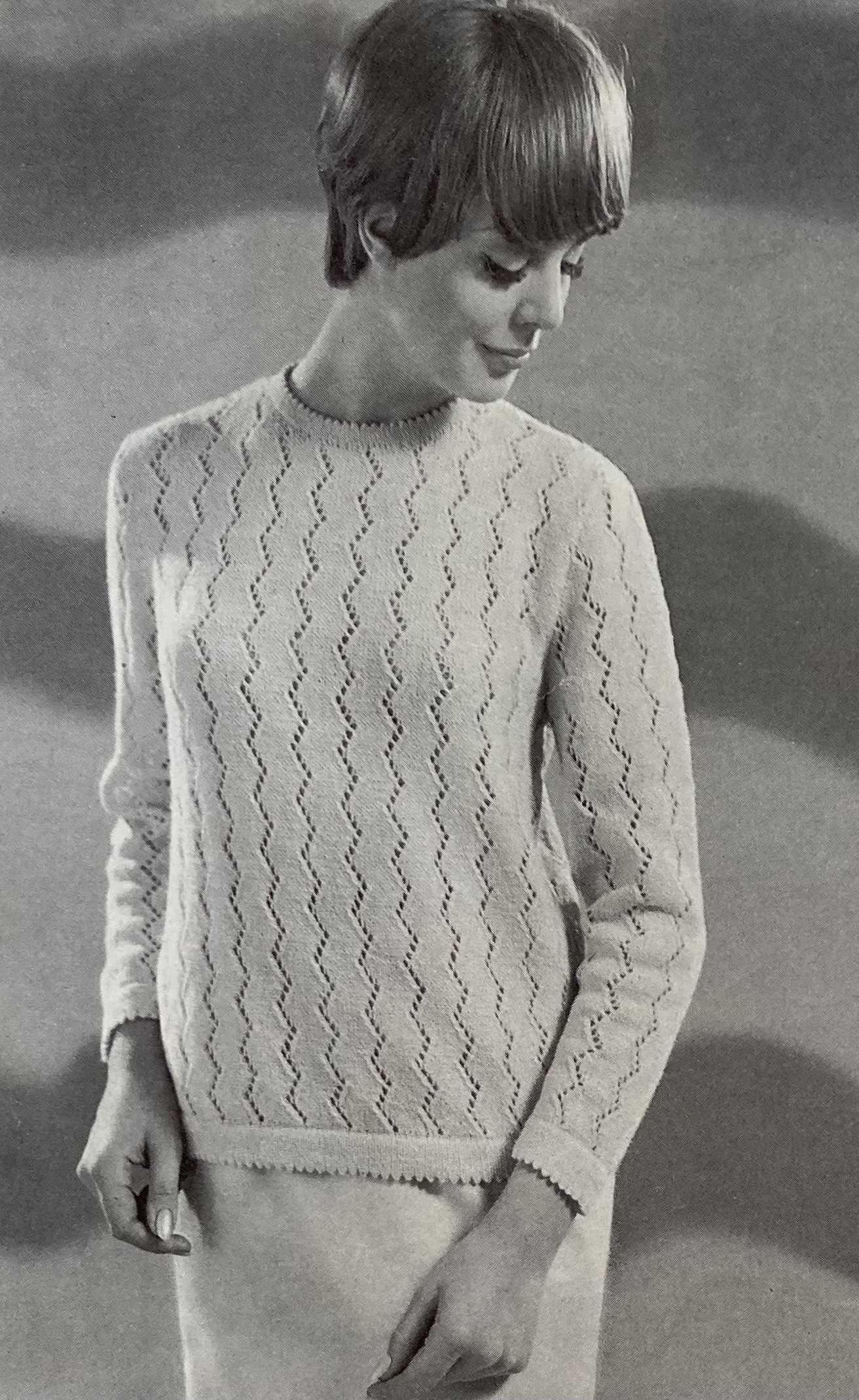 The more elegant designs are made in lightweight wools: a “skinny rib” twin set which promises to be flattering for both young and older women, with pearl buttons and a peplum-like “skirt” in ribbed lace, or a lace blouse with zig-zag motifs in both the lace and the picot hems. Here, the “stripe” trend is interpreted via pattern instead of colour.