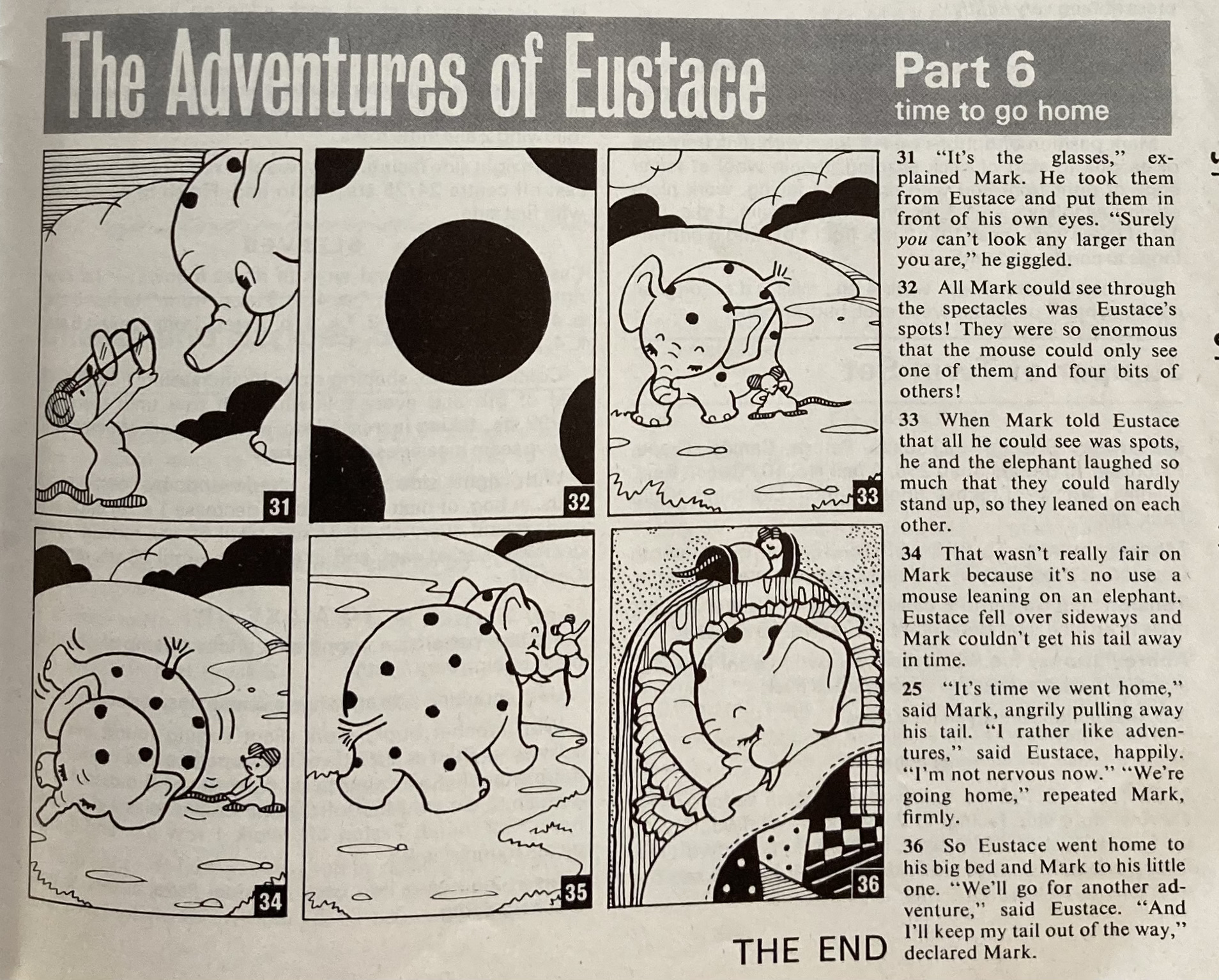 The “Readers Pages” give us a reprint of a July 1963 design for two little cross-stitch pictures, some helpful hints on mounting tapestry designs (mount it on cardboard with pins or threads and check that the tension on the right side is even), and the conclusion of our latest children’s serial comic, “The Adventures of Eustace”. For those who haven’t been keeping up (including myself; this story was not one of the more interesting ones), Eustace is an elephant who went on some very tame adventures (highlights: eating buns for tea, looking through glasses the wrong way) with his friend Mark, the mouse. Mark calls an end to the adventure and the comic, and they go home and have a nap. That sounds like my kind of summer adventure.