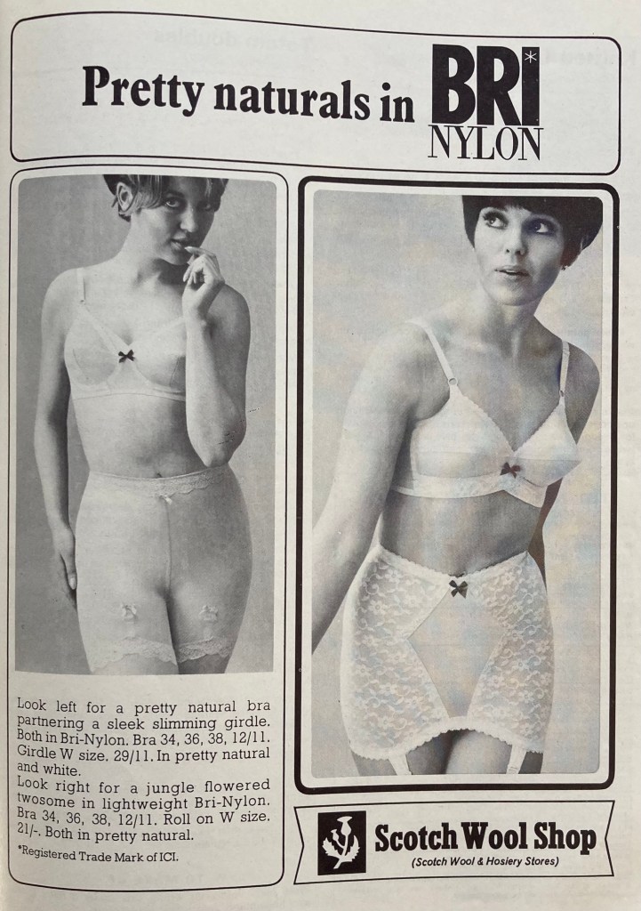 I will leave you with this ad for “pretty natural” underwear from the Scotch Wool Shop. The underwear is made from extremely synthetic Bri-Nylon and is intended to shape one’s body in directions it doesn’t go by itself, so the only “natural” thing going on here is the colour, if you have pale beige skin. But it is quite pretty.