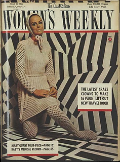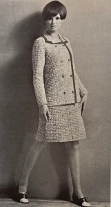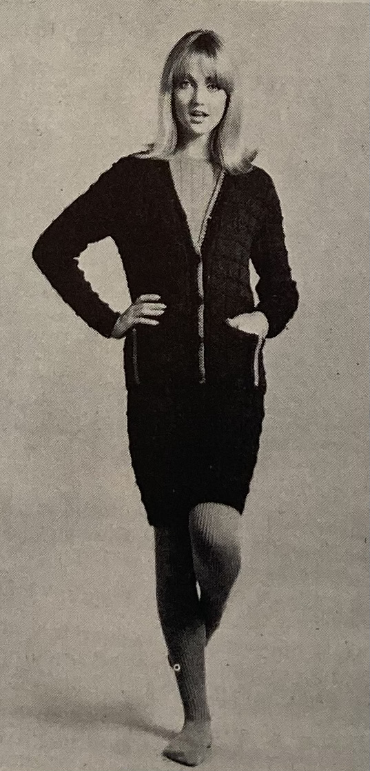 The idea of complete coordination came into handknit fashion around this time and continued into the early 1970s. Mary Quant, for example, designed a four-piece outfit (jumper, skirt, stockings and “bonnet” cap) for the Australian Women’s Weekly in March 1966, using Patons Courtelle wool. There was originally an entire supplement in this month’s issue of Stitchcraft with more “Total Look” fashions in the same 101 Courtelle, but sadly, it was no longer there when I acquired it. If anyone happens to have this supplement, please let me know and/or post about it here! I would love to know what was in it.
