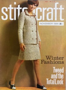 Tweed, Crepe and the Total Look! The November 1966 issue of Stitchcraft brings together contrasting styles of nubbly tweed and smooth crepe wool as well as an entirely coordinated knitted outfit including hand-knitted stockings.