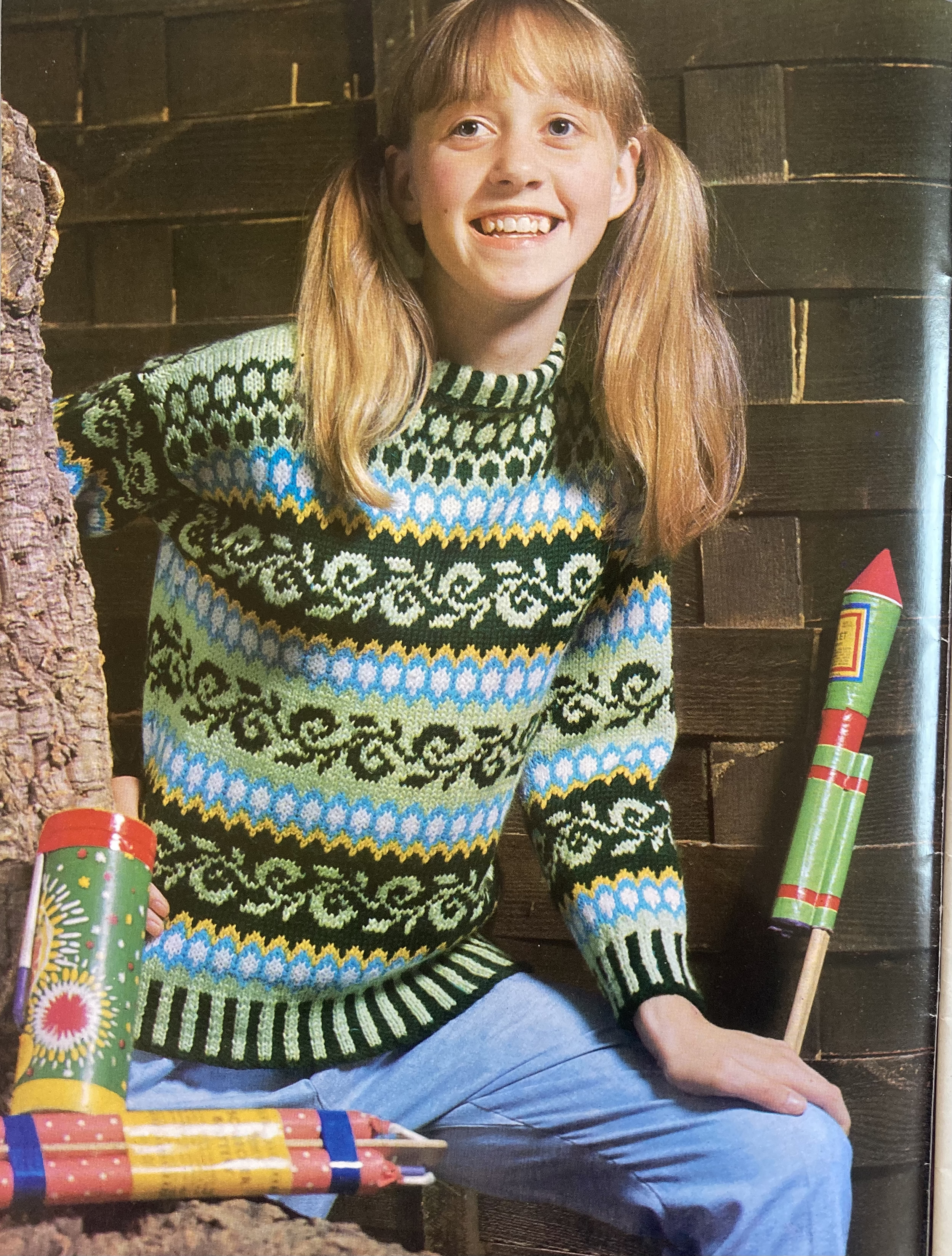 The “Junior Fashions” for girls consist of a bright, fun “Viennese Sports Sweater” in a bold Fair Isle pattern and a cabled and colour-blocked pullover in soft tones of white, blue and rose. The older girl has her fireworks ready, perhaps for Guy Fawkes Night on November 5th, while the younger one is content to play with her dolls.