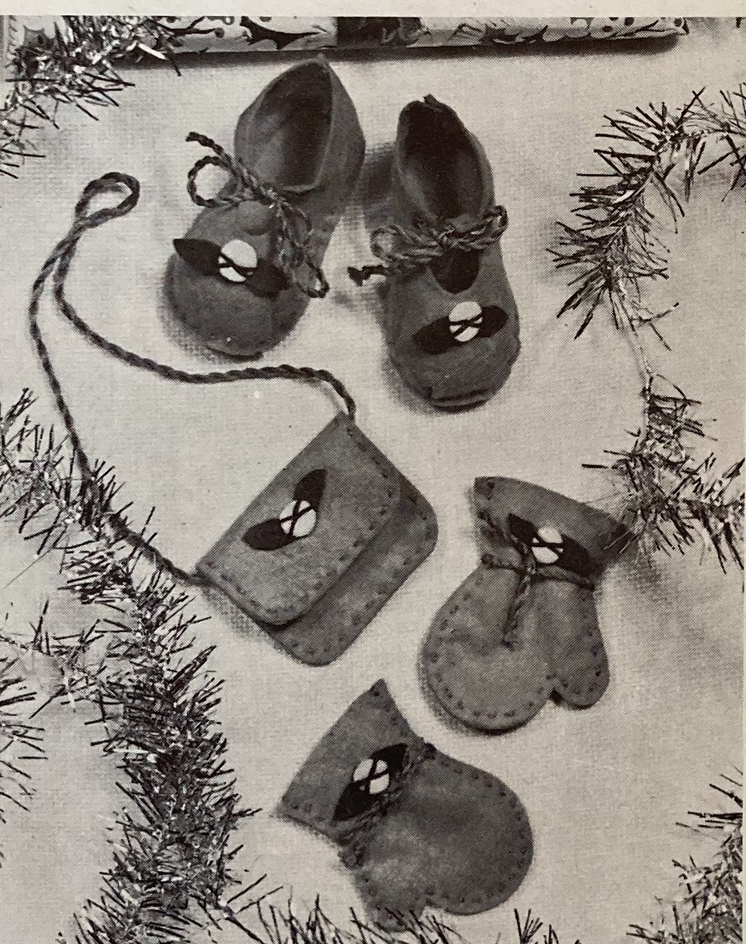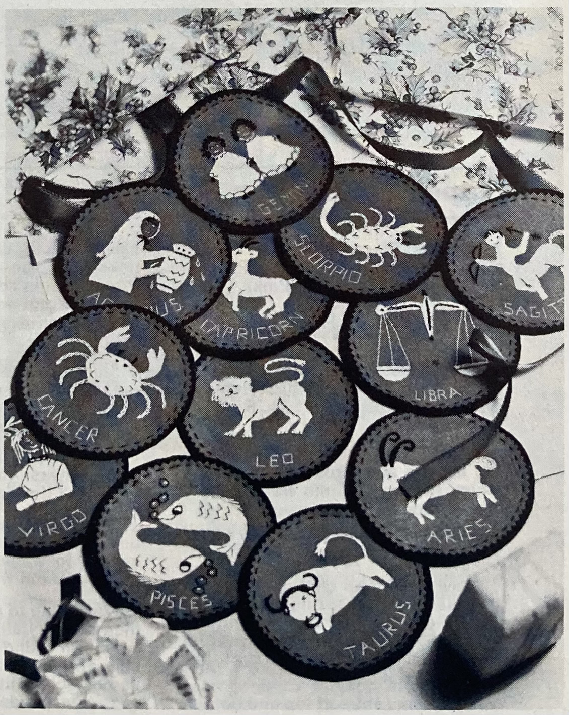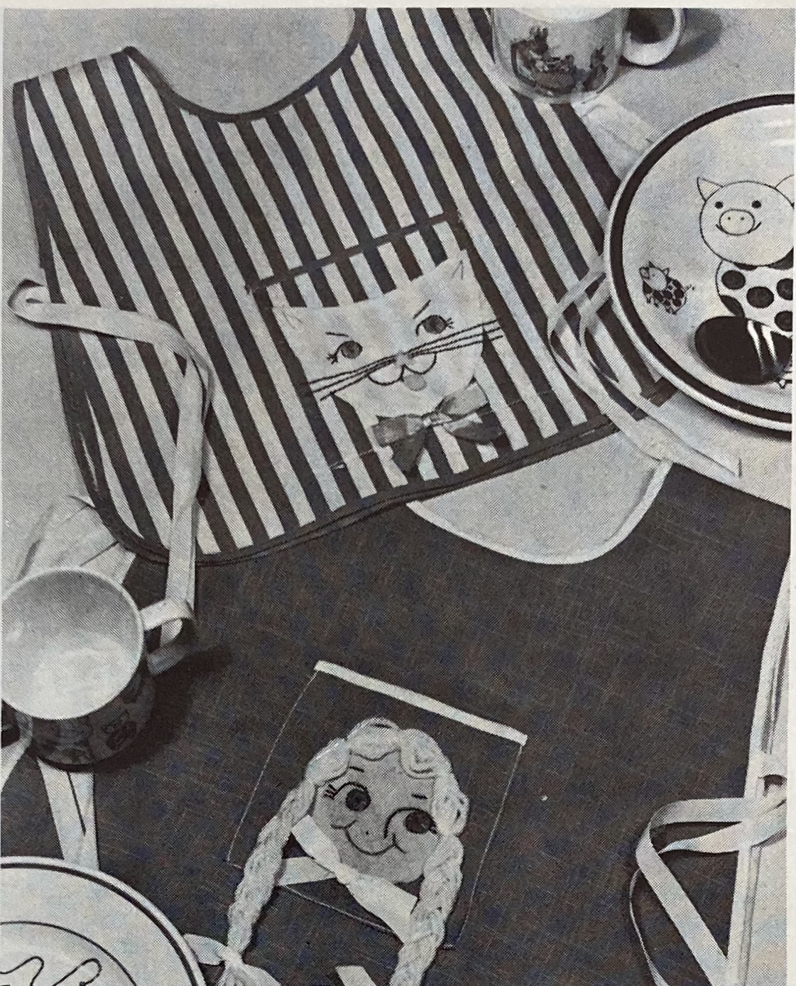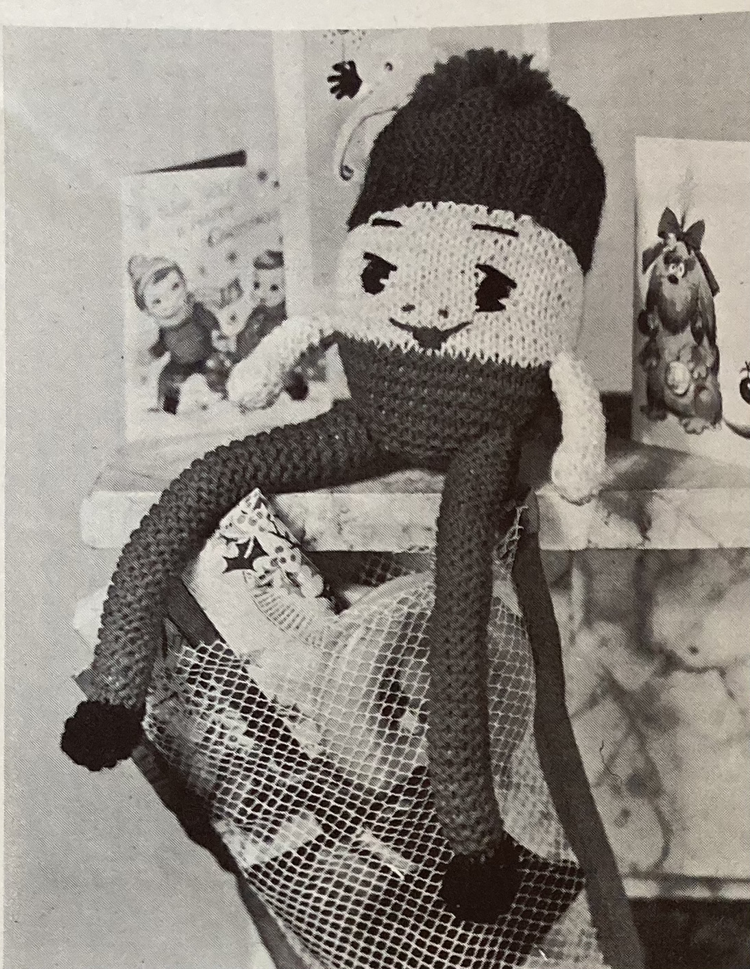 Gearing up for the Christmas season, we have a double page of weird and/or wonderful little gifts to knit, sew or embroider. For some reason, Stitchcraft really likes Humpty Dumpty, who appears in many forms as a toy, puppet, doll etc. over the years. Here, he “tops a stocking”. There are tiny felt accessories for a doll, sewn and decorated pinafore bibs for a baby or toddler, or coasters with the signs of the Zodiac in embroidered felt appliqué.