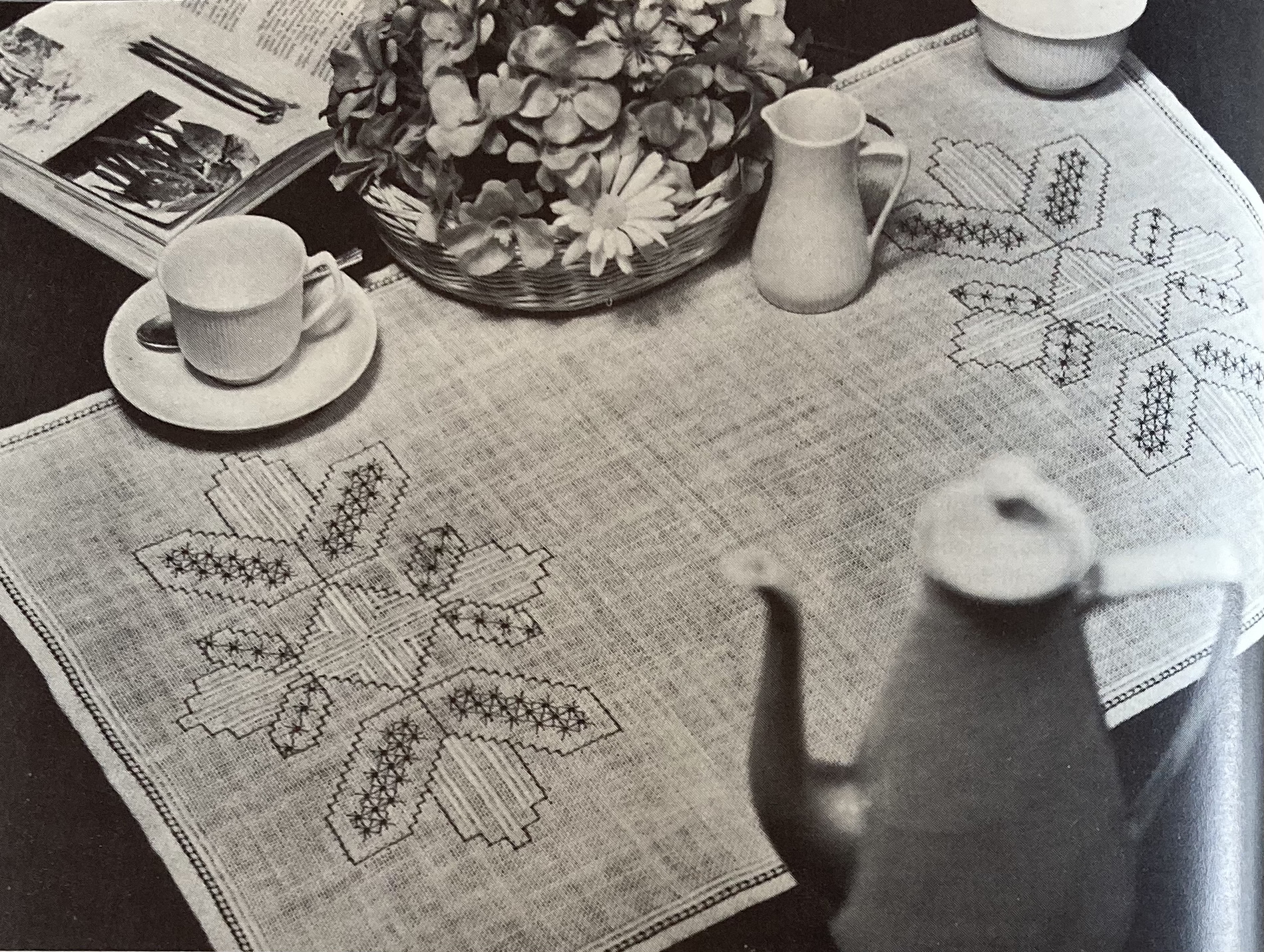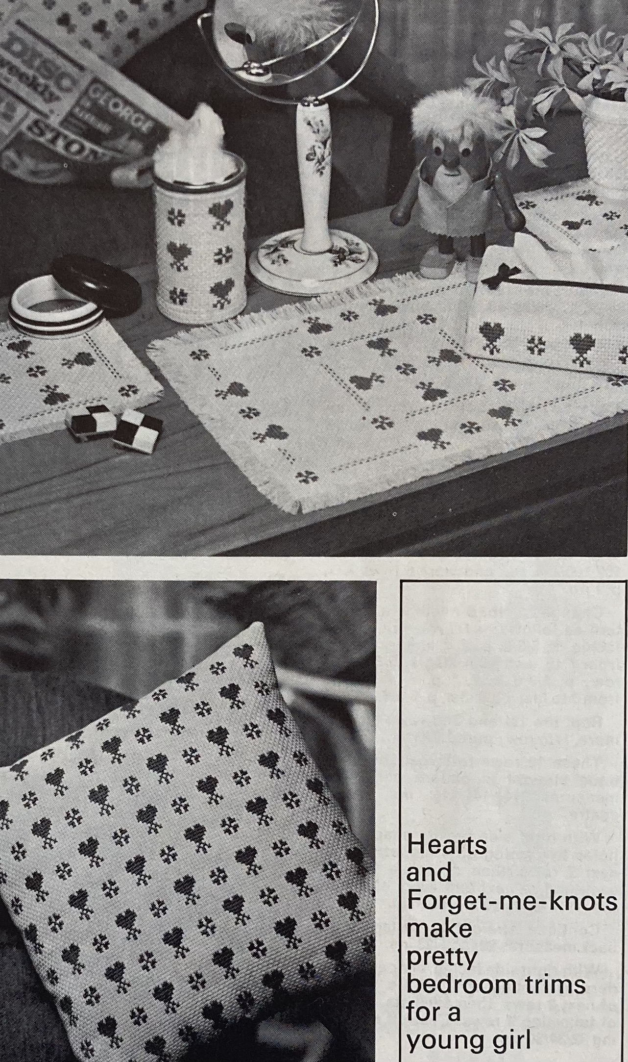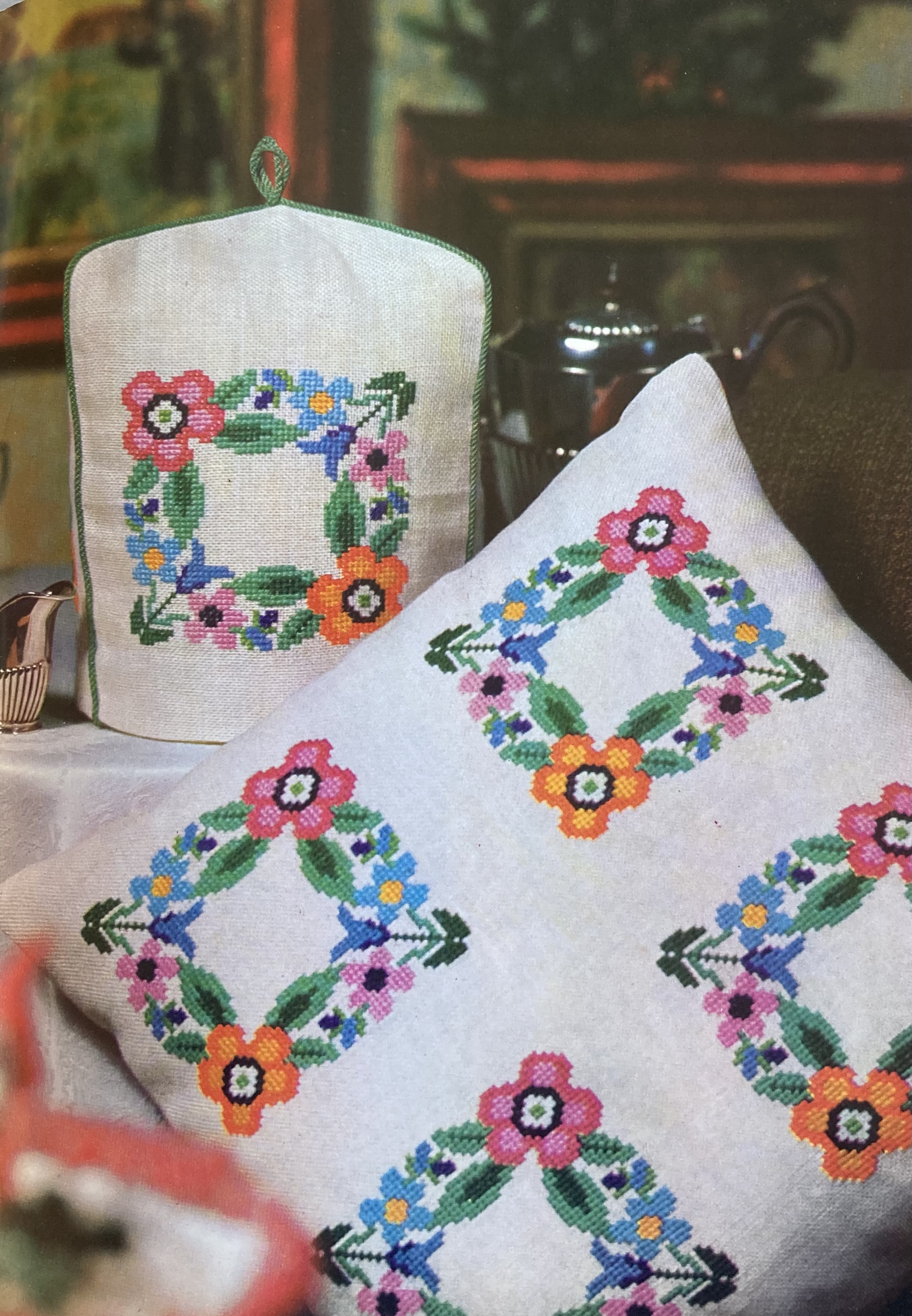 Larger tapestry and embroidery projects include a tapestry evening bag in rosebud pattern, mats and cushion in counted stitch for a girl’s bedroom, drawn-fabric table linens or a cushion and matching tea cosy in a bright floral cross-stitch pattern. I seem to remember the rosebud bag from an earlier project in 1961 that had a similar design. (That project didn’t work out and I don’t think I’ll be making another tapestry handbag anytime soon.)