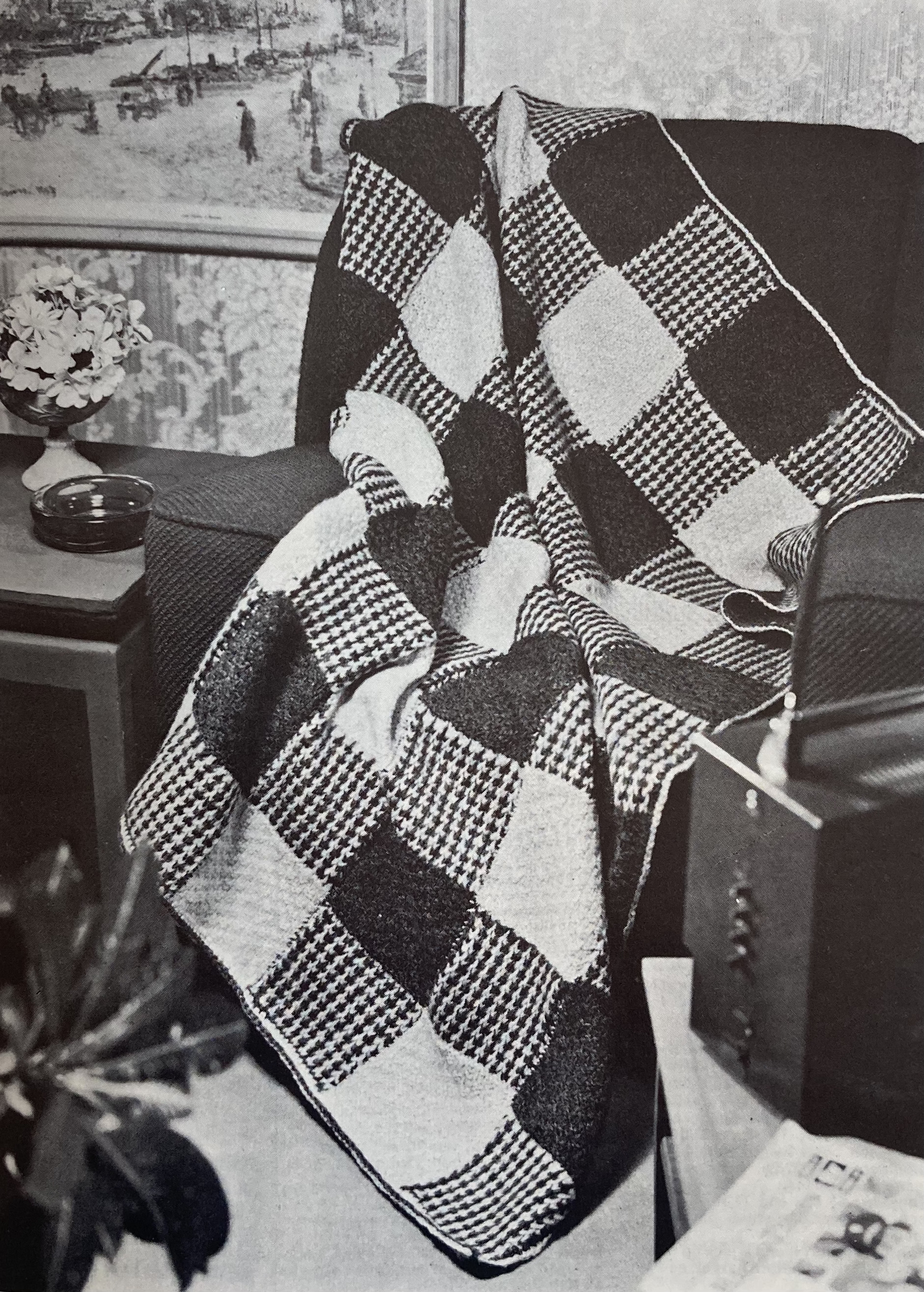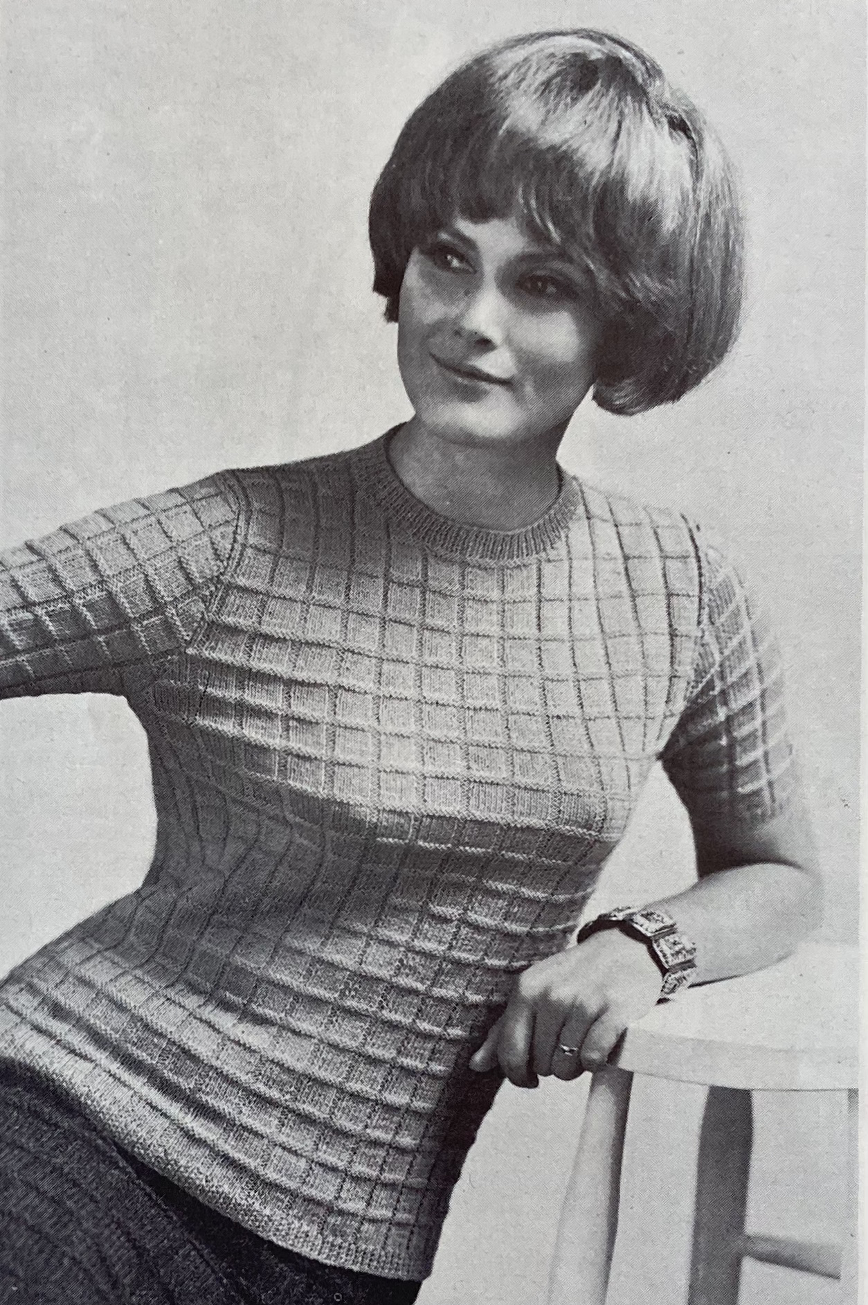 The “Total Look” is best exemplified by the other suit design: a square-patterned cardigan suit with jumper and stockings to match, in two shades of Double Knitting for the suit as well as lightweight Cameo Crepe for the jumper and stretchy, hard-wearing Nylox for the stockings.