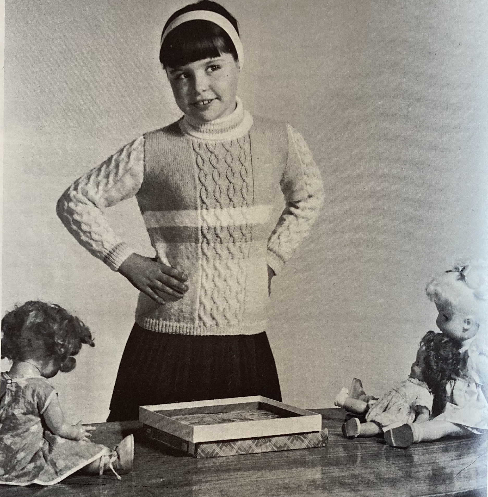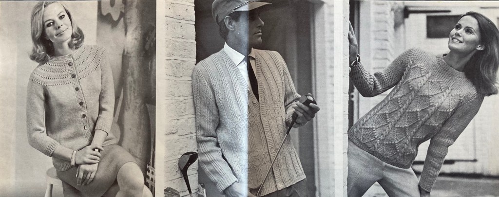 The other fashions for adult men and women feature textured stitches in heavier wools for winter and a round-yoke cardigan knit from the top down in one piece. Although quite common today, that was still a very unusual construction method in the 1960s and was captioned as an “interesting design for the knitter who likes something different.” The men’s cardigan has a “Continental Pattern” made quite easily by combining knit, purl and knit-through-the-back stitches, and the women’s pullover has a unique cable-and-bobble pattern that makes a pretty shell design.