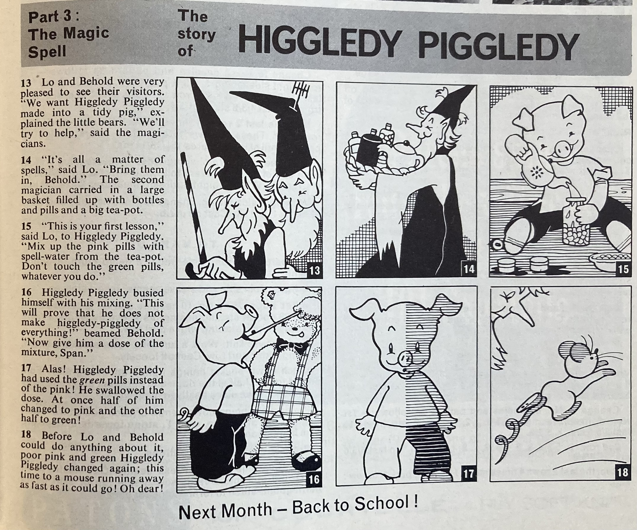 To finish it all off, you can knit a warm afghan for the coming winter evenings by the fireside, or crochet a practical potholder as many of us did in school. In the children’s comic, untidy piglet Higgledy Piggledy ignores the instructions given to him by the magicians who are supposed to change him into a tidy clean piglet, mixes the wrong potion and turns into a pink and green mouse. Good for him, I say! I am a neat and tidy person myself, but I have to admit I am rooting for Higgledy Piggledy in this comic. Will Higgledy Mouse escape the authoritarian rule of cleanliness? Tune in next time to find out!