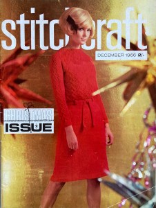 The December 1966 issue of Stitchcraft had some lovely items in it, but the ones I liked best were too time-consuming or impractical to make in the middle of a busy season. For example, I loved the dress on the cover, with its criss-cross stitch pattern on the bodice and sleeves, but didn’t have the time or energy to make a whole dress. I decided to adapt the sleeve pattern to make a pair of long fingerless gloves.