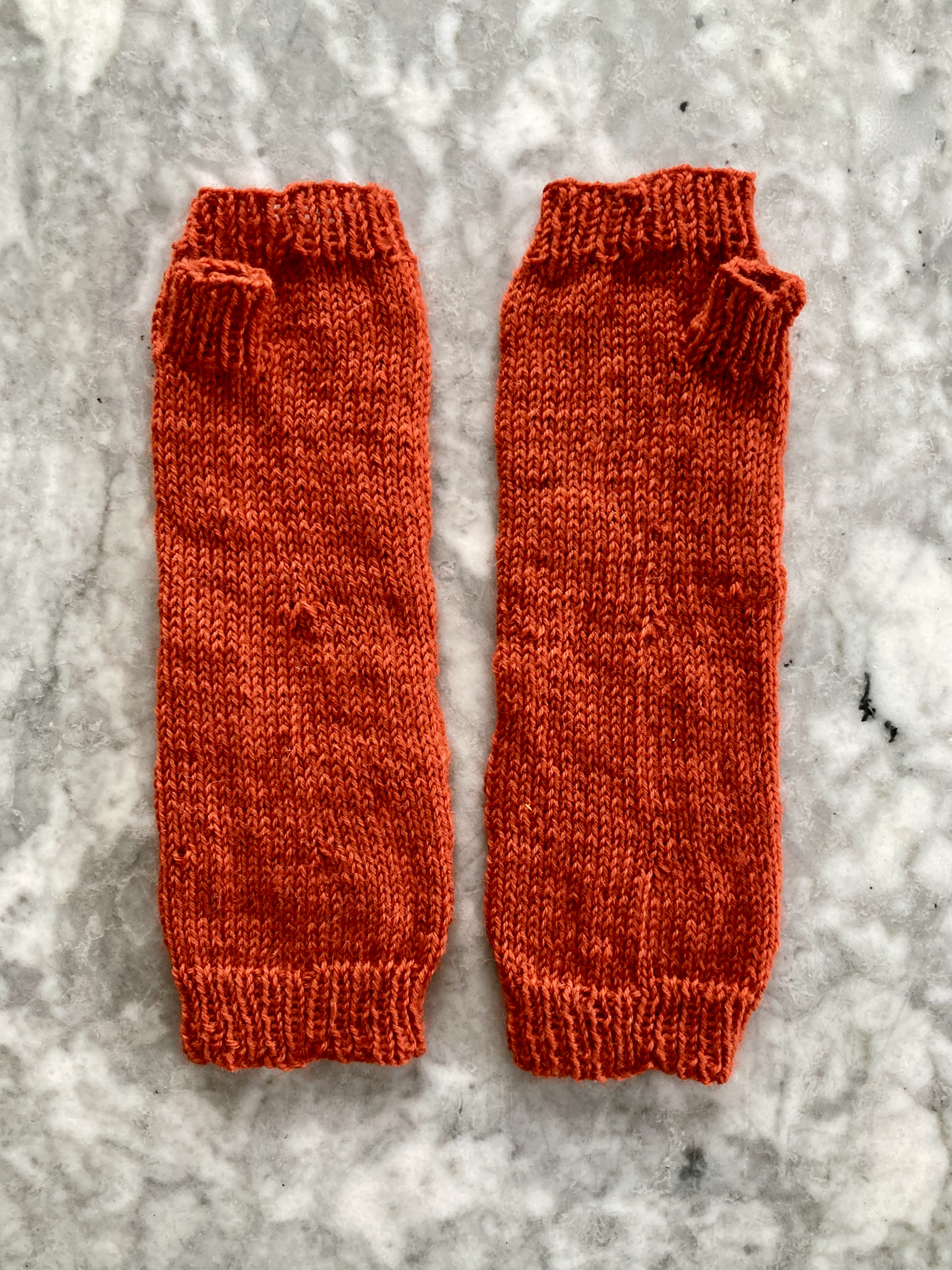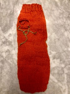 The dress pattern has sort of “bracelet” length sleeves, i.e. deliberately a bit too short, so I figured the mitt ribbing would rest at roughly the same spot on the arm as the cuff ribbing of the dress. I started the mitts there, at the arm, on 48 stitches (dress pattern has 49, but seamed — I made the mitts in the round) and worked toward the hand. After the first pattern, I decreased for the wrist to 46 stitches, then to 44 on the fourth pattern. I made an afterthought thumb on pattern repeat 6, then decreased down to 40 stitches for the hand ribbing. The thumb had 6 “afterthought” stitches top and bottom, and I picked up 6 more for a total of 18.