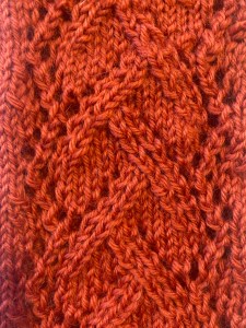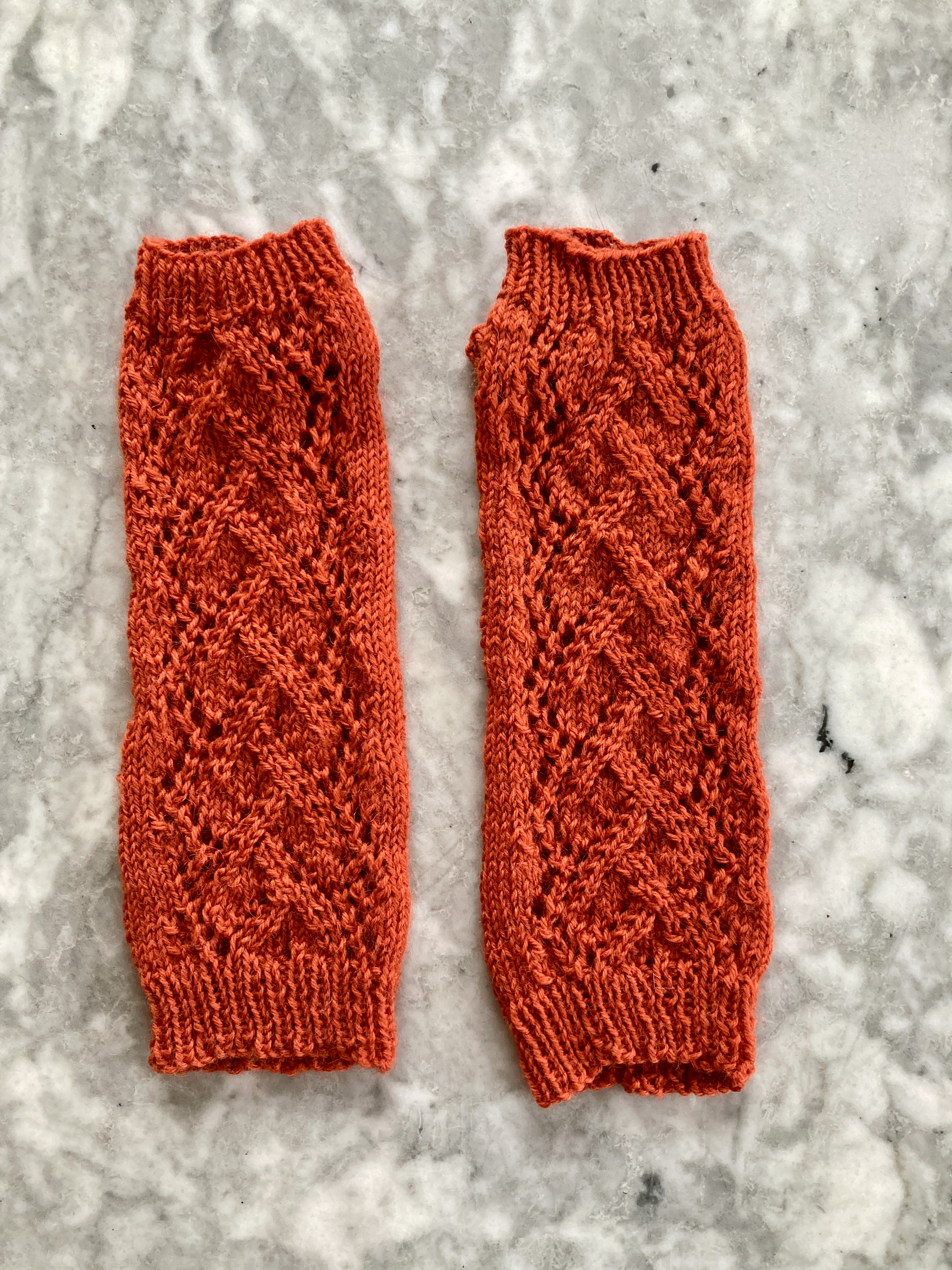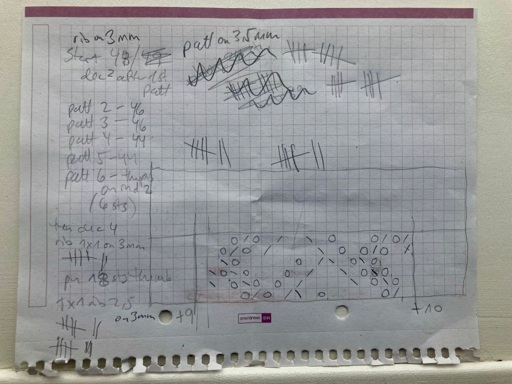 And that was it! Easy peasy. Well, almost. I admit that the the stitch pattern was more complicated and “illogical” (as in, in was hard to memorise or “instinctively” know what was coming next in each round) than I had expected. I charted it out, which helped — the pattern in the magazine is written out in words only and it is easy to get lost in a sea of “k2, yo, sl1, k1, psso, yo, k1, k2tog” etc. I am way too lazy to write this out as a proper pattern and try to sell it on Ravelry, but here are my scribbled notes, if anyone wants to make their own version. The hash marks show the number of rows in the ribbing – 10 at the beginning and 7 at hand and thumb — and the chart only shows the odd-numbered rows 1, 3, 5, 7, 9 and 11 –the even-numbered rows are all knit (in the round). The mitts fit fine on my size-8 hand. but of course, since the pattern is only on the top side of the mitt, you could easily add or subtract from the plain stitches on both sides to make them larger or smaller.