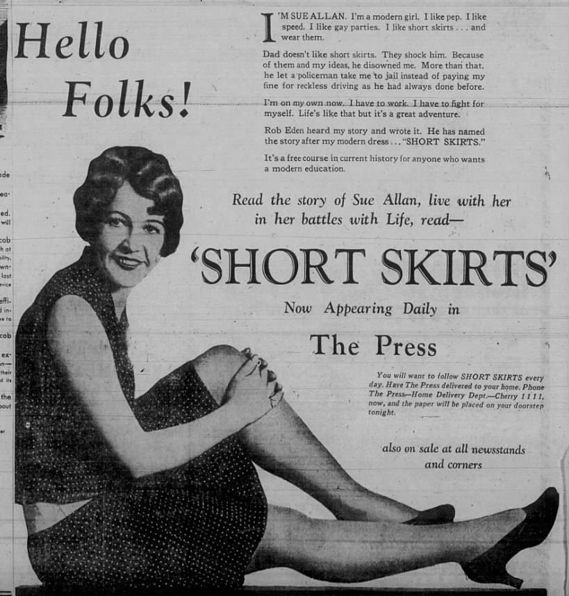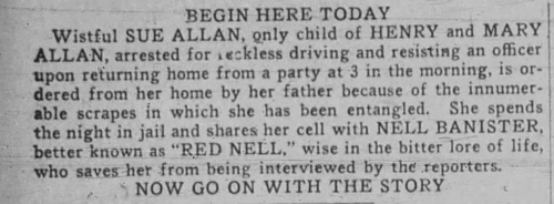 Well, the current story is… drum roll, please… the 1929 novelette “Short Skirts” by Rob Eden (the pen name of the husband-and-wife duo of Eve and Robert Ferdinand Burkhardt.) It recounts the thrilling adventures of Sue Allan, who crashes Daddy’s car in the first chapter, gets both arrested and disinherited, and spends the night in jail. There, she makes the acquaintance of Nell Bannister, a girl who has been around the block many more times than sweet, innocent Sue and takes her under her wing.