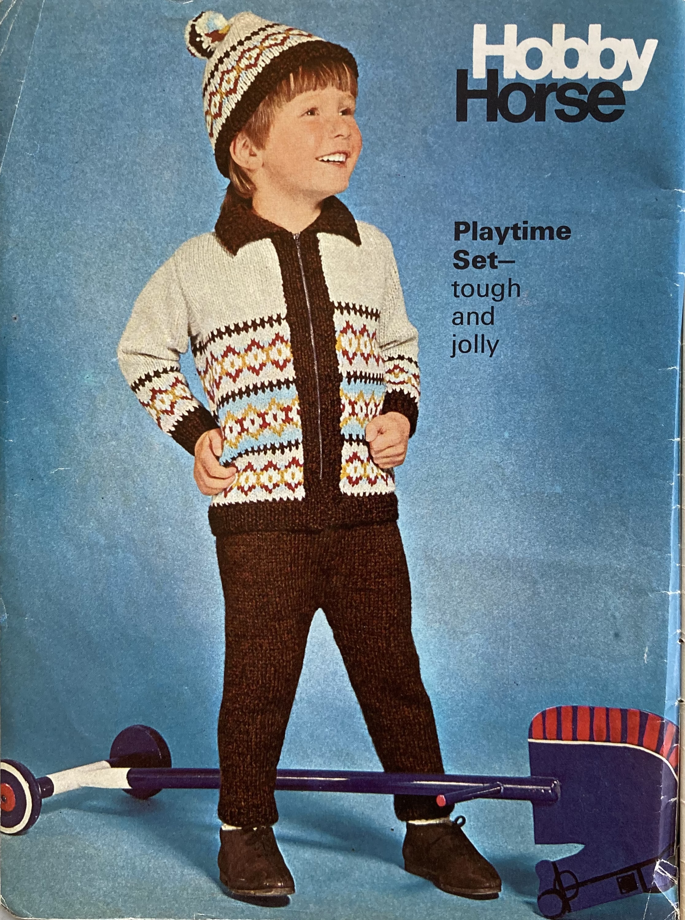 For the youngest in the family, there’s a babies’ cardigan and matching trunks (for boys — girls have to get used to a cold behind early in the age of bare-legged miniskirts and tunics). “For boys”, as well, there’s a “playtime set” of warm leggings, zipped cardigan and bobbled hat in a stranded colour pattern. Rebellious mothers could knit it for a girl, I suppose.