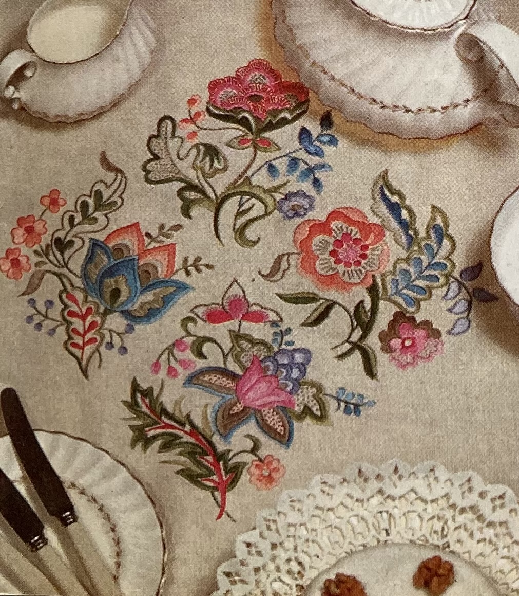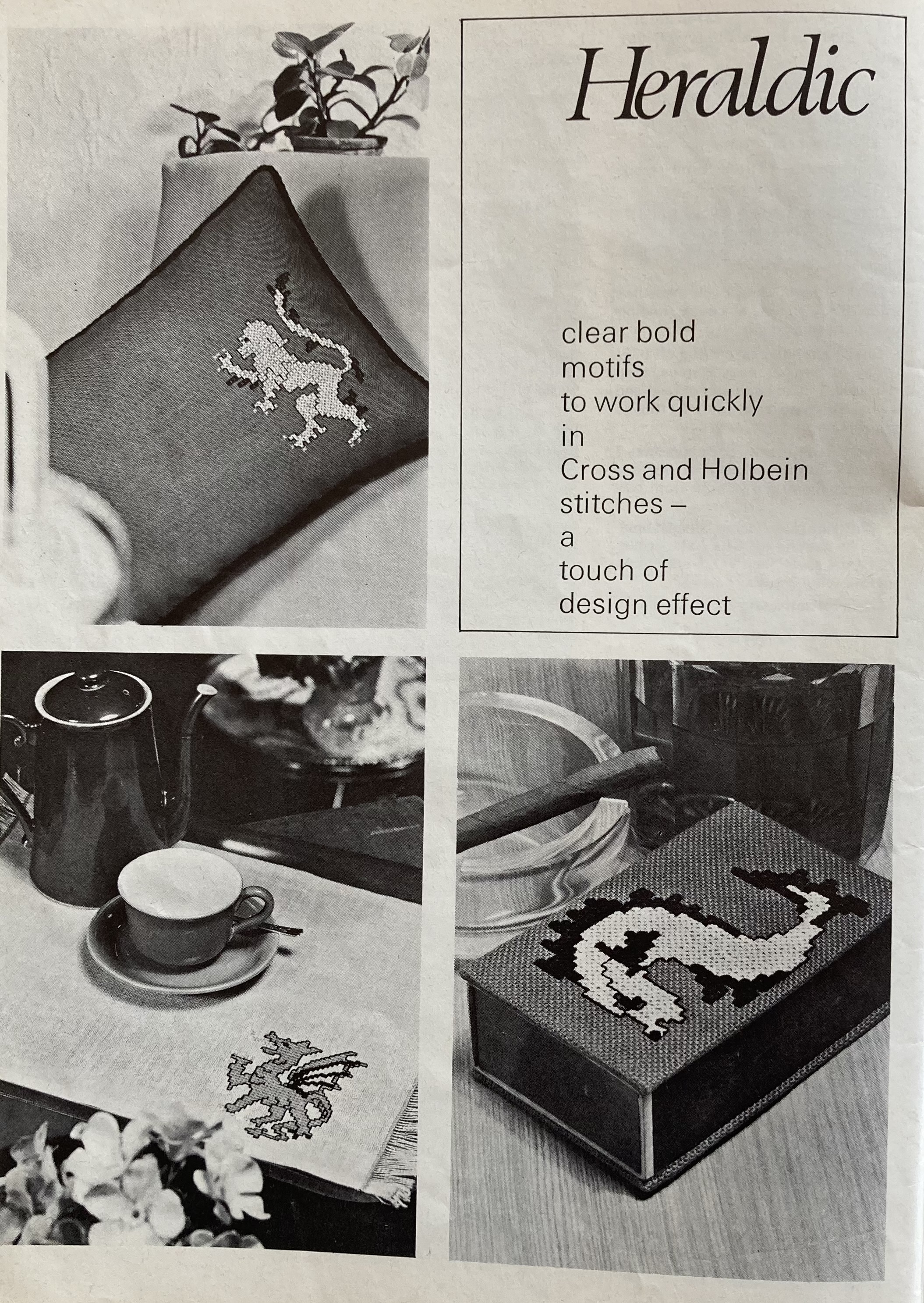 In the housewares department, there are multi-use heraldic designs of a unicorn, dragon, and fish to be worked in cross-stitch and Holbein stitch on a cushion cover, place mat, tray cloth or, interestingly, a matchbox cover. You embroider the cloth (two pieces), mount them on two pieces of cardboard and then glue them to the top and base of an existing matchbox of the larger sort that holds kitchen or fireplace matches. I actually really like the idea. There’s also a Jacobean crewel design that looks stunning on a black cushion or dainty and fancy on a white tablecloth.