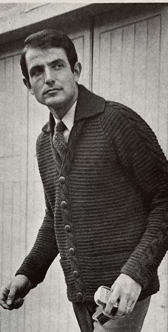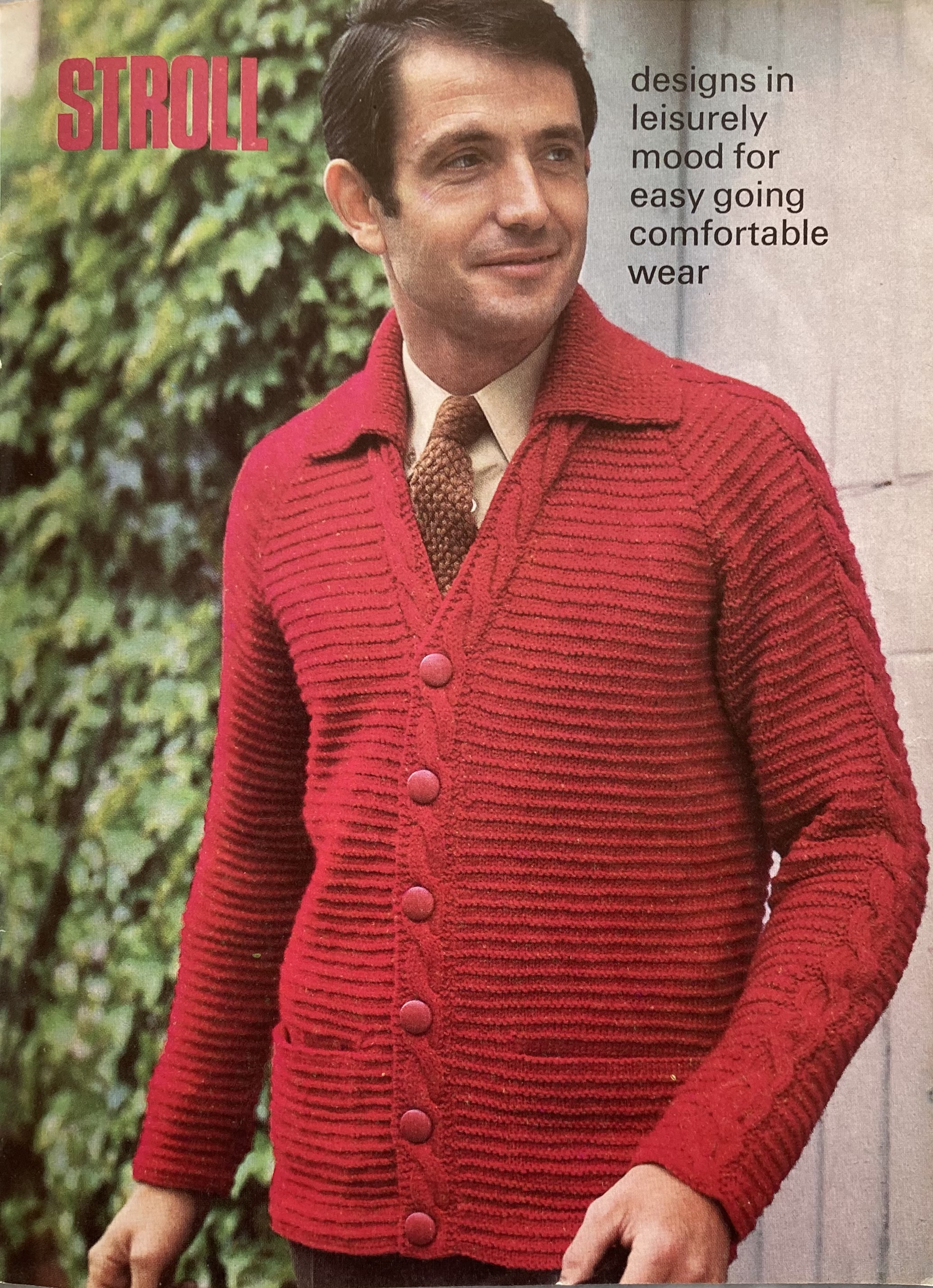 The two designs for men have a similar aesthetic to the women’s, but without the polo necks: a winter-white pullover with a simple cable pattern over reversed stocking stitch and a berry-red “stroller jacket” in a horizontal welt patttern with a nice use of cables on the saddle sleeves and button band. Note the knitted tie!