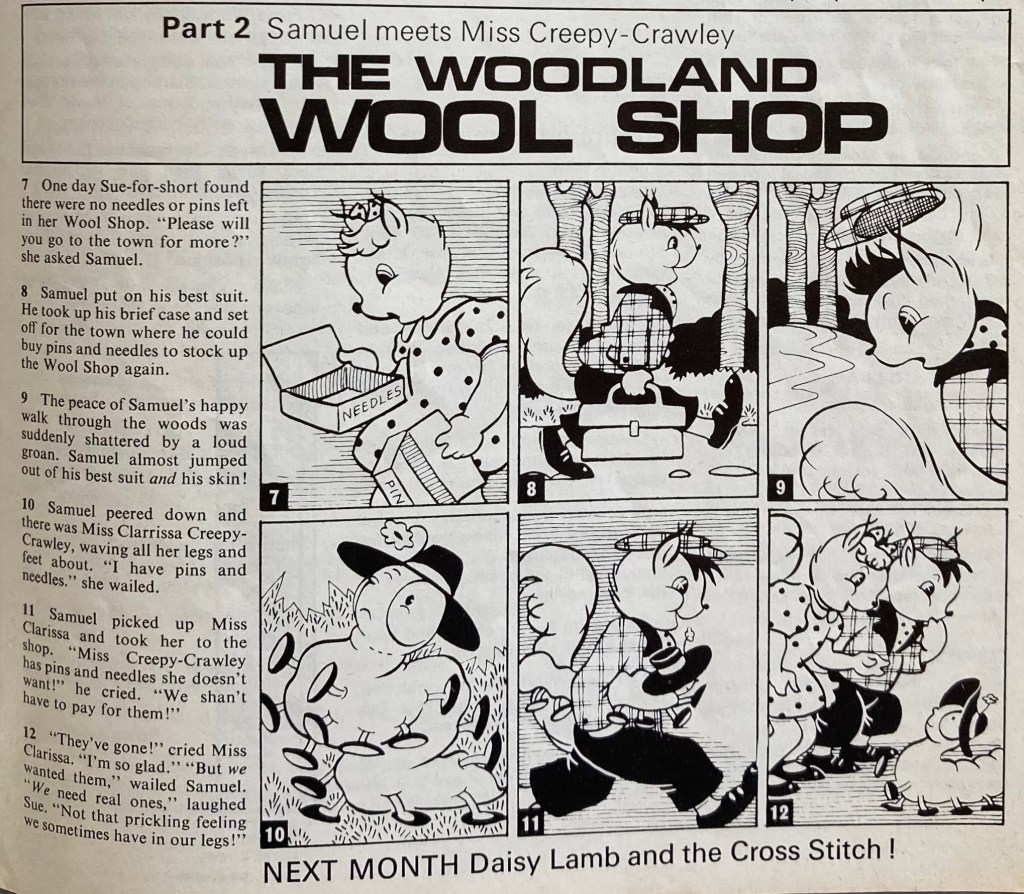 The ads are the usual ones for a sewing machine, Patons knitting books or “liver pills” to cure constipation, and the Readers Pages offer two reprints of popular items: little cross-stitch pictures of “Autumn” and “Winter” scenes for the nursery, or a cabled and bobbled ski hat that looks too small for any adult person’s head and would surely fly off if actually worn while skiing. In Part 2 of the children’s comic “The Woodland Wool Shop”, employee Samuel meets “Miss Clarissa Creepy-Crawley” (I’m sure there’s a Downton Abbey joke in there somewhere), a caterpillar with “pins and needles” — but not the kind Samuel has to buy! No fear, there’s a happy ending for all involved.