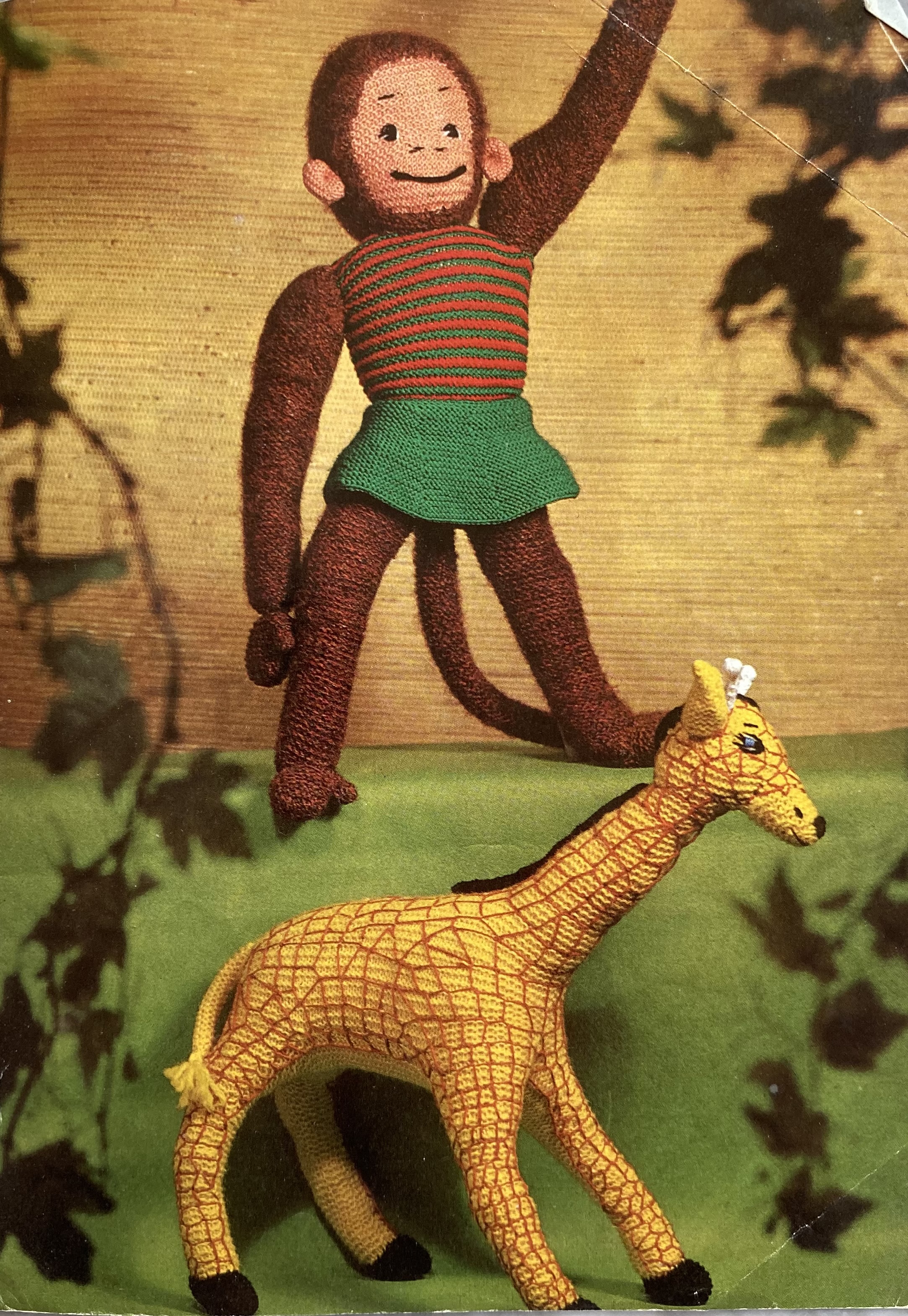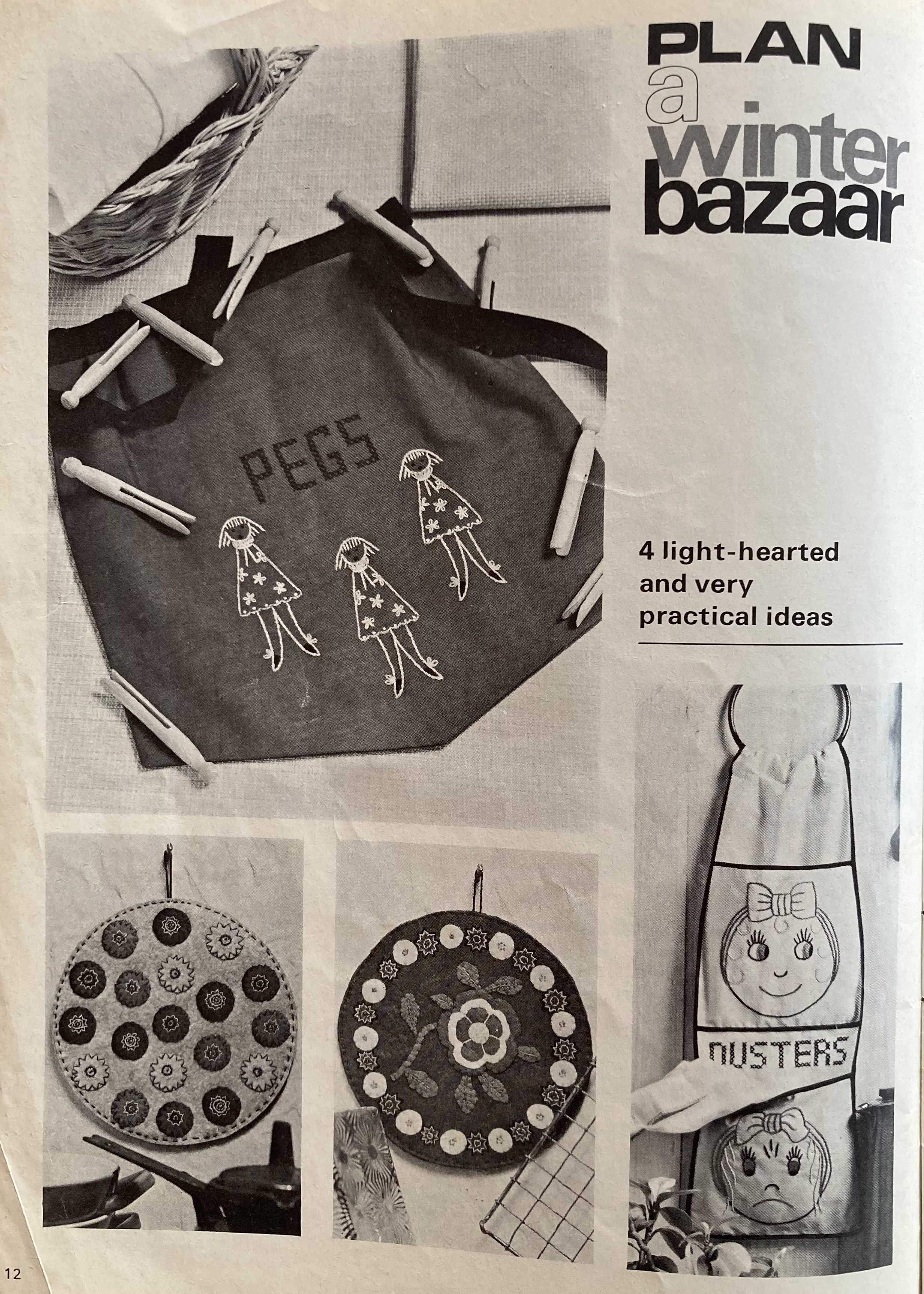 Other home and personal accessories fall under the categories of “Knitted Gifts” or the ever-present “Bazaar Items”, starting with a pretty bed-jacket worn by the Stitchcraft model who models all the bed-jackets. And if you look at any of her photos, you will know why! No other model perfects the come-hither look like she does. The resulting offspring will appreciate a cute stuffed monkey or giraffe toy. I like how the giraffe’s pattern is embroidered on, even if it doesn’t look quite accurate to a real giraffe. Finally, you can make a simple and cheerful sewn and embroidered laundry peg bag, dusting cloth bag with pockets for “clean” (happy!) and “dirty” (sad!) or a set of felt-appliqué pot holders.