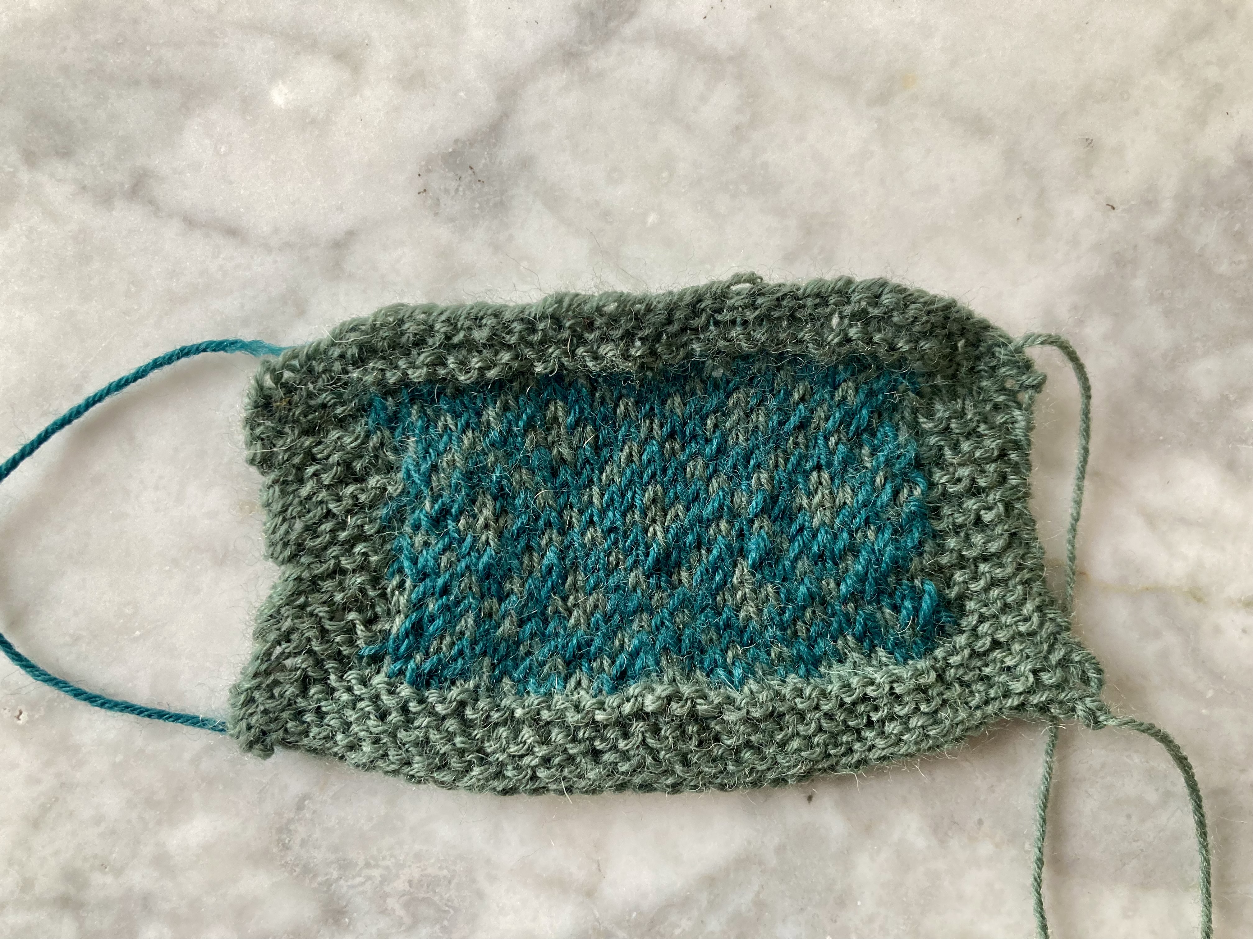 I was happy with my colour choices. My olive green is a little more grey than the Stitchcraft version, and my jade green more blue (but still a little more green than it looks in the photo). I was not prepared for how very blue it looks when knitted up in pattern, but it’s fine with me.