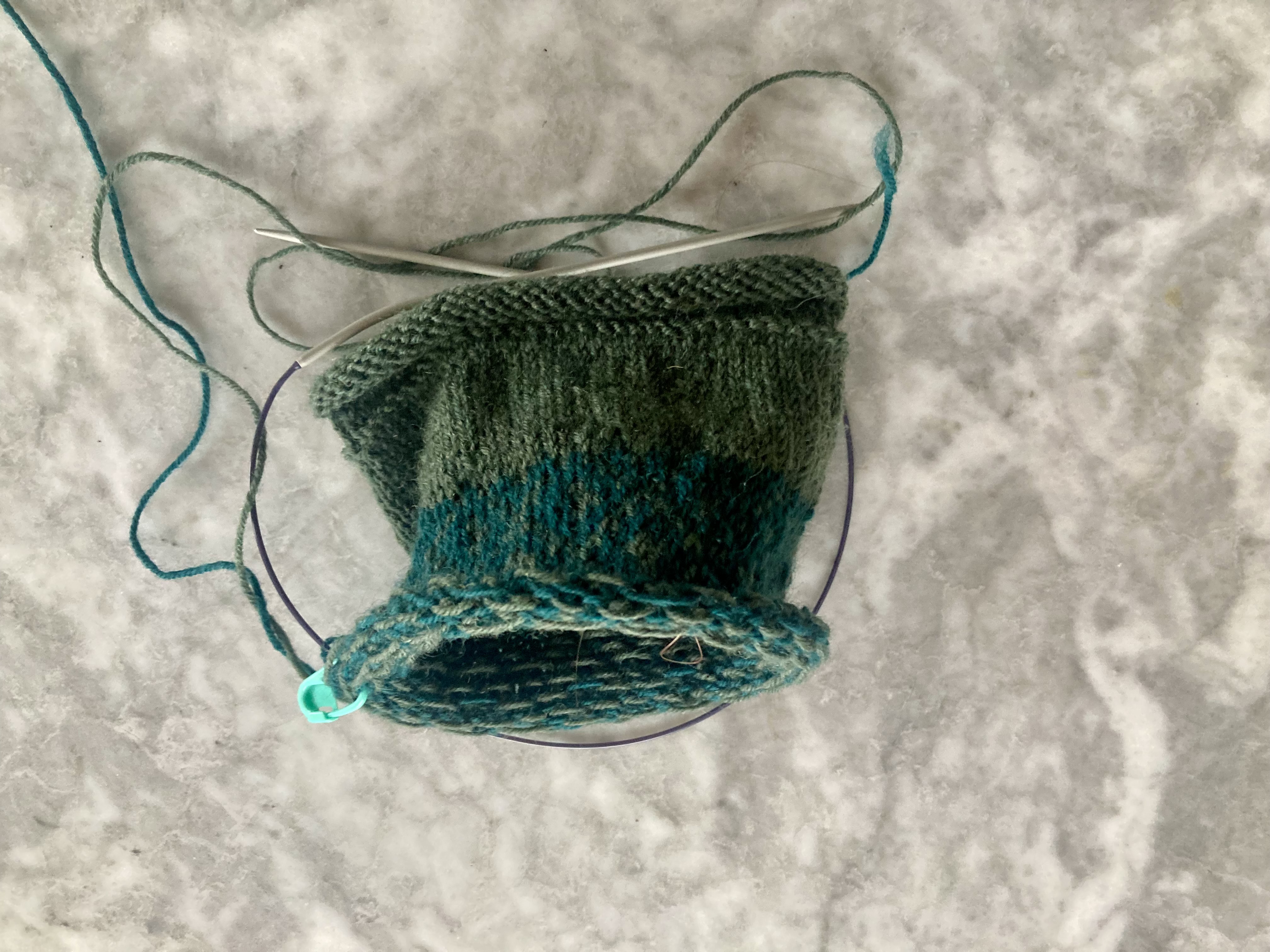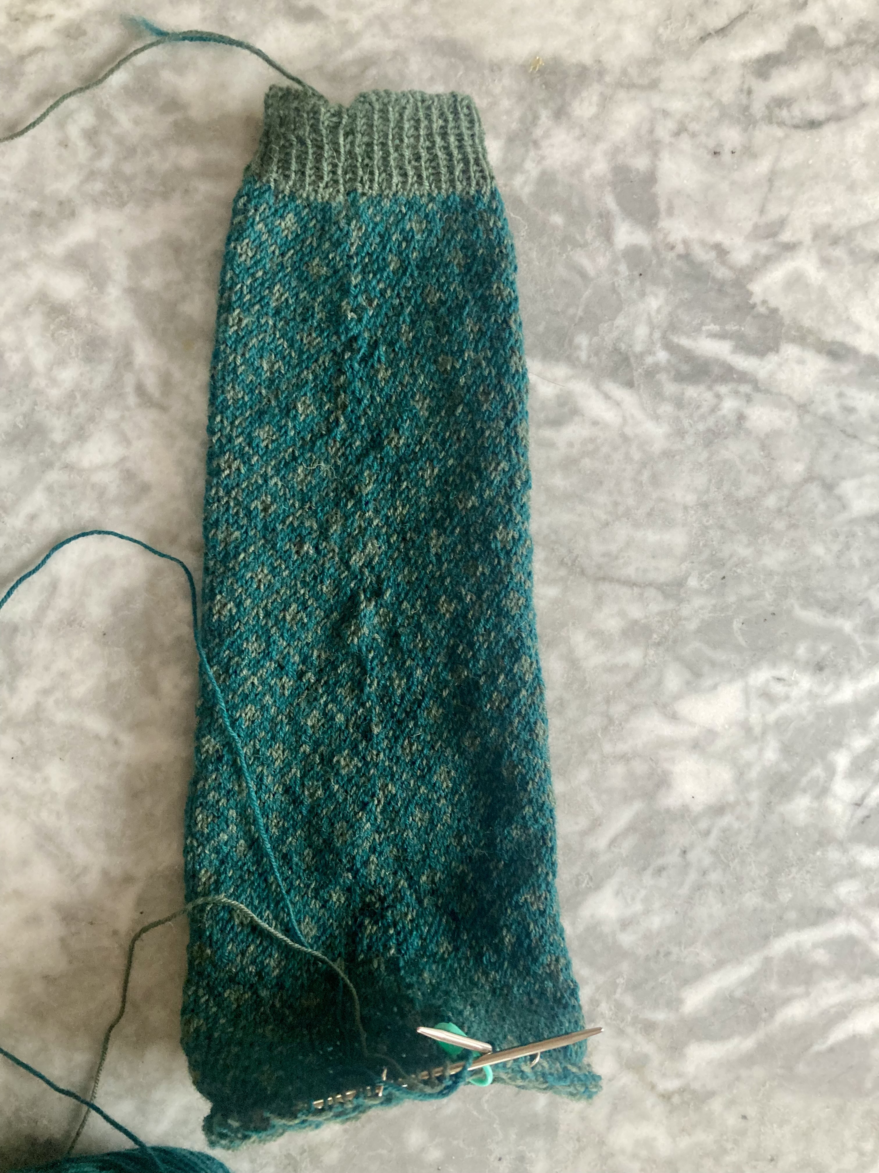 I started the sleeve the first time with the hem as written, and didn’t like it — the transition from hem to pattern wasn’t smooth. I started over and got to halfway up the arm while wondering why it was so narrow. Suprise, I had been doing the increases wrong. Started over and did them right, and the fit was perfect.