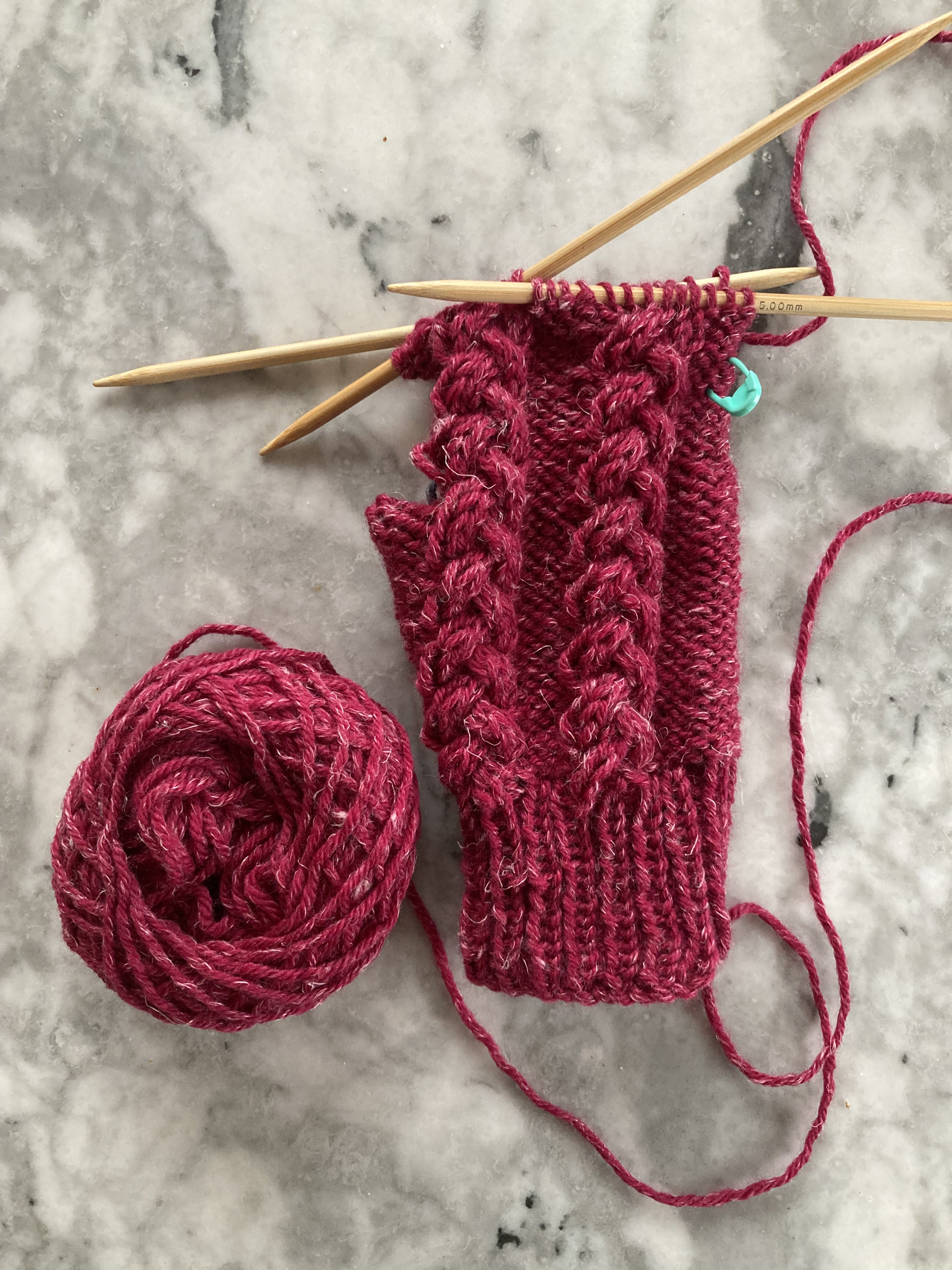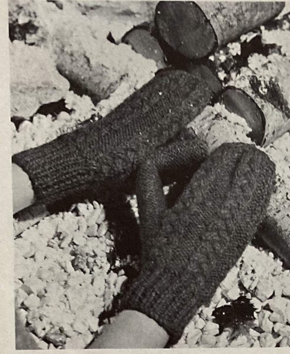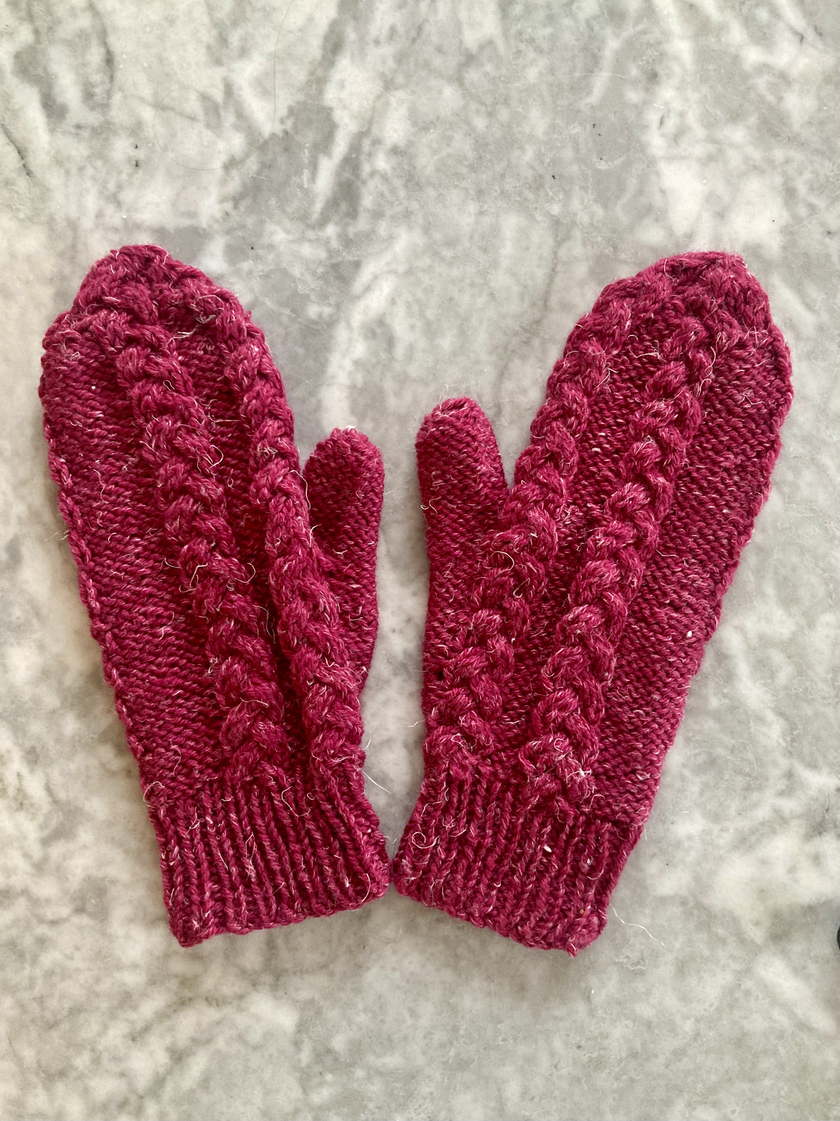 The pattern is intended to be knitted flat from the wrist ribbing to the fingertips and then seamed up on one side. There is a thumb gusset and you are supposed to knit the thumb (flat) at the point where the thumb starts, then go back and finish the hand, picking up stitches that were cast on on the left or right side of the gusset to shape for the right or left hand. I made everything in the round and finished the hand before knitting the thumb (also in the round.) That made the gloves basically identical, but I found a way to finesse the thumb pick-up stitches to make the thumbs lie slightly differently for the right and left mitten. The pattern itself is four regular 6-stitch cables on a background of reversed stocking-stitch.