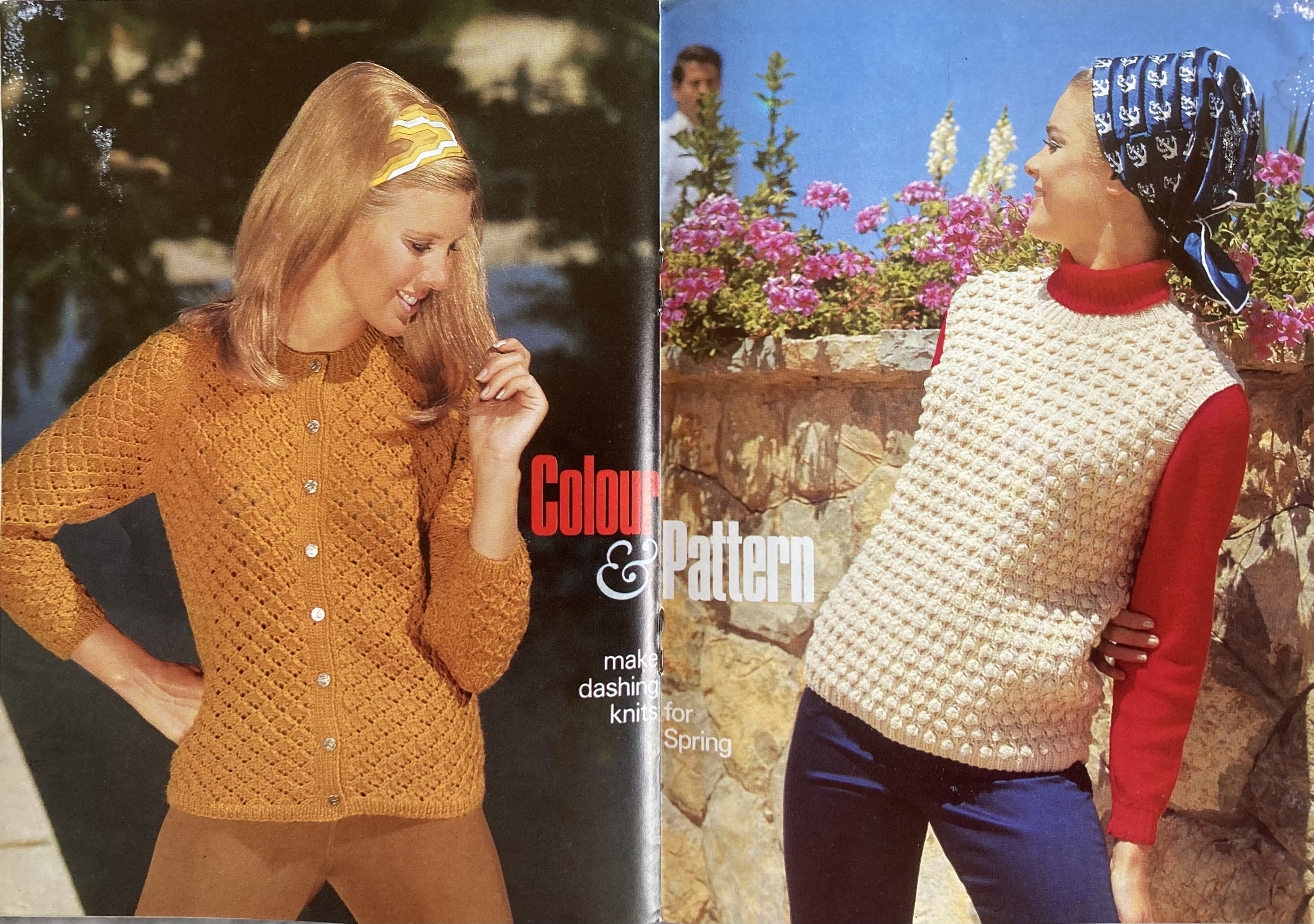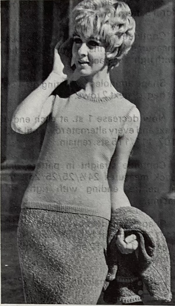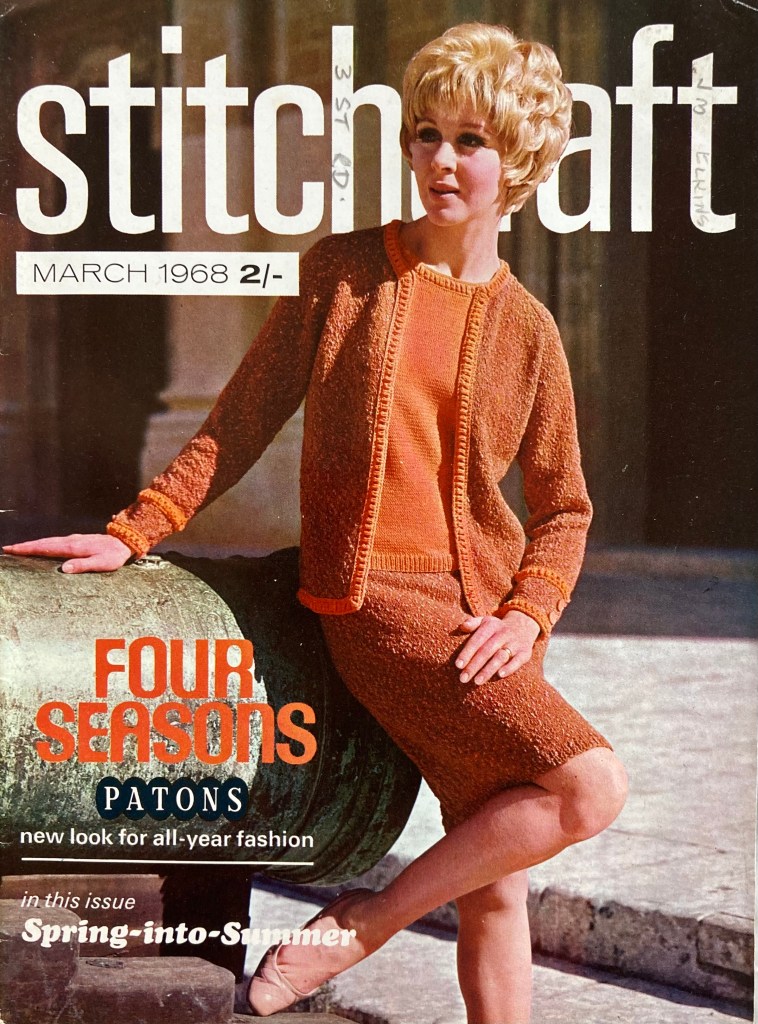 Spring is here and the March 1968 issue of Stitchcraft celebrated by introducing a new yarn: Patons “Four Seasons“. Four Seasons was a crinkly, nubbly mix of synthetic fibres (59%) and wool (41%) that produced a textured, tweedy effect by virtue of the “nubs” being a different colour than the rest of the yarn. It was double-knitting thickness when knit up and produced an interesting colour and texture even in plain stocking-stitch, so was perfect for making simply styled garments quickly.