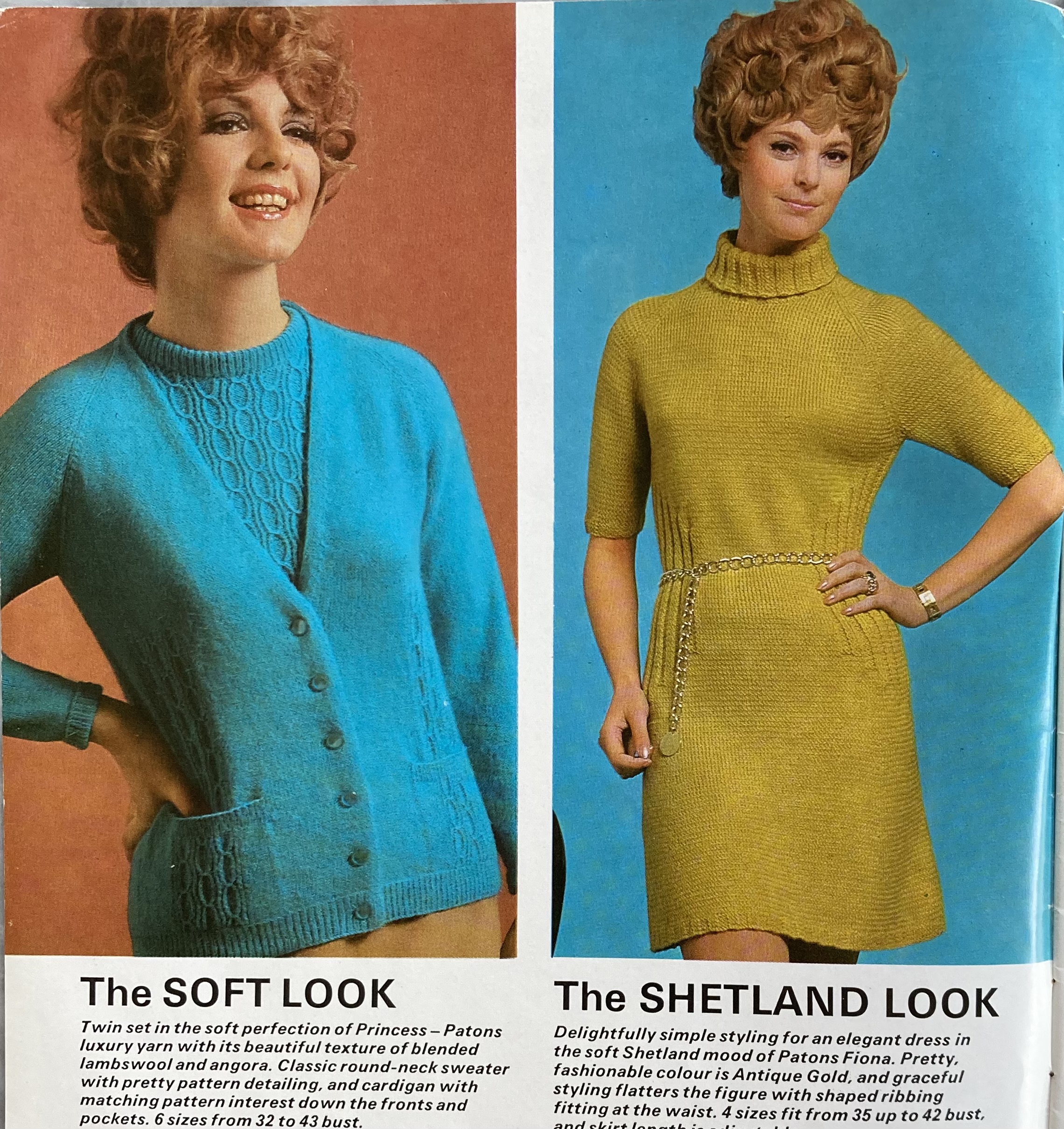 Other women’s fashions include a twin-set in Patons’ almost-new yarn, “Princess“, a soft, fluffy wool-angora mix. The colour photos on the inside front cover contrast the “Soft Look” (Princess) with the “Shetland Look” (Patons “Fiona“, a mix of 51% Shetland wool and 49% acrylic) while also making great use of blue-orange-mustard contrasts. Also, amazing wig on that model in the mustard-coloured dress! The “soft misty mood of the traditional Shetland look” gets exploited for all its worth in a pretty, but very much not traditional Shetland-style graded-colour pullover.