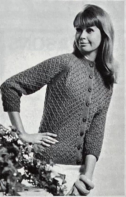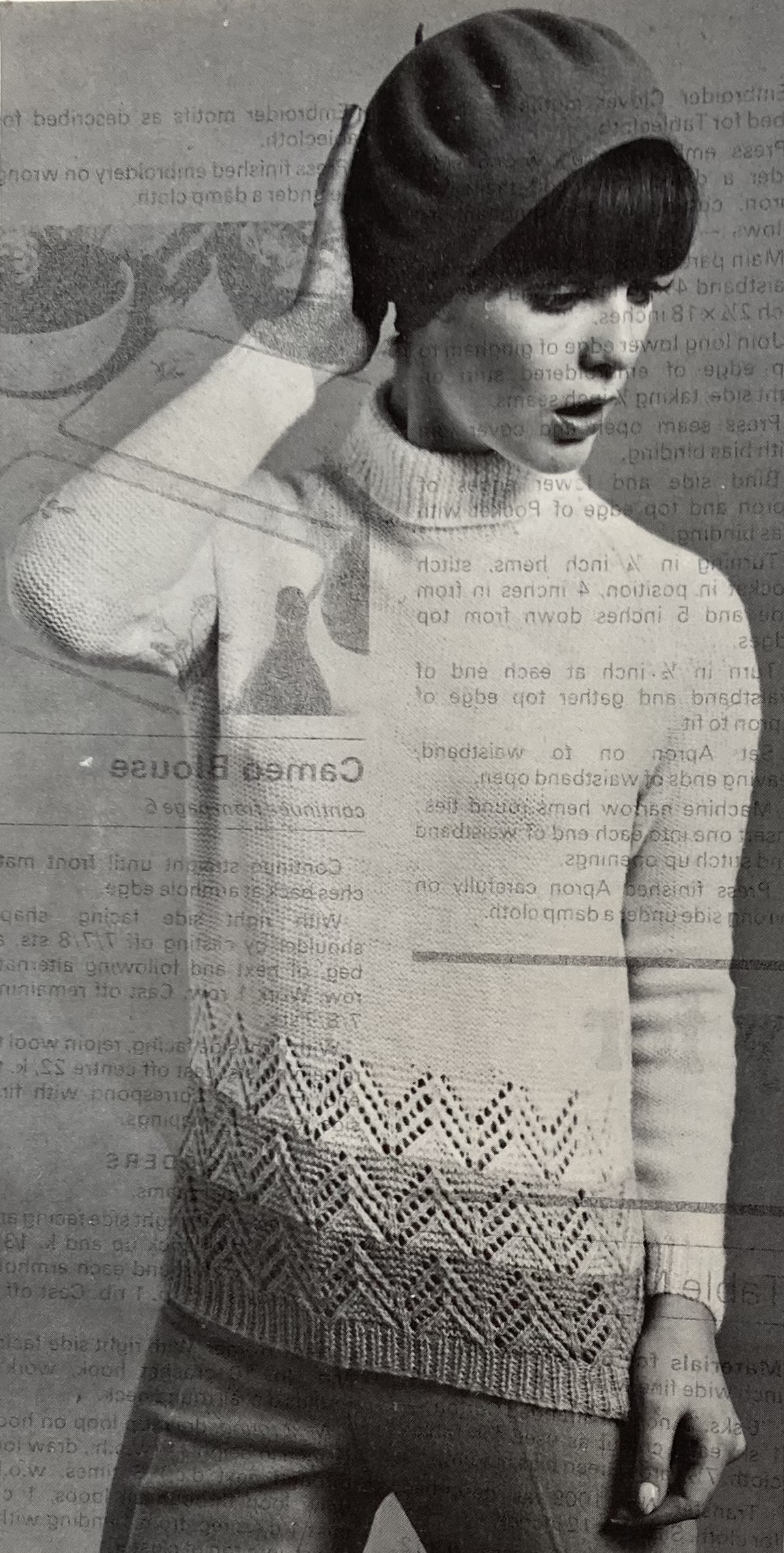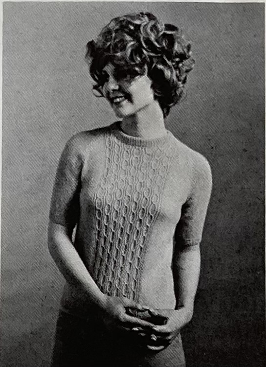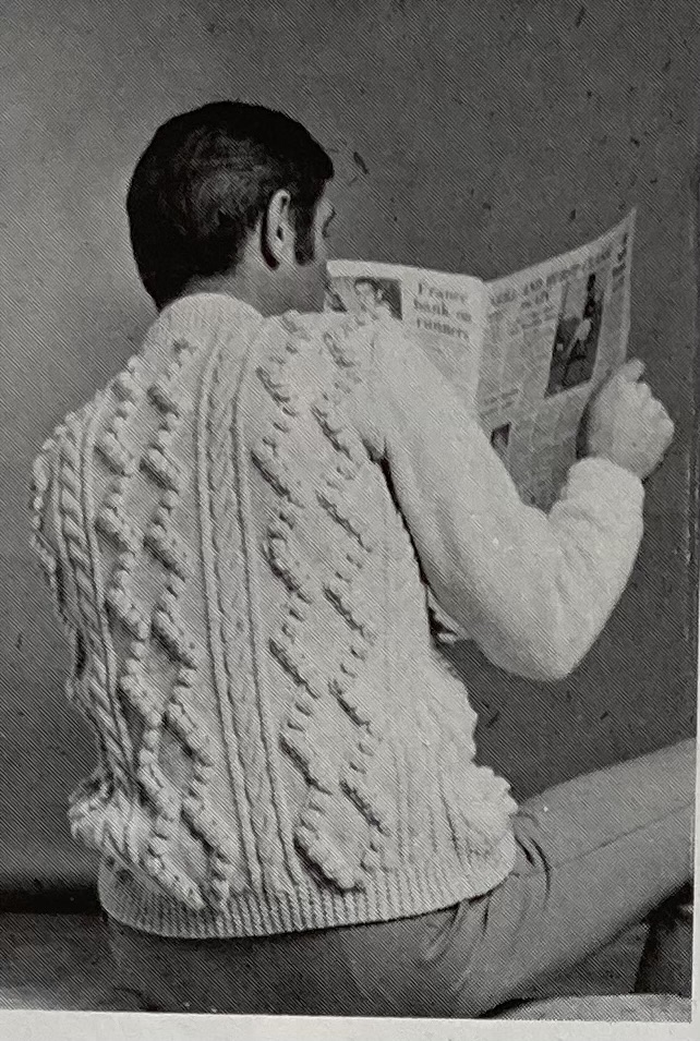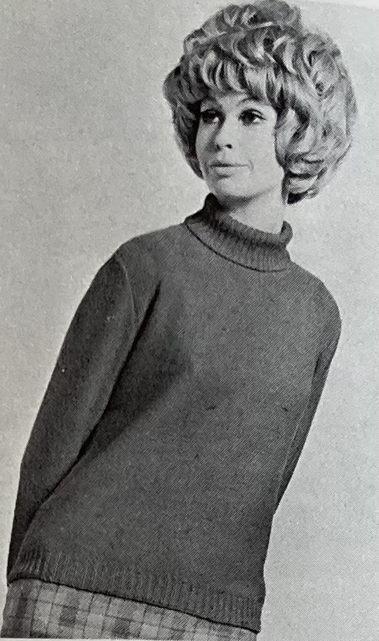 There’s more! The “overpull” in bramble stitch has a great three-dimensional texture, as does the high-buttoned cardigan in a trellis lace pattern. Knitters who preferred the smooth and simple look could make a classic, loose-fitting polo-neck jumer. All three are in tried-and-true Patons 100% wool yarns: the classic jumper in Cameo Crepe, the overpull in Totem Double Crepe, and the cardigan in Patons Double Knitting. That 1960s diagonal-line photography becomes amusingly apparent when you place photos next to each other.
