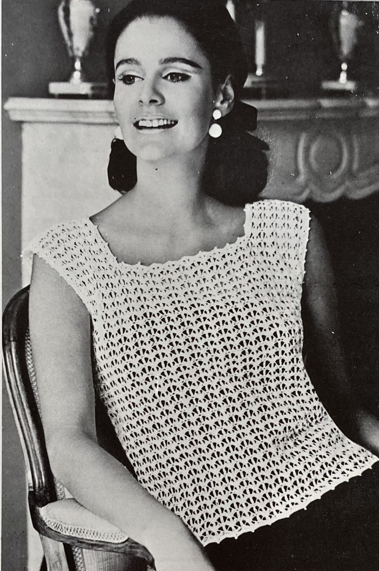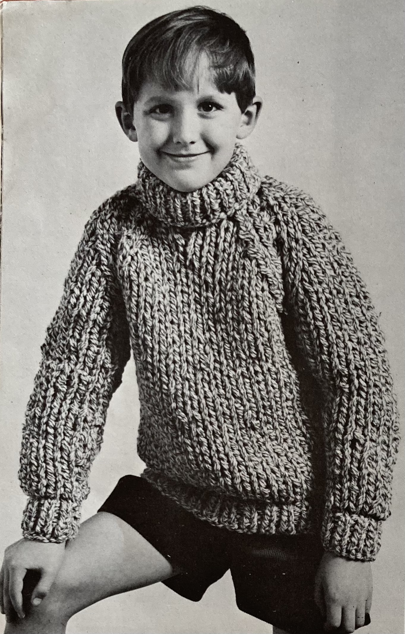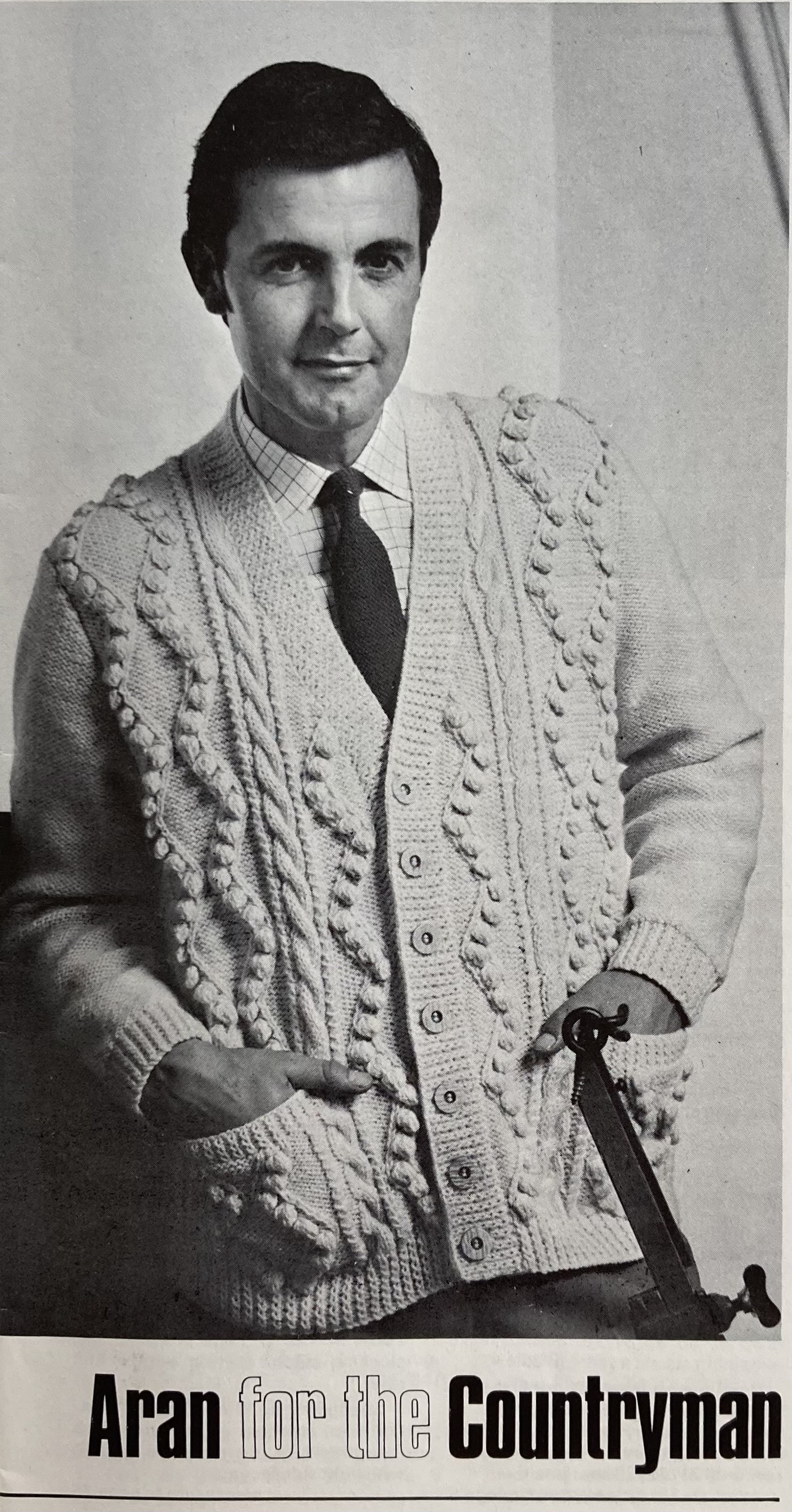 There’s more! The “overpull” in bramble stitch has a great three-dimensional texture, as does the high-buttoned cardigan in a trellis lace pattern. Knitters who preferred the smooth and simple look could make a classic, loose-fitting polo-neck jumer. All three are in tried-and-true Patons 100% wool yarns: the classic jumper in Cameo Crepe, the overpull in Totem Double Crepe, and the cardigan in Patons Double Knitting. That 1960s diagonal-line photography becomes amusingly apparent when you place photos next to each other.
