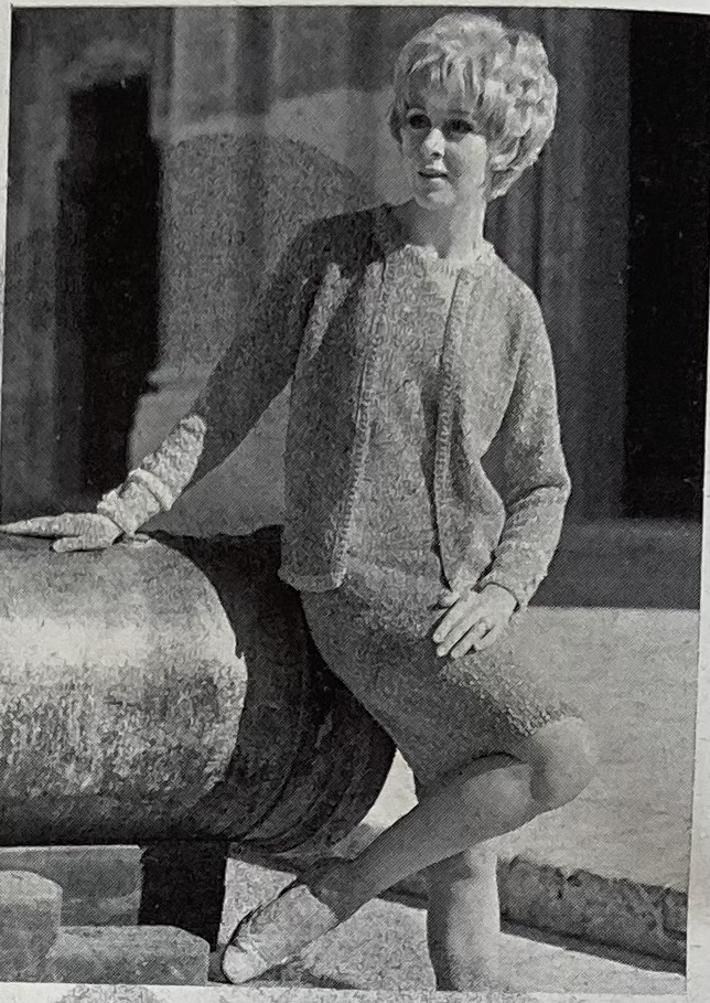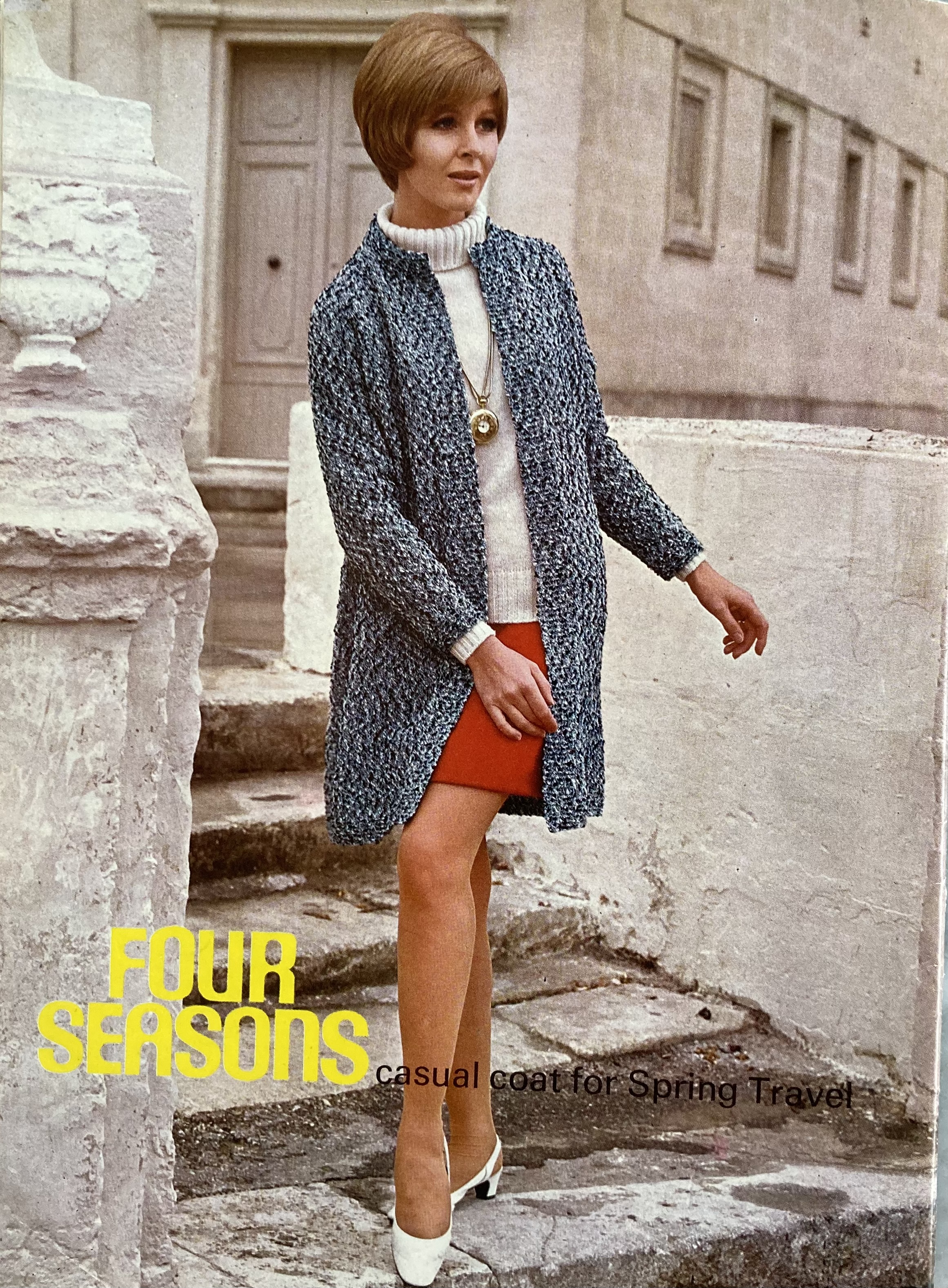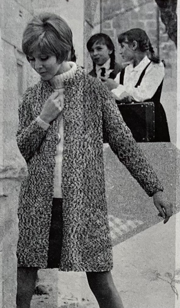 The simply designed, next-to-no shaping “Chanel Style” suit on the cover (Stitchcraft’s name for it, not mine, and shows how iconic the Chanel suit was) is made in plain stocking-stitch with Four Seasons and trimmed with an interesting crochet braid in plain wool “Cameo Crepe” yarn. You can see how Patons coordinated the Four Seasons colour palette to make it match with the plain wool yarns already in production. The matching sleeveless blouse is also made in the same shade of Cameo Crepe. The equally simply-knit travel coat in Four Seasons goes well over a plain jumper and mini-skirt.